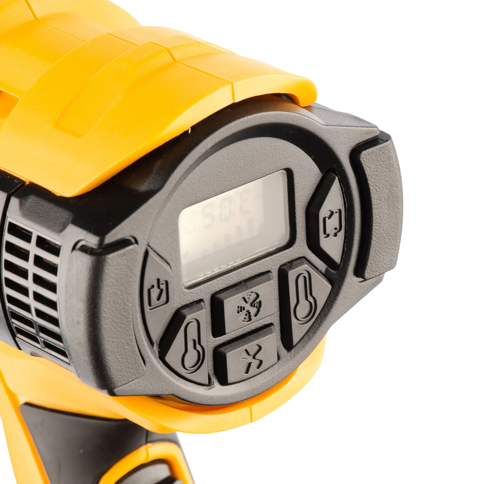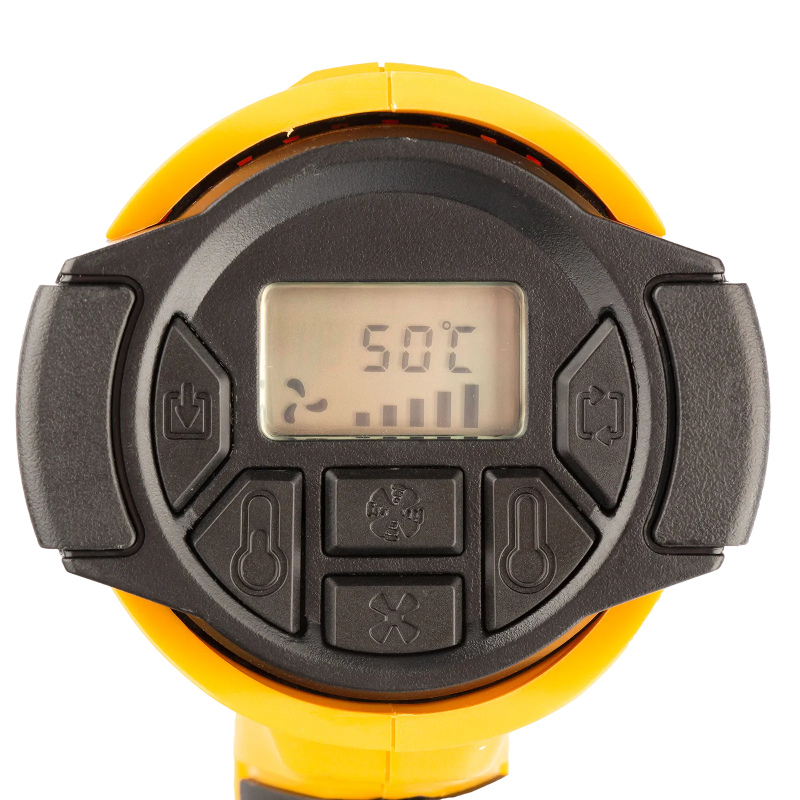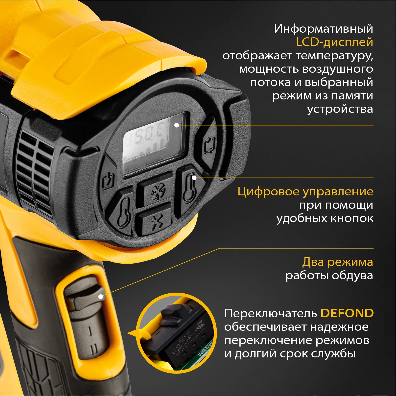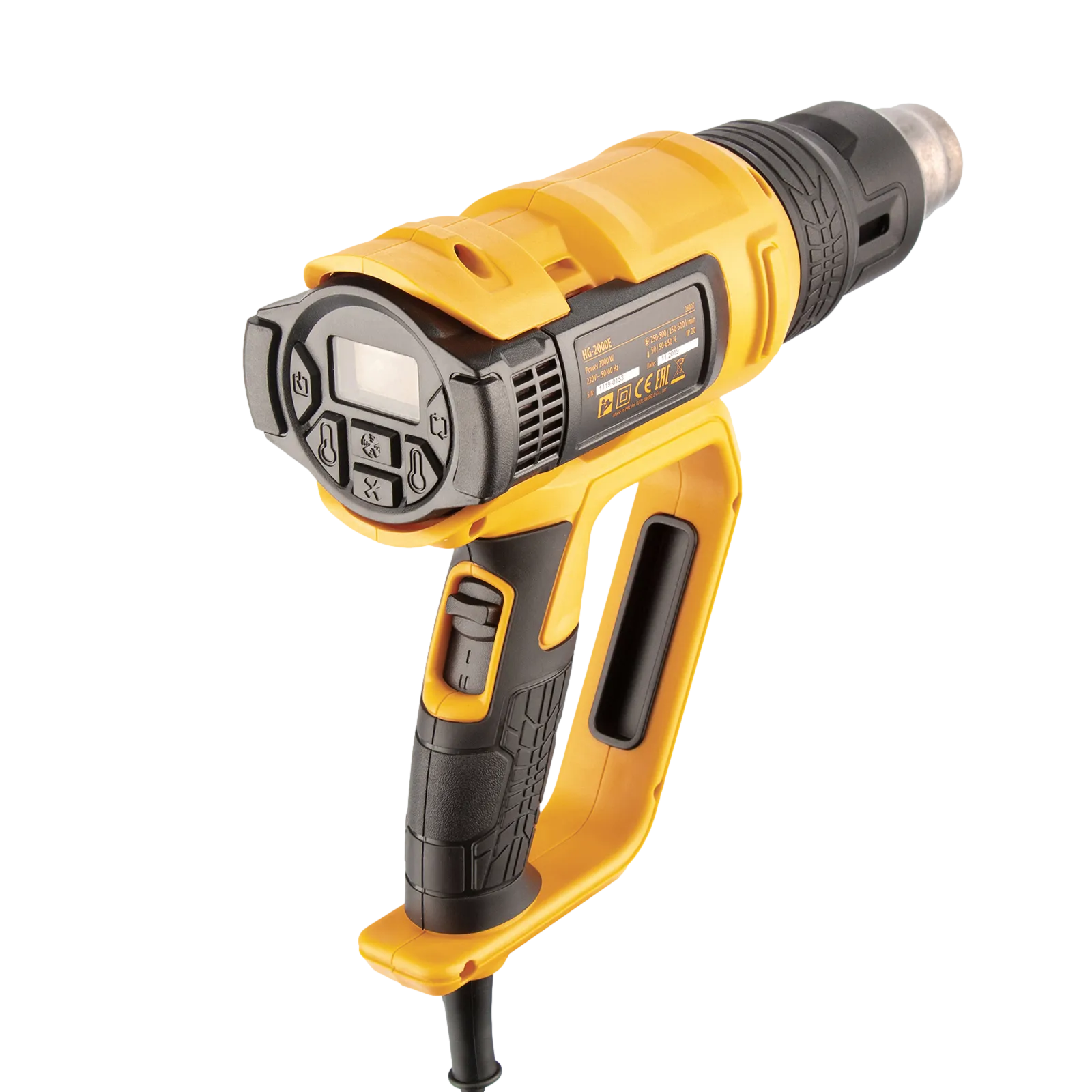 Профессиональный технический фен Denzel HG-2000E 28007 мощностью 2000 Вт, с 2 режимами и LCD дисплеем, предназначен для нагрева и сушки различных соединений и поверхностей. Применяется при снятии лакокрасочных покрытий, удалении старого линолеума и плитки, пайке металла и сварке пластика, разморозке труб, а также в процессе других задач в быту и на строительных объектах.;Высокая мощность двигателя 2 кВт обеспечивает производительность 250-500 л/мин. Максимальная рабочая температура составляет 650 ℃. Надежный и долговечный нагревательный элемент с керамическим каркасом устойчив к продолжительной эксплуатации.