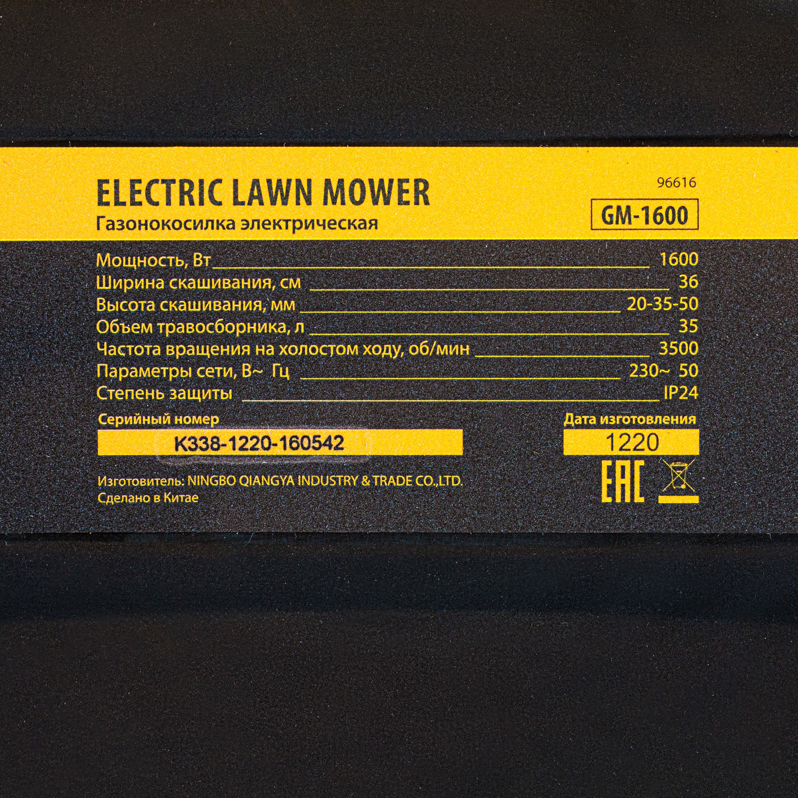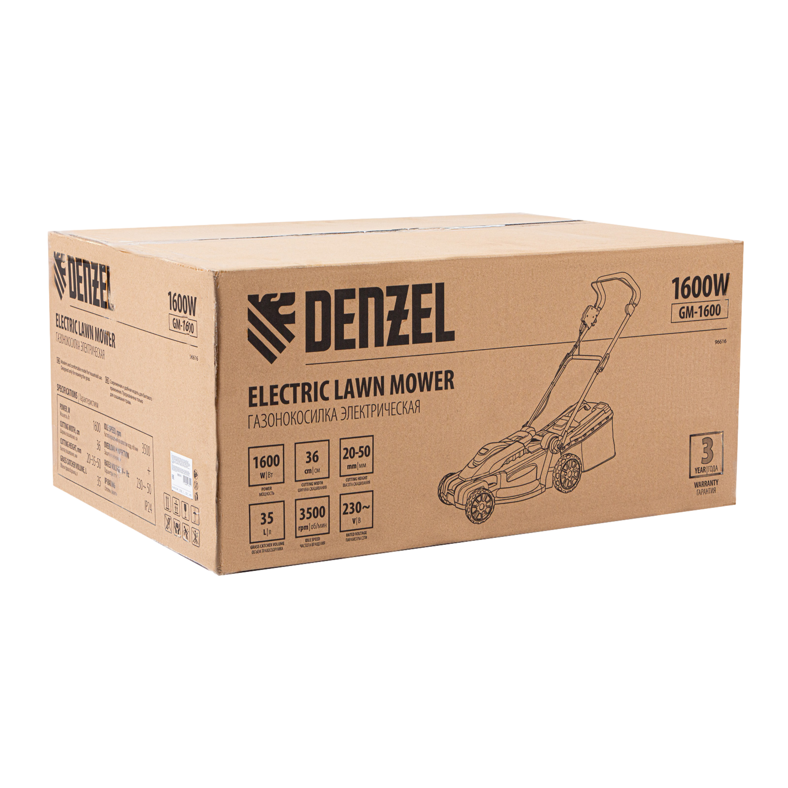 Электрическая газонокосилка Denzel GM-1600 96665 с 3 уровнями скашивания и травосборником на 35 л — маневренная и простая в управлении техника, обеспечивающая ширину скашивания 96 см. Быстро справляется с работой на небольшом участке площадью примерно 4 сотки, помогает оформлять аккуратный газон на дачном участке. Для достижения наилучшего результата предусмотрено 3 уровня скашивания травы: 20 мм, 35 мм и 50 мм.;Косилка не требует особых навыков и сложного технического обслуживания — не нужно менять масло и свечи, заливать и сливать бензин, долго заводить и прогревать двигатель. Электродвигатель мощностью 1600 Вт работает тихо и без вредных выхлопов, он экологичен и экономичен.