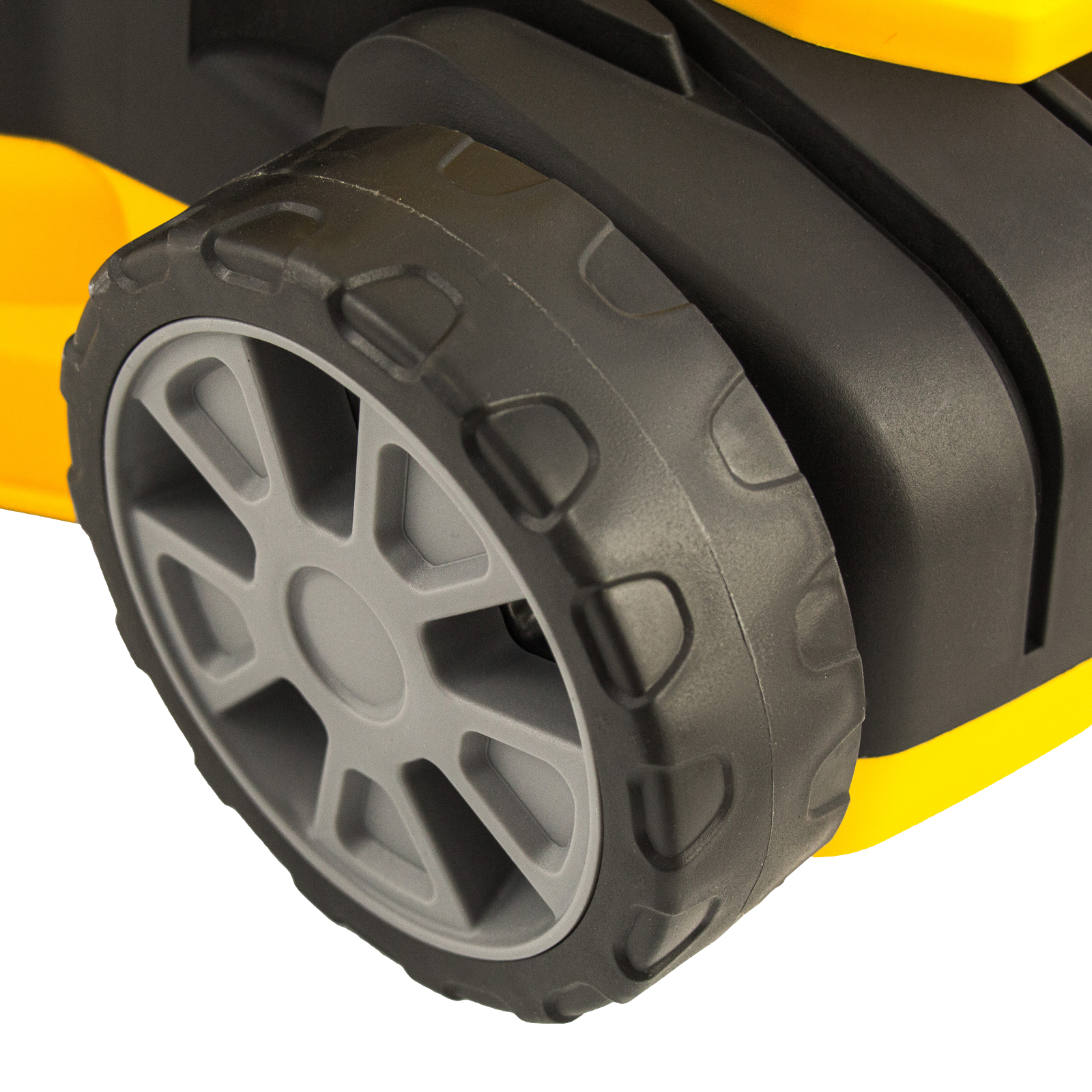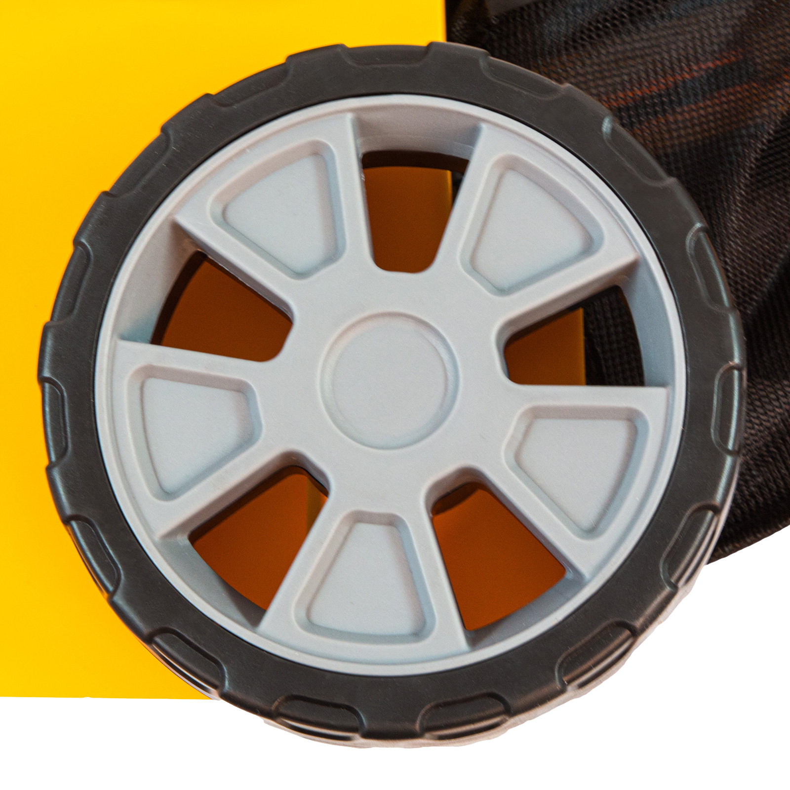 - Маневренность — широкие колеса позволяют удобно перемещать газонокосилку по участку и не приминают траву.