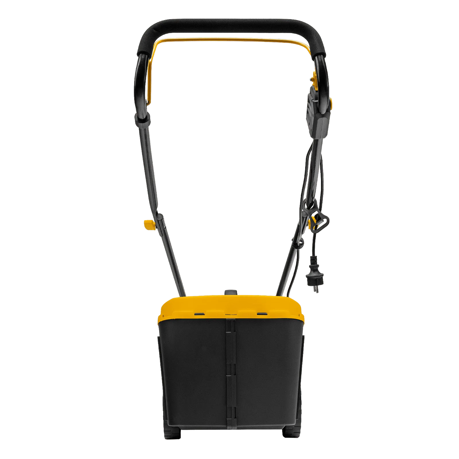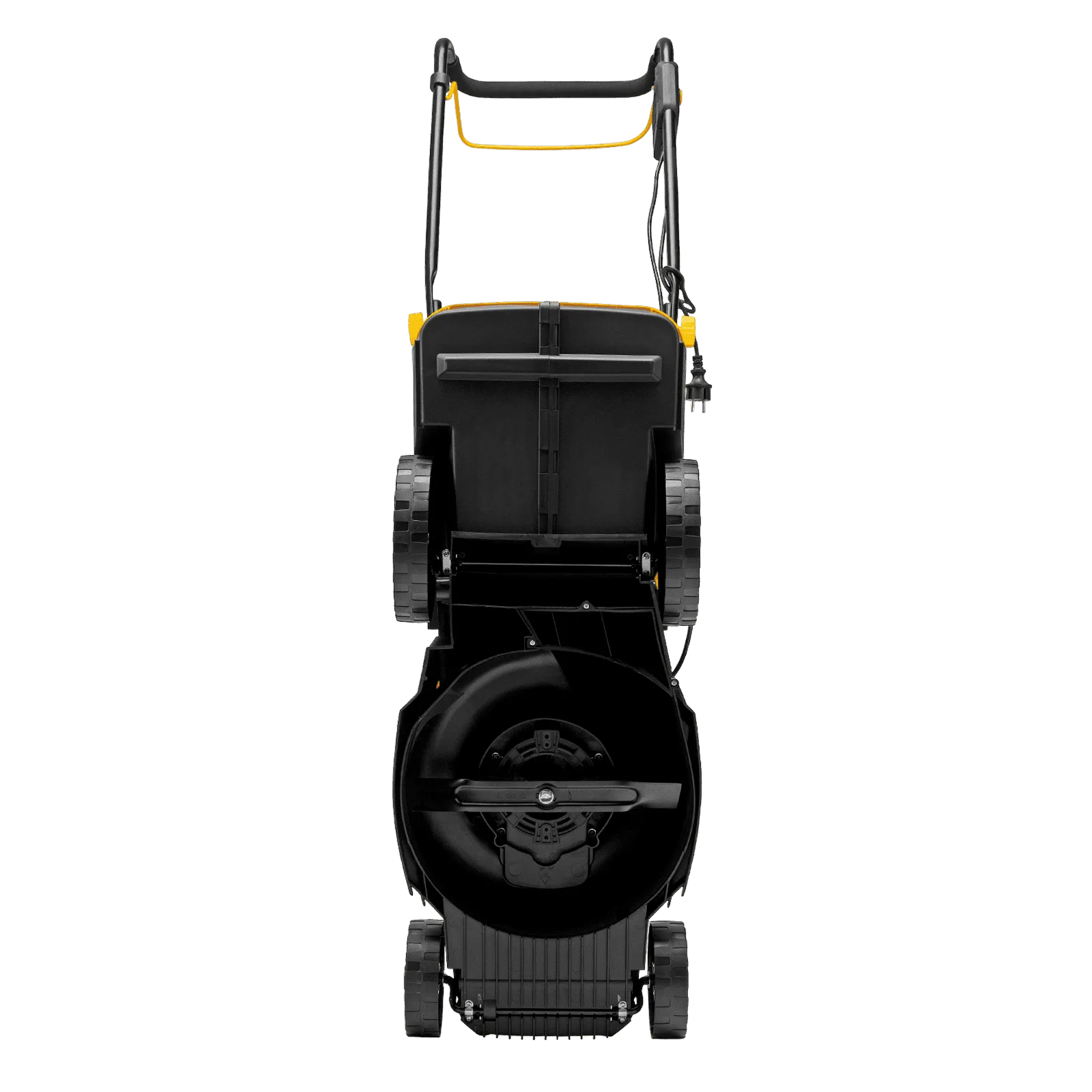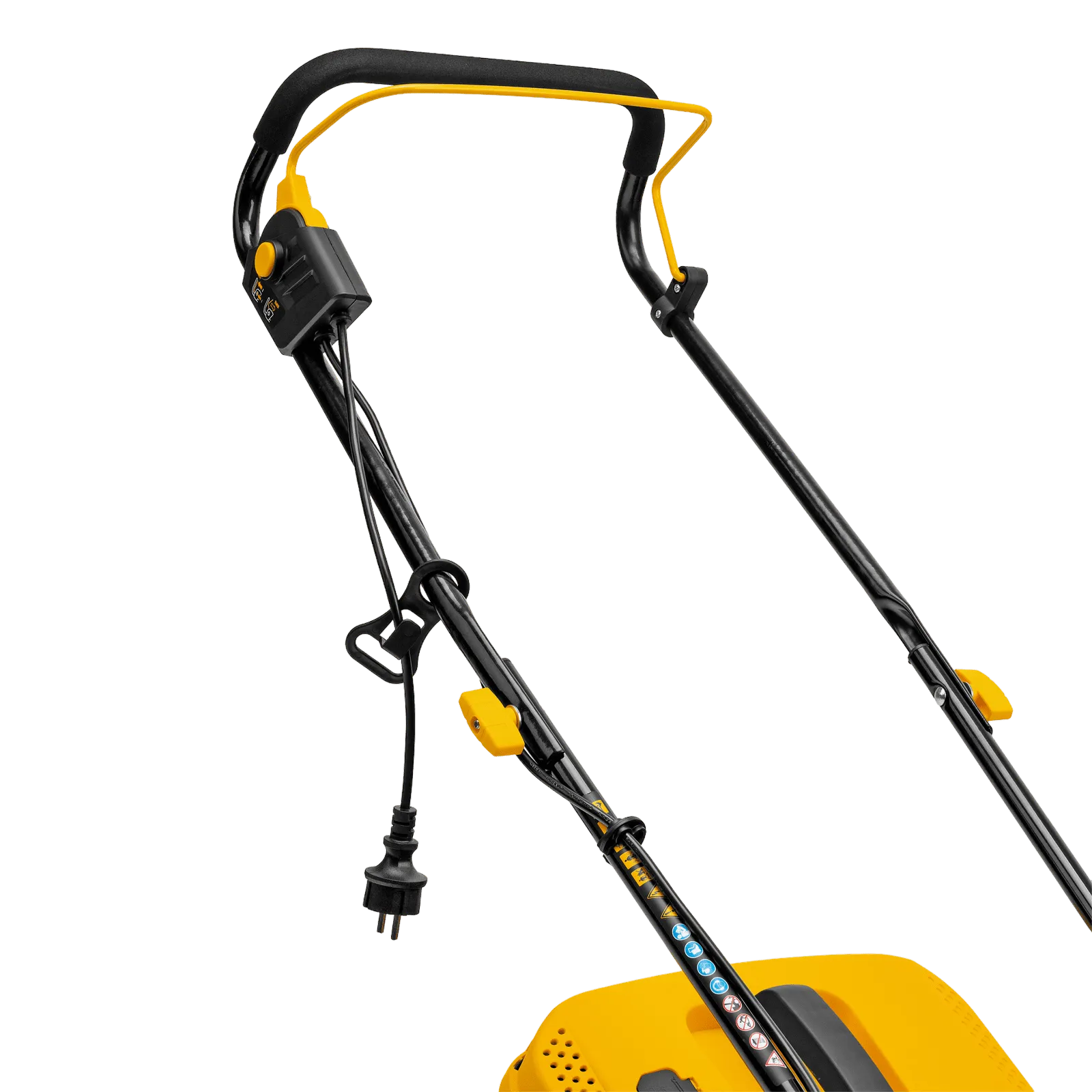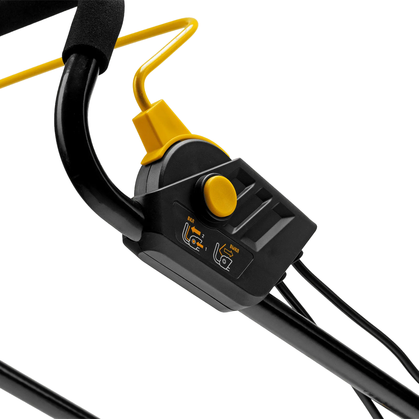 - Безопасность — функция блокировки исключает случайный запуск двигателя, а держатель кабеля предотвращает отключение техники от сети и уменьшает риск попадания провода под нож.