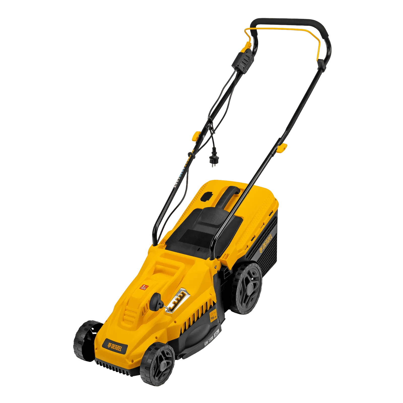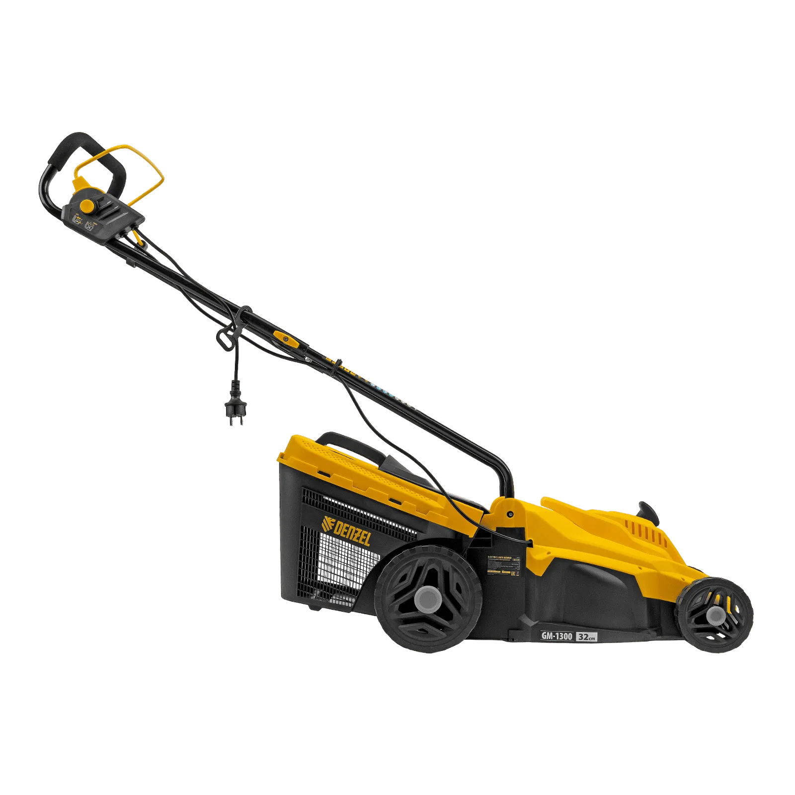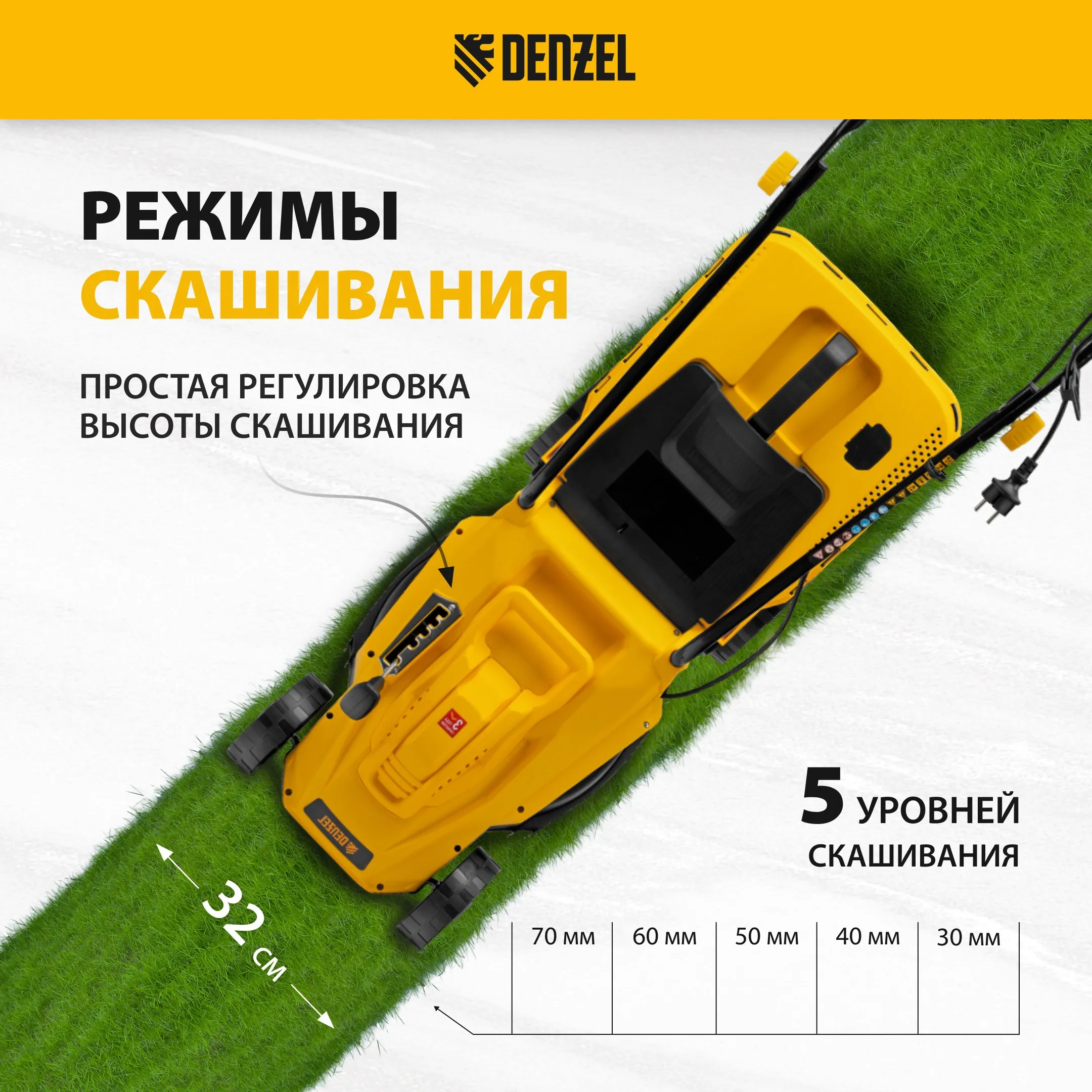 Газонокосилка электрическая Denzel GM-1300 96627 мощностью 1300 Вт, с травосборником объемом 35 л и 5 уровнями скашивания, обеспечивает ширину прохода 32 см и предназначена для стрижки газонов, кошения травы в саду и на небольшом приусадебном участке. Предусмотрена 5-ступенчатая регулировка высоты скашивания (от 30 до 70 мм) в зависимости от типа газона. Газонокосилка проста в управлении и обслуживании, с ней легко справится неопытный пользователь.
