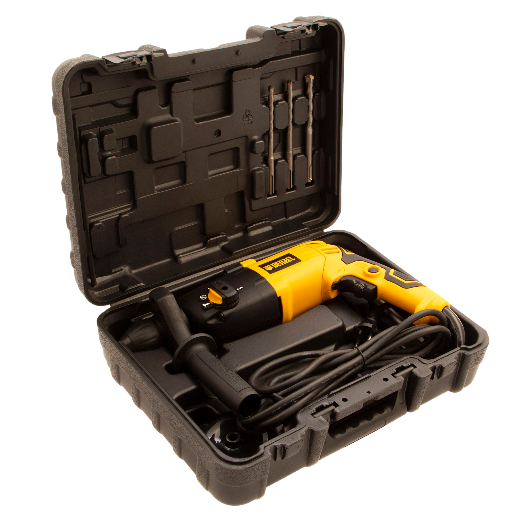 Электрический перфоратор Denzel RH-750-24 26605 мощностью 750 Вт, с патроном под хвостовик SDS-plus, имеет 3 режима, развивает энергию удара 2,5 Дж и используется для проведения отделочных и монтажных работ в режиме сверления, бурения и долбления. Эффективно работает с твердыми материалами. Максимальный диаметр отверстий в бетоне составляет 24 мм, в древесине — 40 мм, металле — 13 мм.