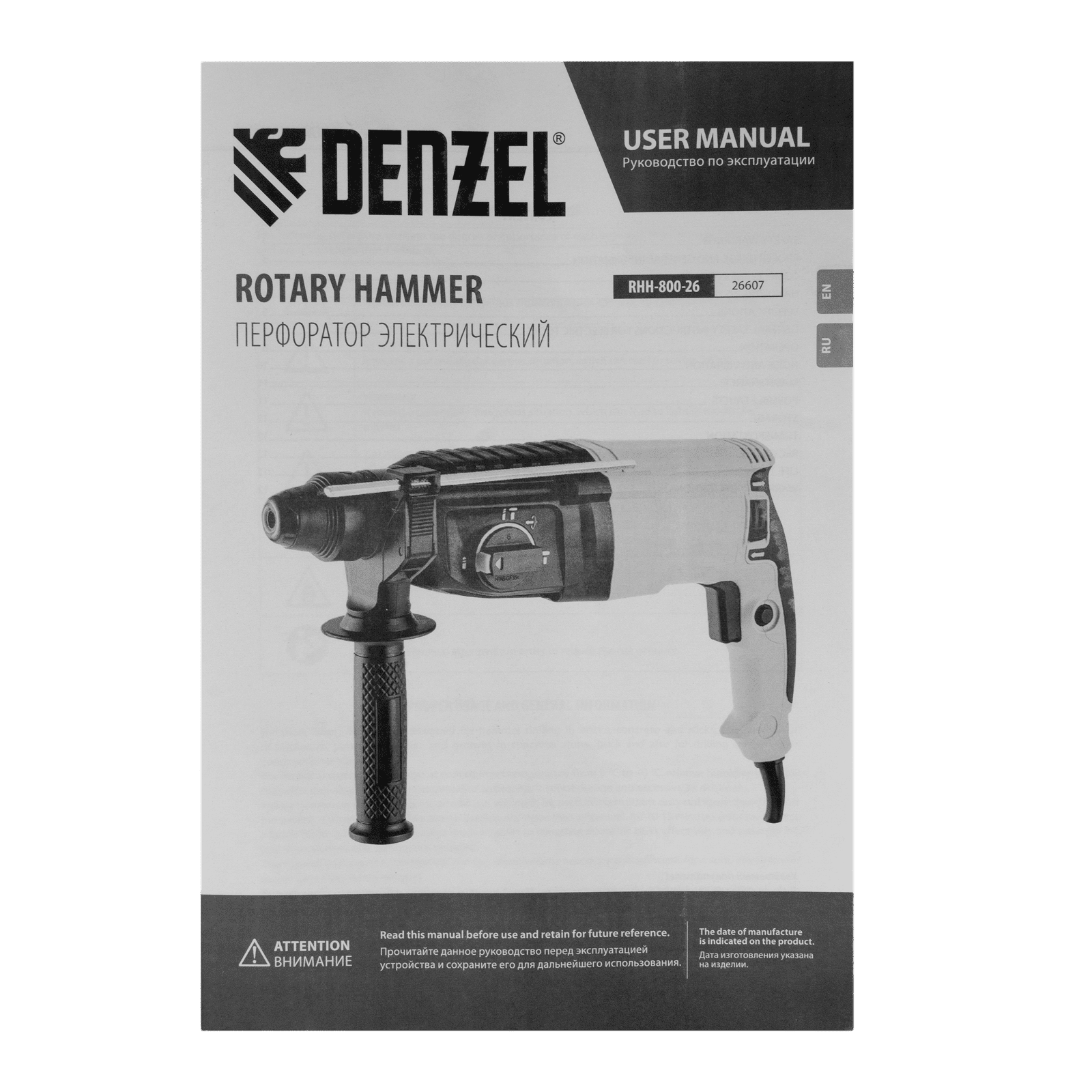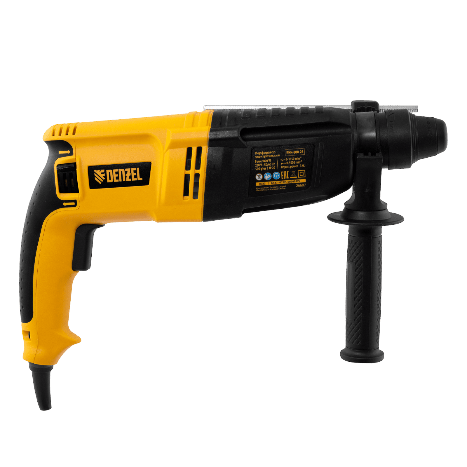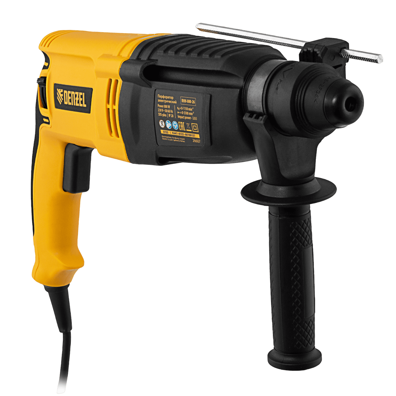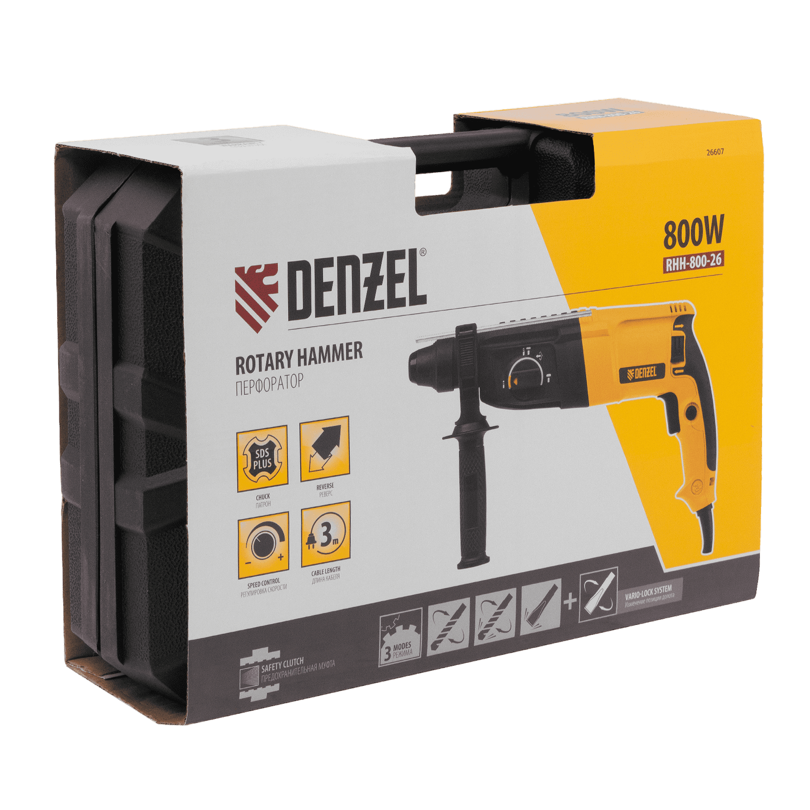 Электрический перфоратор Denzel RHH-800-26 26607 мощностью 800 Вт, с патроном под хвостовик SDS-plus, развивает энергию удара 3 Дж и способен работать в 3-х режимах: сверление, сверление с ударом и долбление + регулировка углового положения оснастки. Используется для получения отверстий в бетоне, камне, кирпичной кладке, штробления стен, а также сверления металла, пластика, древесины и других материалов. Максимальный диаметр сверления в бетоне составляет 18 мм, в древесине — 30 мм, в стали — 13 мм. Инструмент будет полезен любителям и профессионалам при выполнении ремонтно-строительных работ.