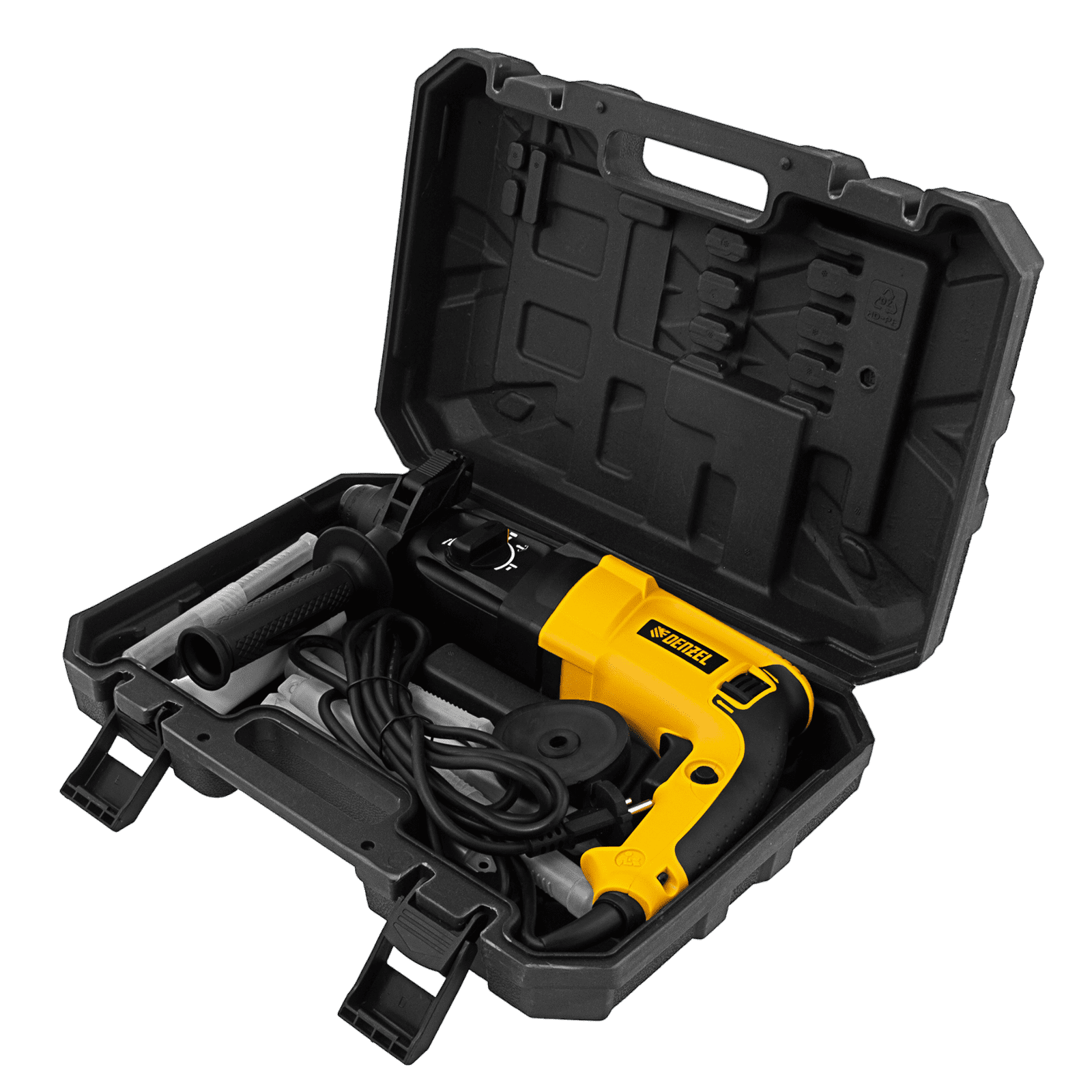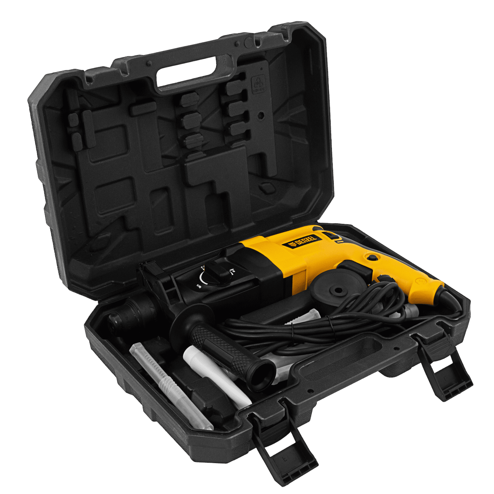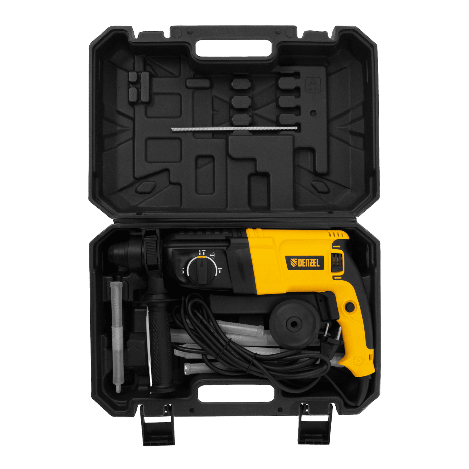- Продуманное хранение и транспортировка — перфоратор с набором оснастки поставляется в надежном пластиковом кейсе.