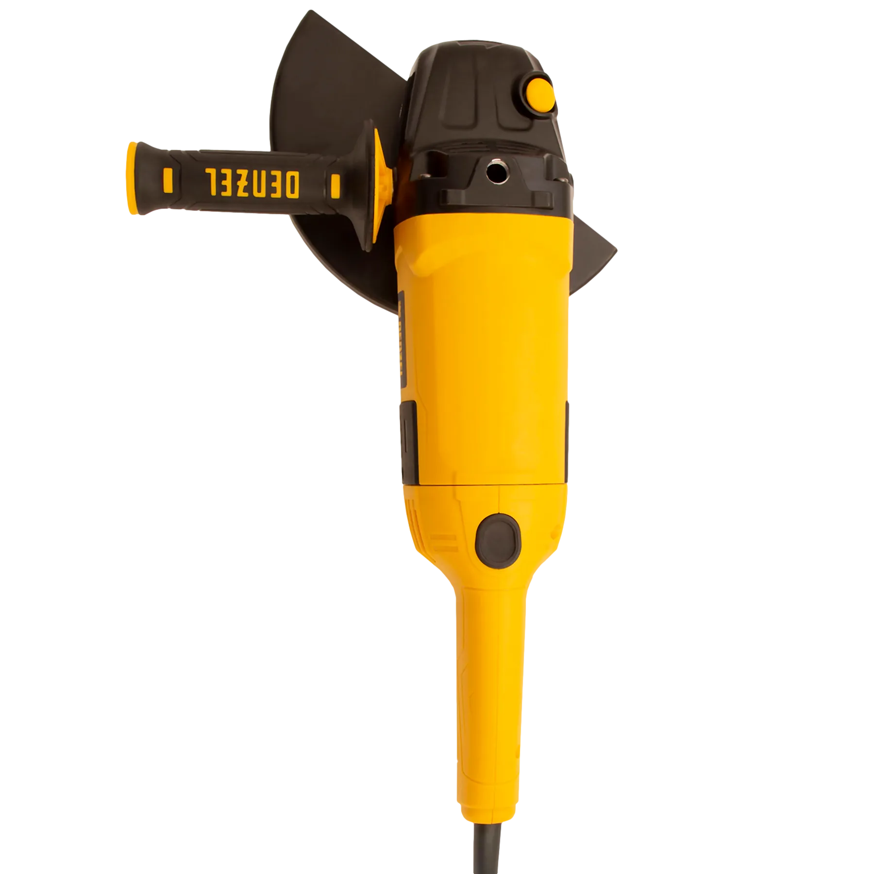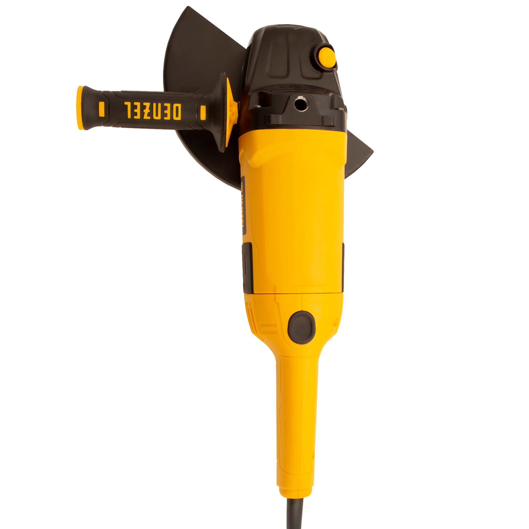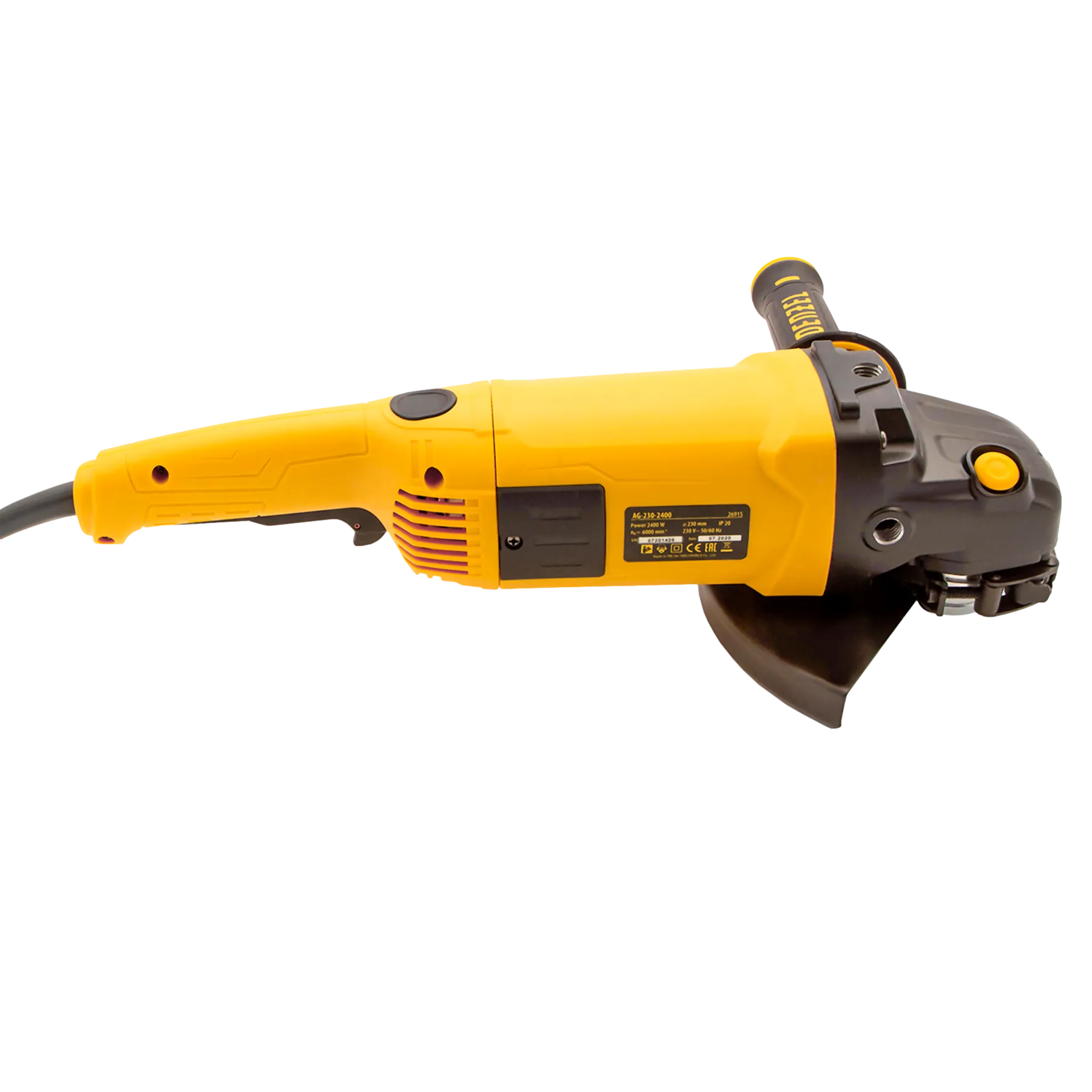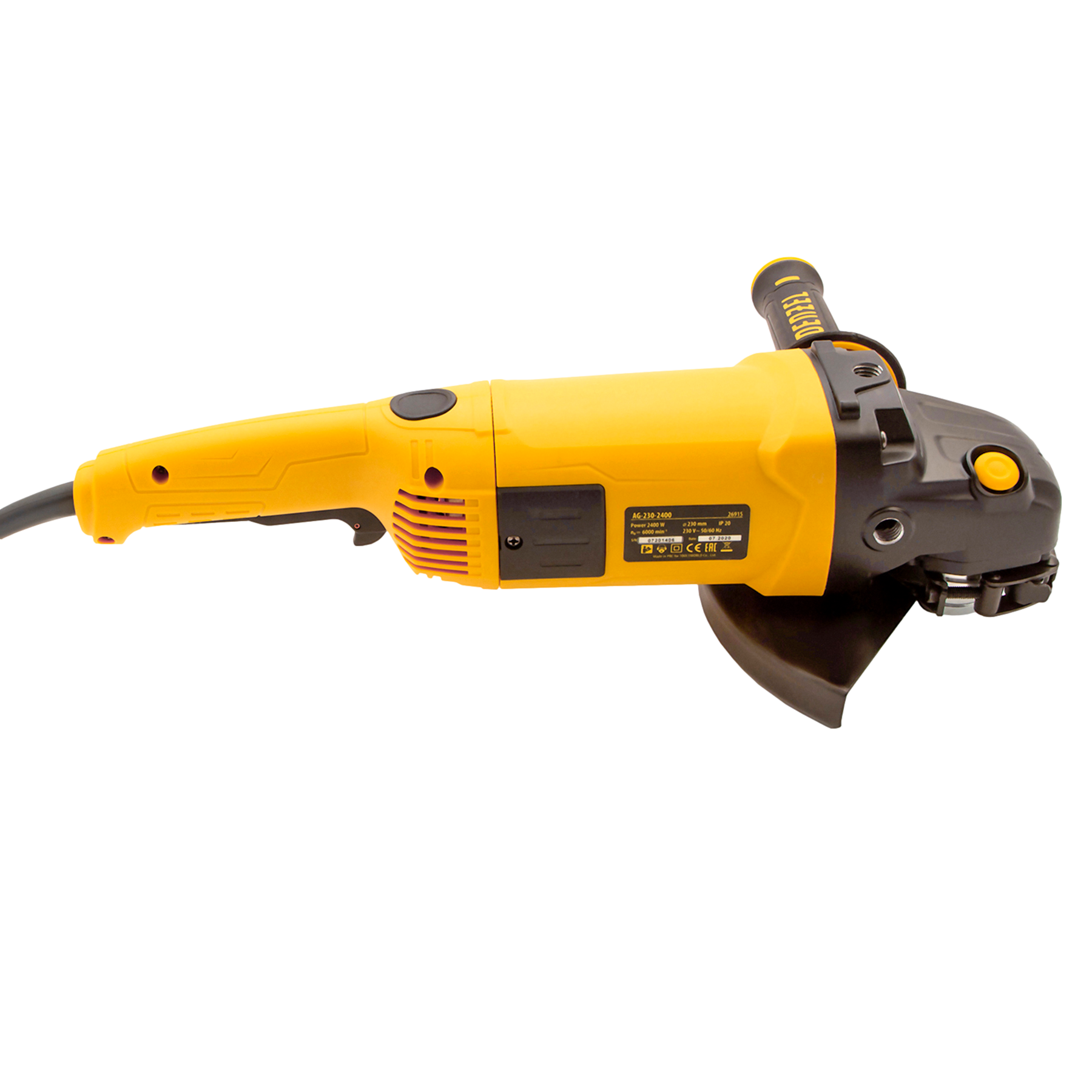 Угловая шлифовальная машина Denzel AG230-2400 26915 мощностью 2400 Вт совместима с насадками максимальным диаметром 230 мм, поддерживает частоту вращения шпинделя 6000 об/мин, благодаря чему эффективно справляется с обработкой и зачисткой поверхностей, а также резкой, шлифовкой металла толщиной до 80 мм и камня. Пригодится дома, в гараже и на даче.