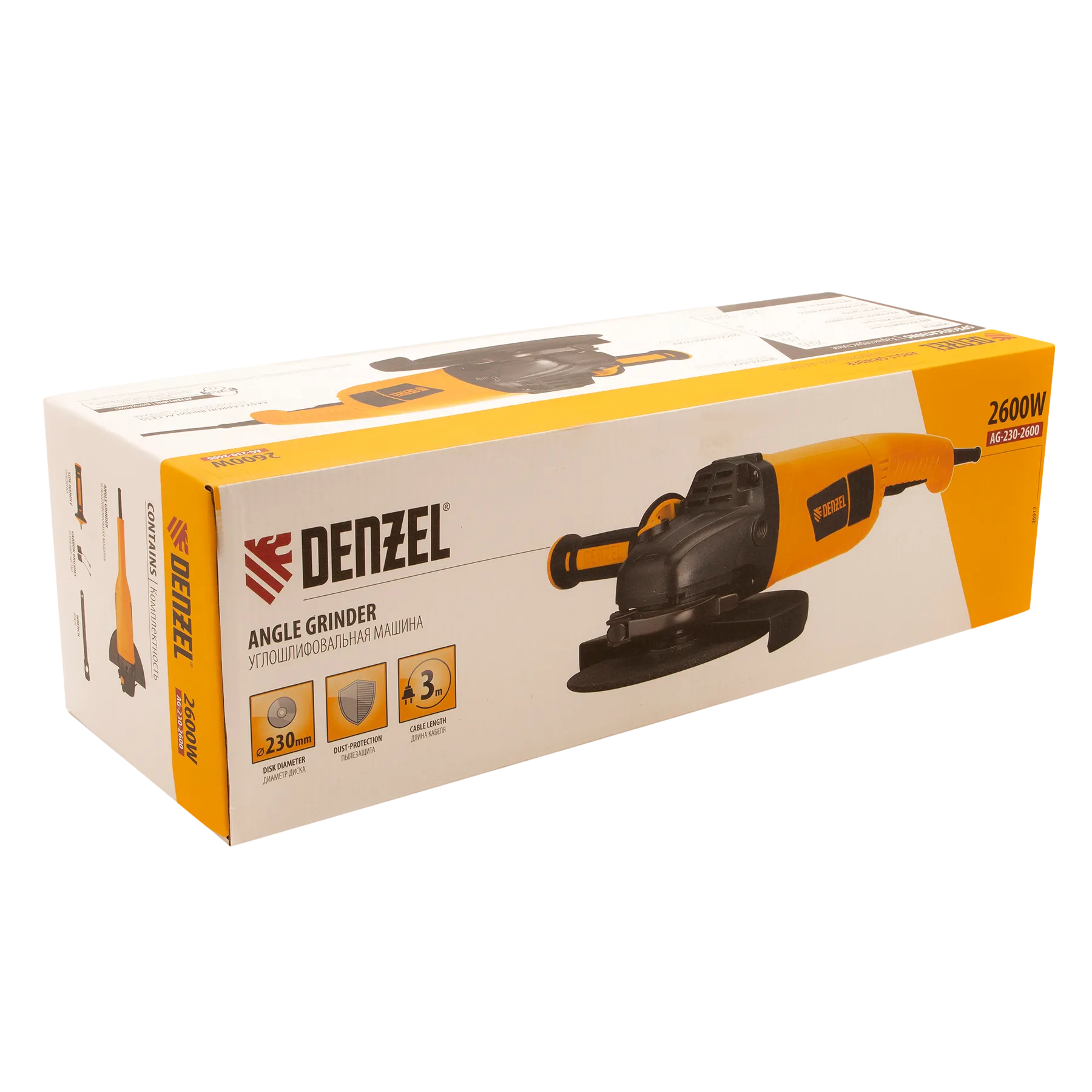 Угловая шлифовальная машина Denzel AG230-2600 26917 мощностью 2600 Вт совместима с насадками максимальным диаметром 230 мм, поддерживает частоту вращения шпинделя 6000 об/мин, благодаря чему эффективно справляется с обработкой и зачисткой поверхностей, а также резкой, шлифовкой металла толщиной до 80 мм и камня. Пригодится дома, в гараже и на даче.