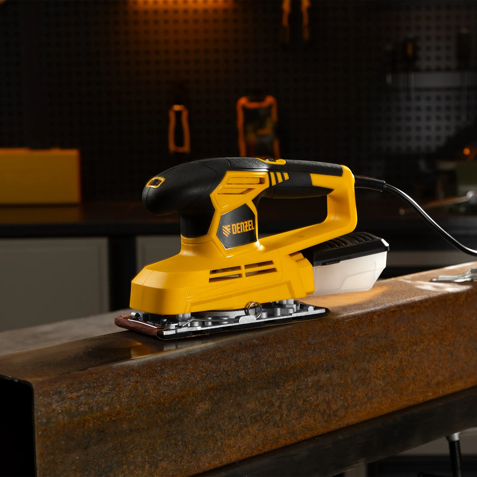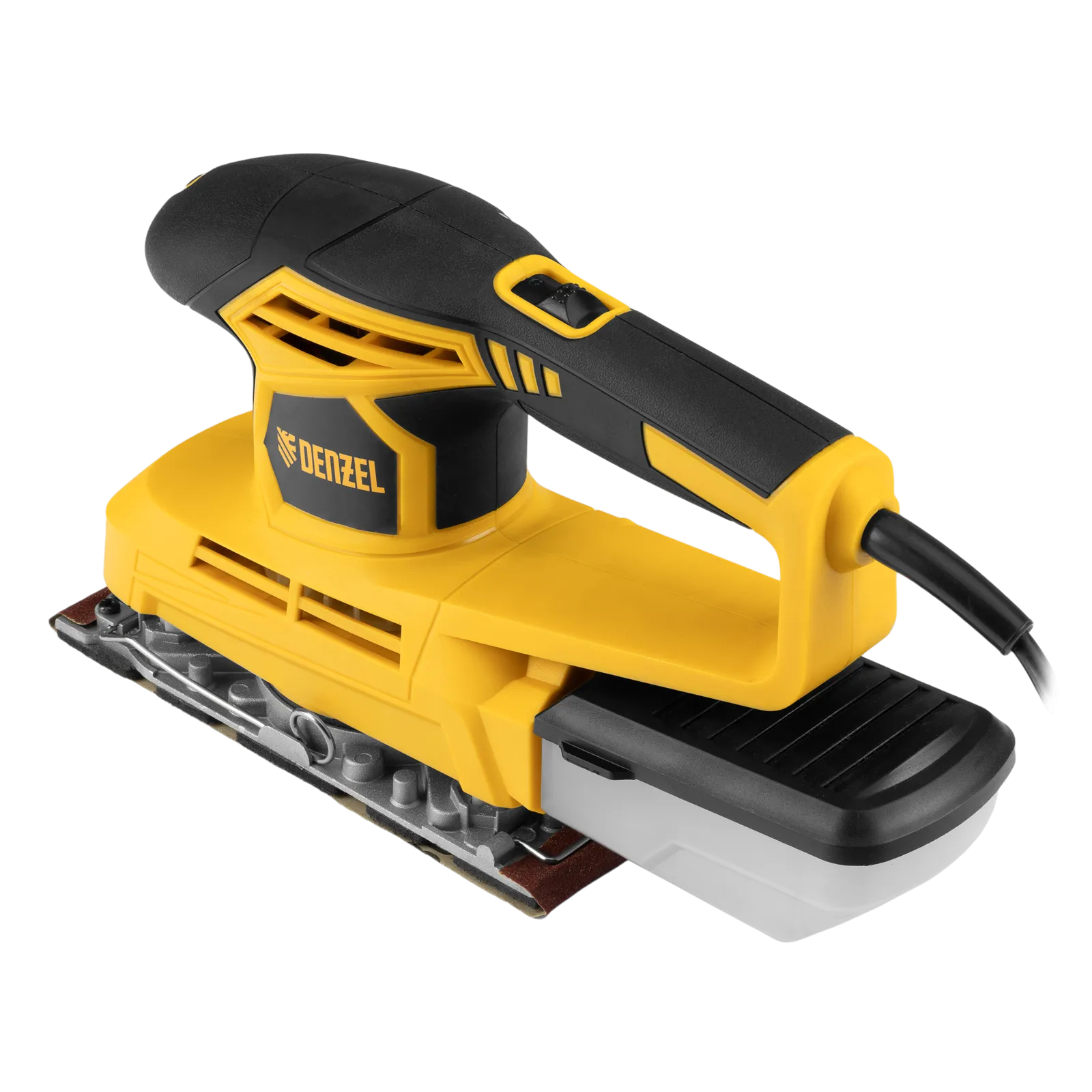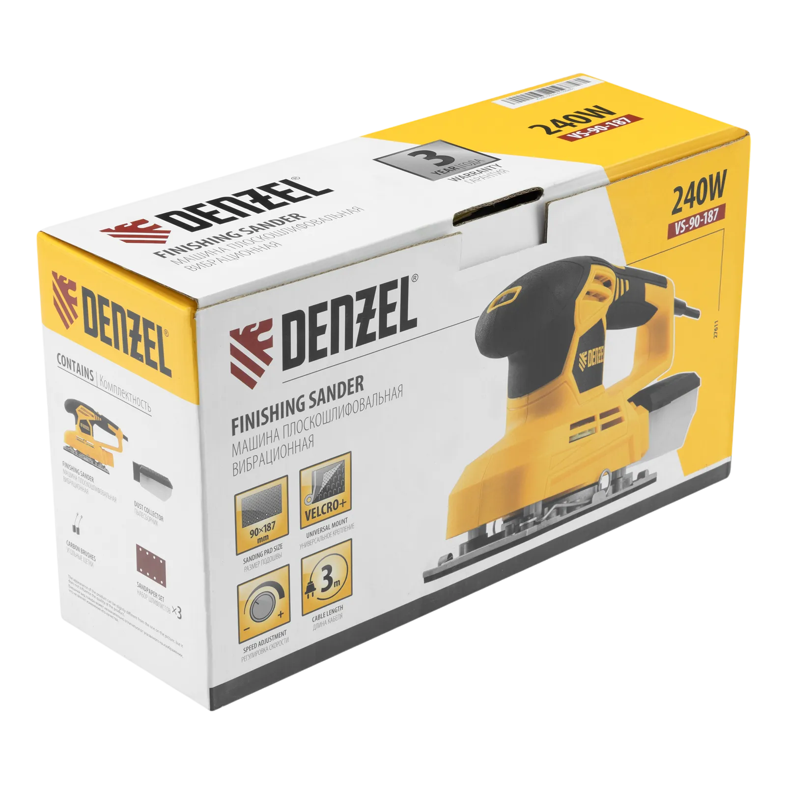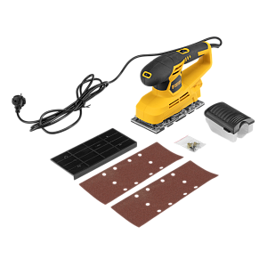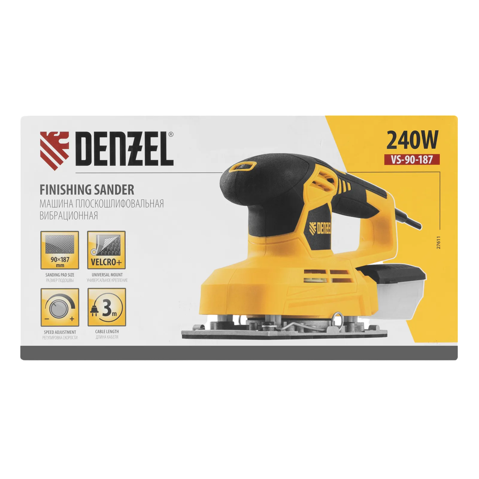 Вибрационная плоскошлифовальная машина Denzel VS-90-187 мощностью 240 Вт, с частотой колебаний подошвы 6000-11000 об/мин, подходит для сухого шлифования, зачистки и полировки поверхностей. Регулировка частоты колебаний подошвы 6000-11000 об/мин позволяет выбрать оптимальный режим работы. Размер рабочей поверхности составляет 90 х 187 мм, ход платформы — 1,6 мм, благодаря чему машина эффективно справляется с обработкой больших поверхностей.