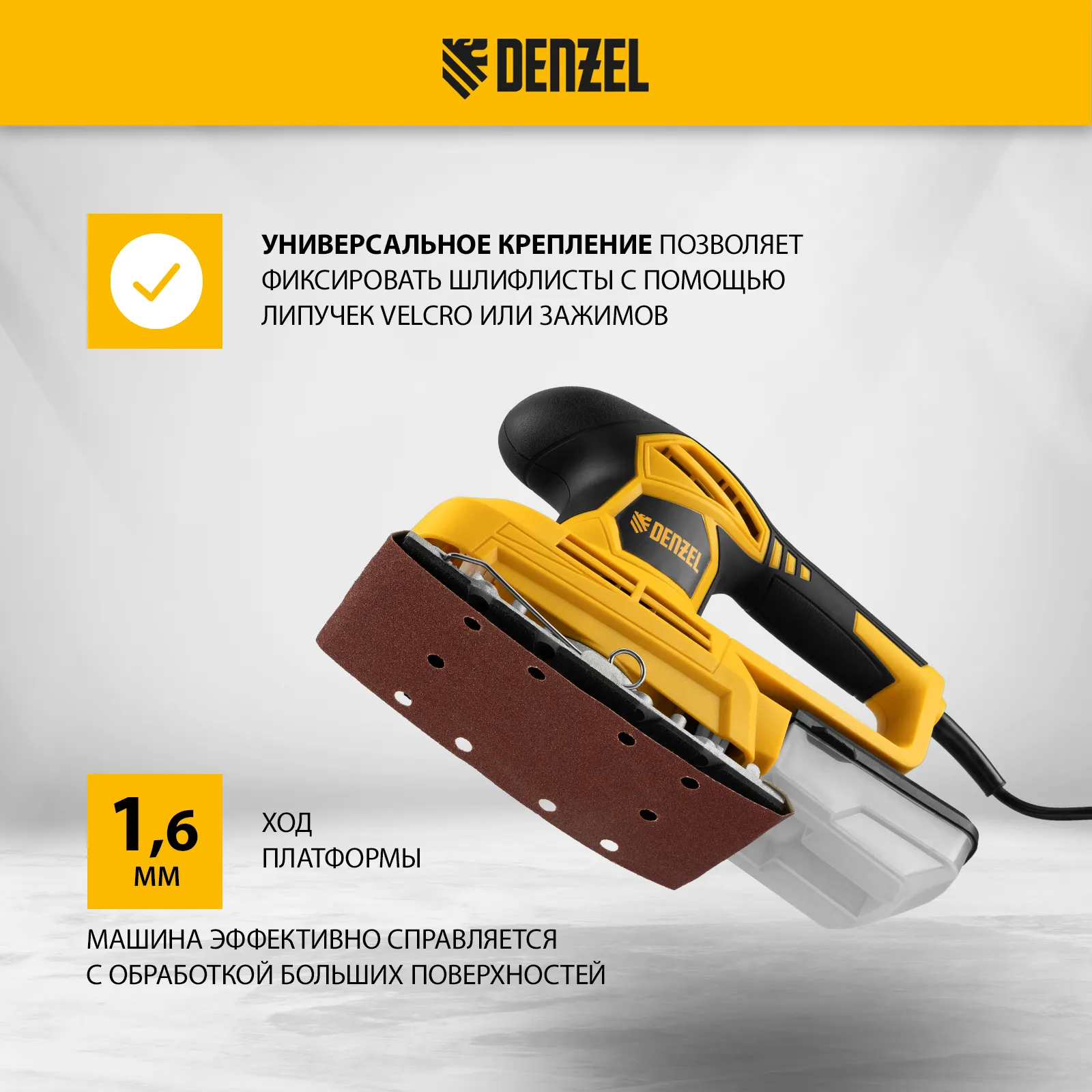 - Универсальное крепление — можно использовать как абразивный материал на липучках (VELCRO), так и обычную шлифовальную бумагу.