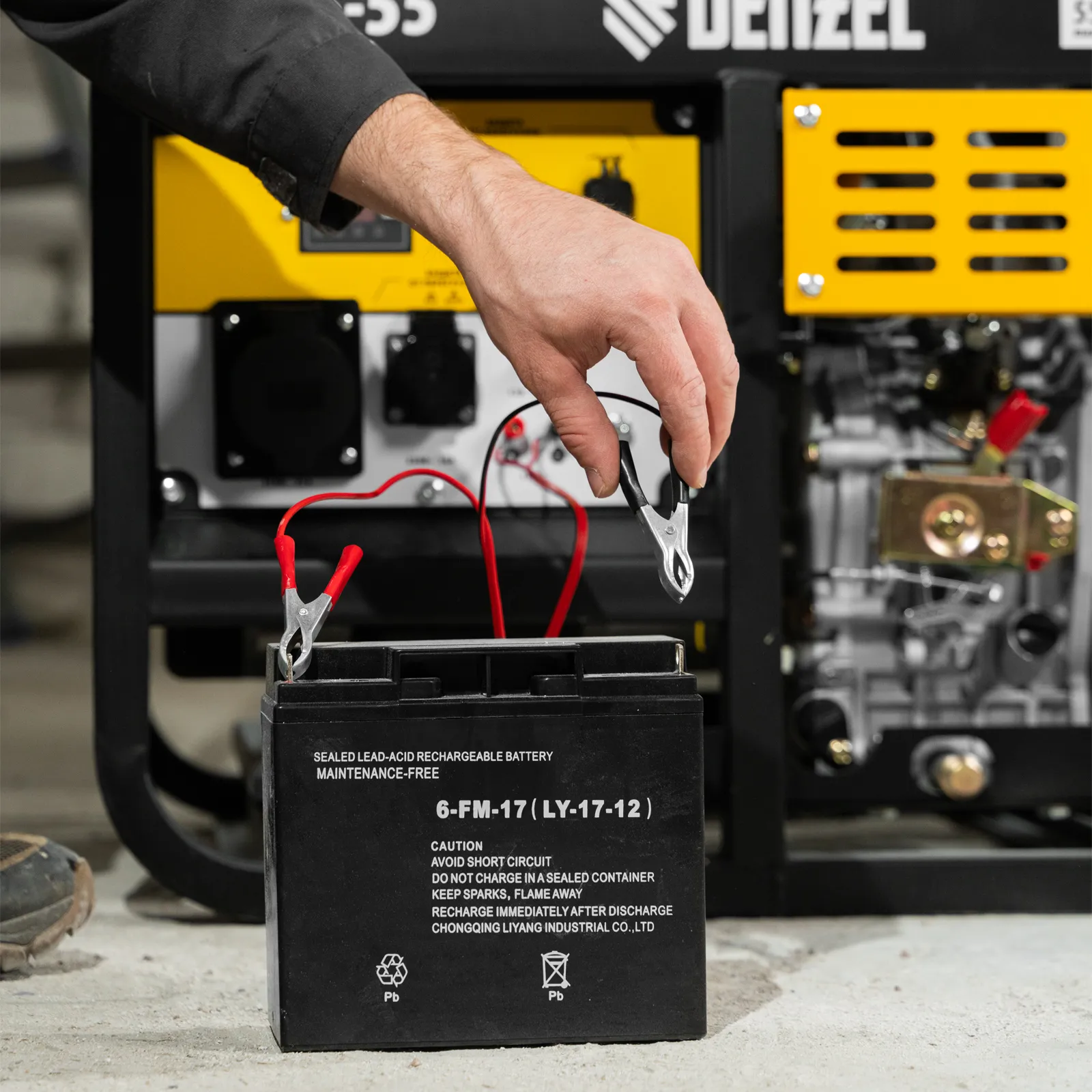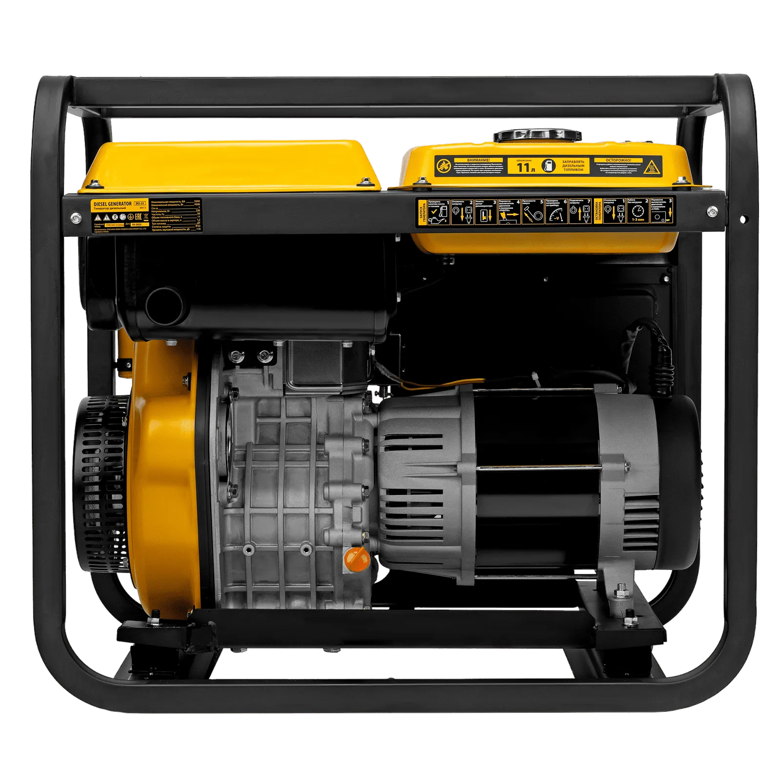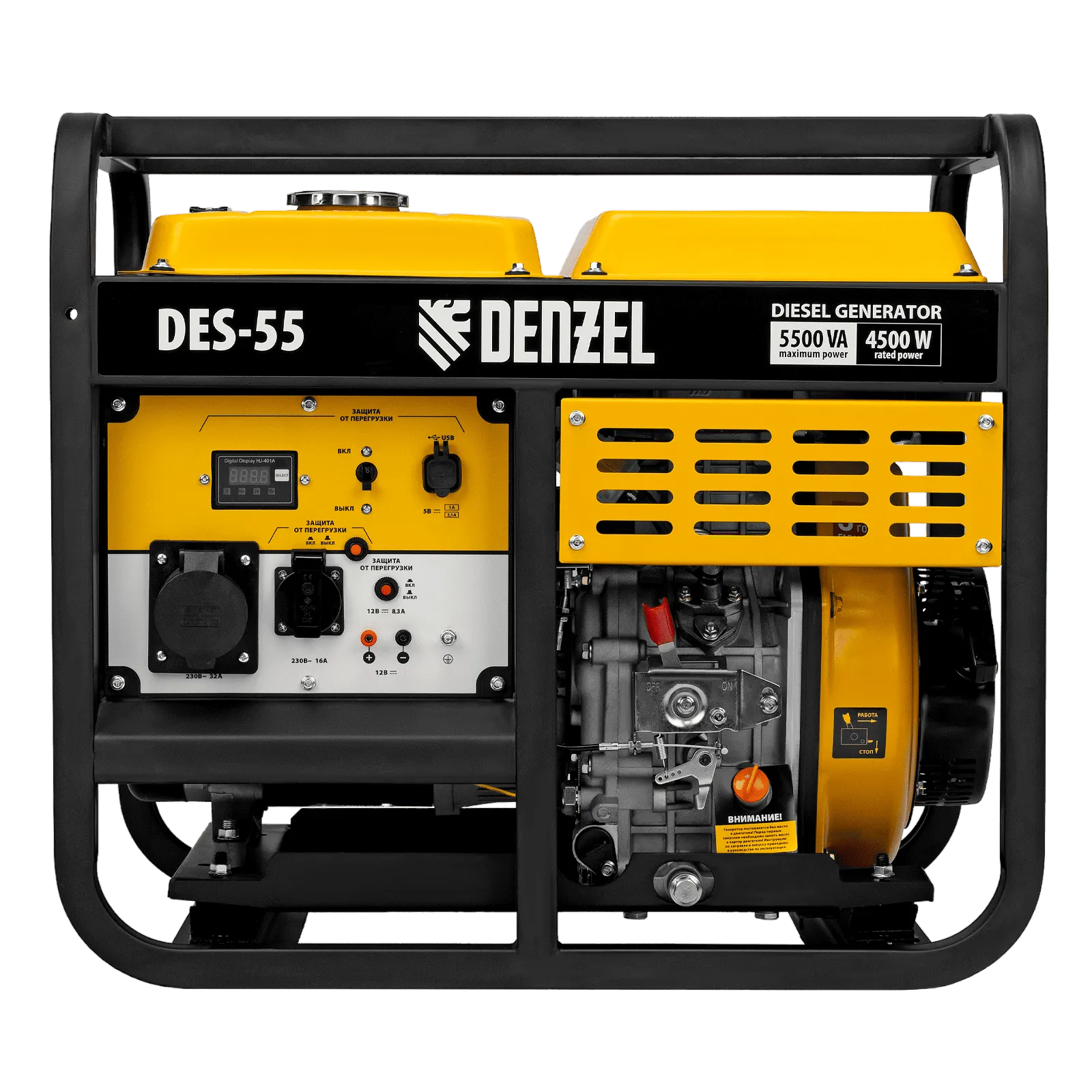 Генератор дизельный Denzel DES-55 94413 с объемом топливного бака 11 л, с ручным стартером, имеет максимальную выходную мощность 5,5 кВт и поддерживает напряжение в сети 230 В. Используется для снабжения энергией потребителей однофазного тока (осветительных приборов, бытовой техники, электроинструмента) при отсутствии доступа к стационарному источнику питания. Для подключения электроприборов служат 2 розетки: 230 В/16 А и 230 В/32 А. Клеммы постоянного тока 12 В позволяют заряжать автомобильные аккумуляторы, а двойной выход USB 5 В предназначен для подключения мобильных устройств (планшетов, смартфонов и т. д.). Генератор пригодится на строительной площадке и в загородном доме.