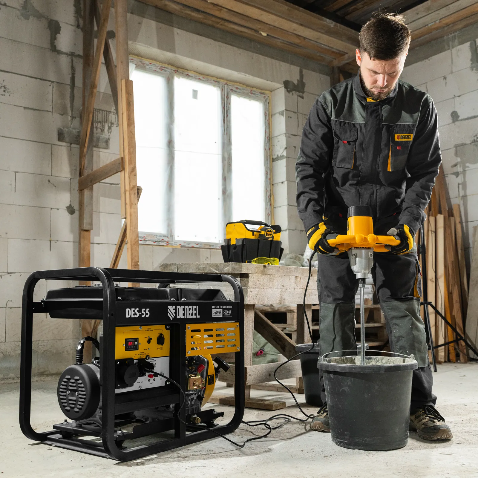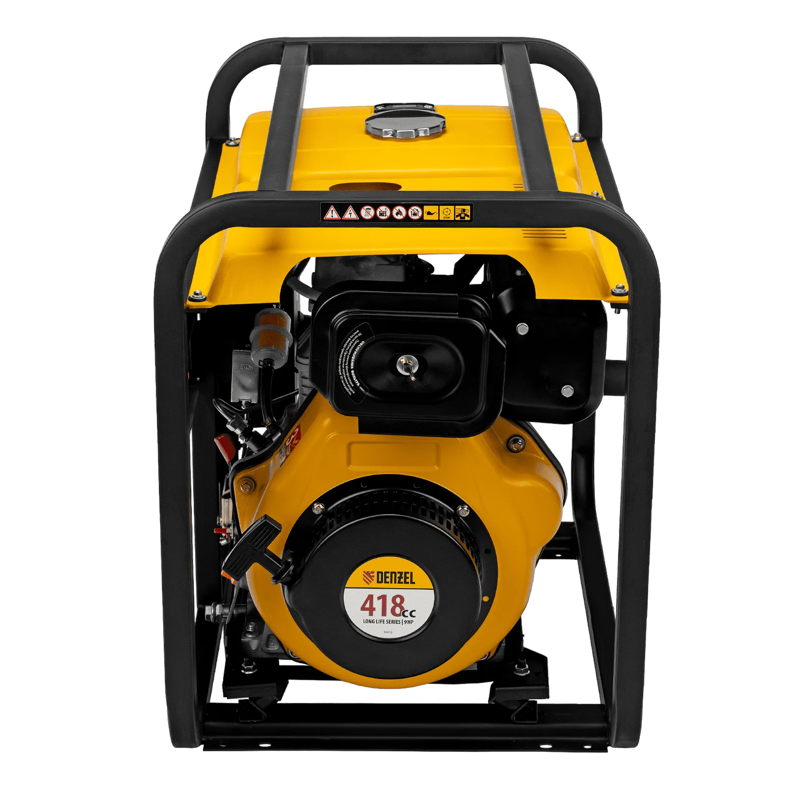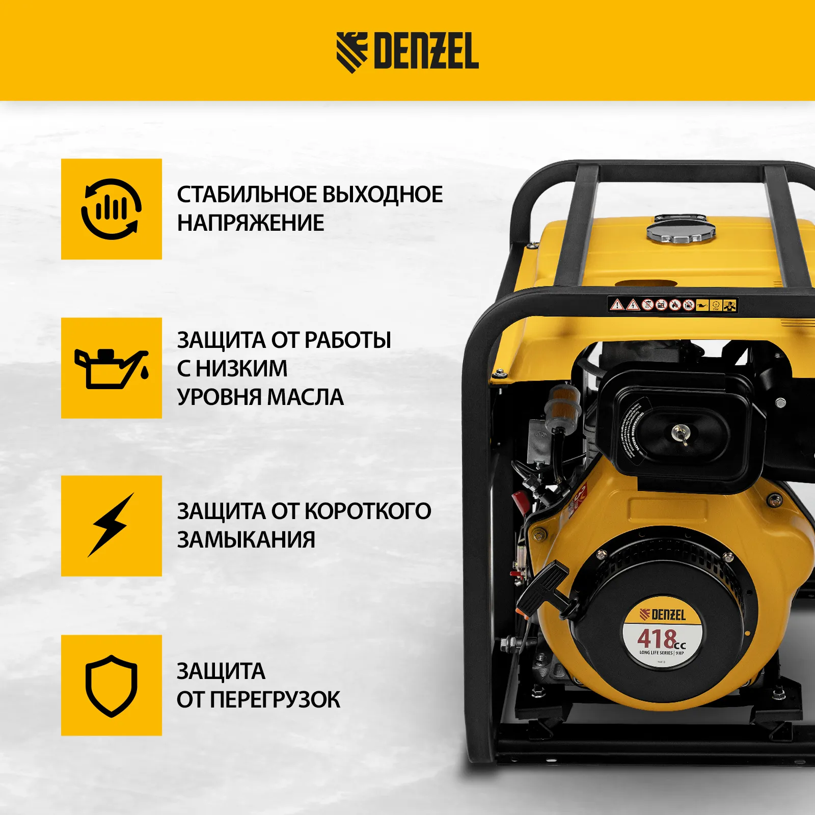 - Мобильность — к генератору можно приобрести транспортировочный комплект Denzel 94906 для перемещения по рабочей площадке.