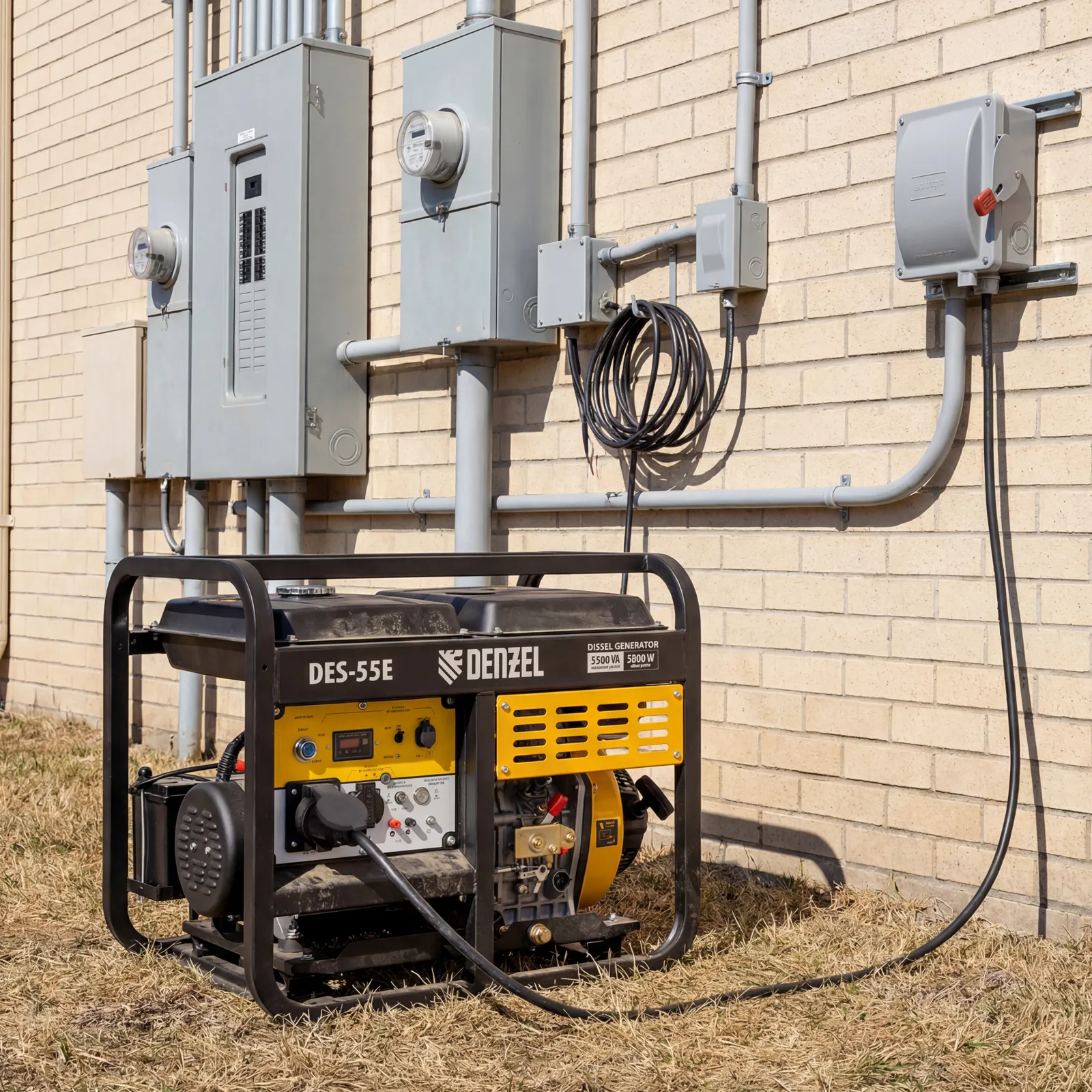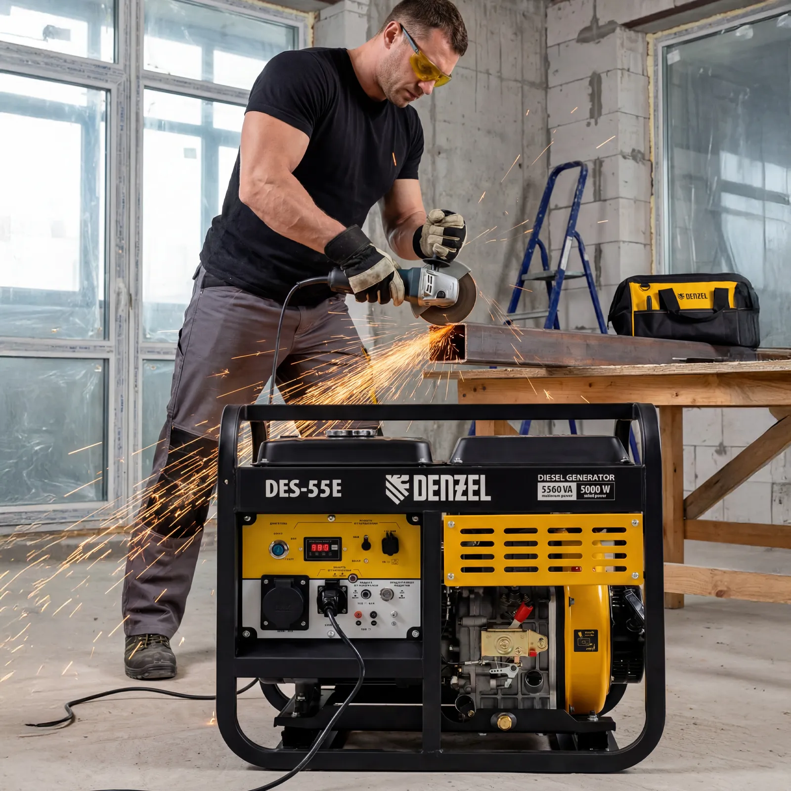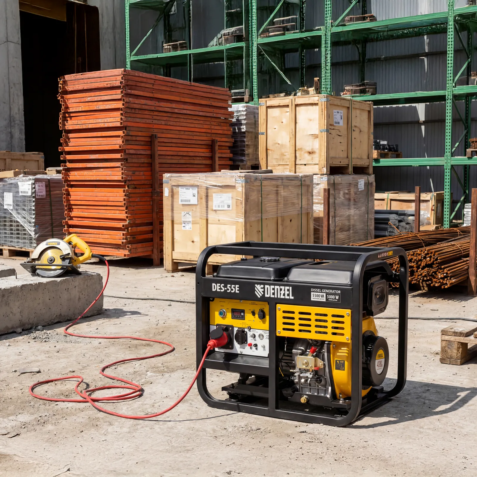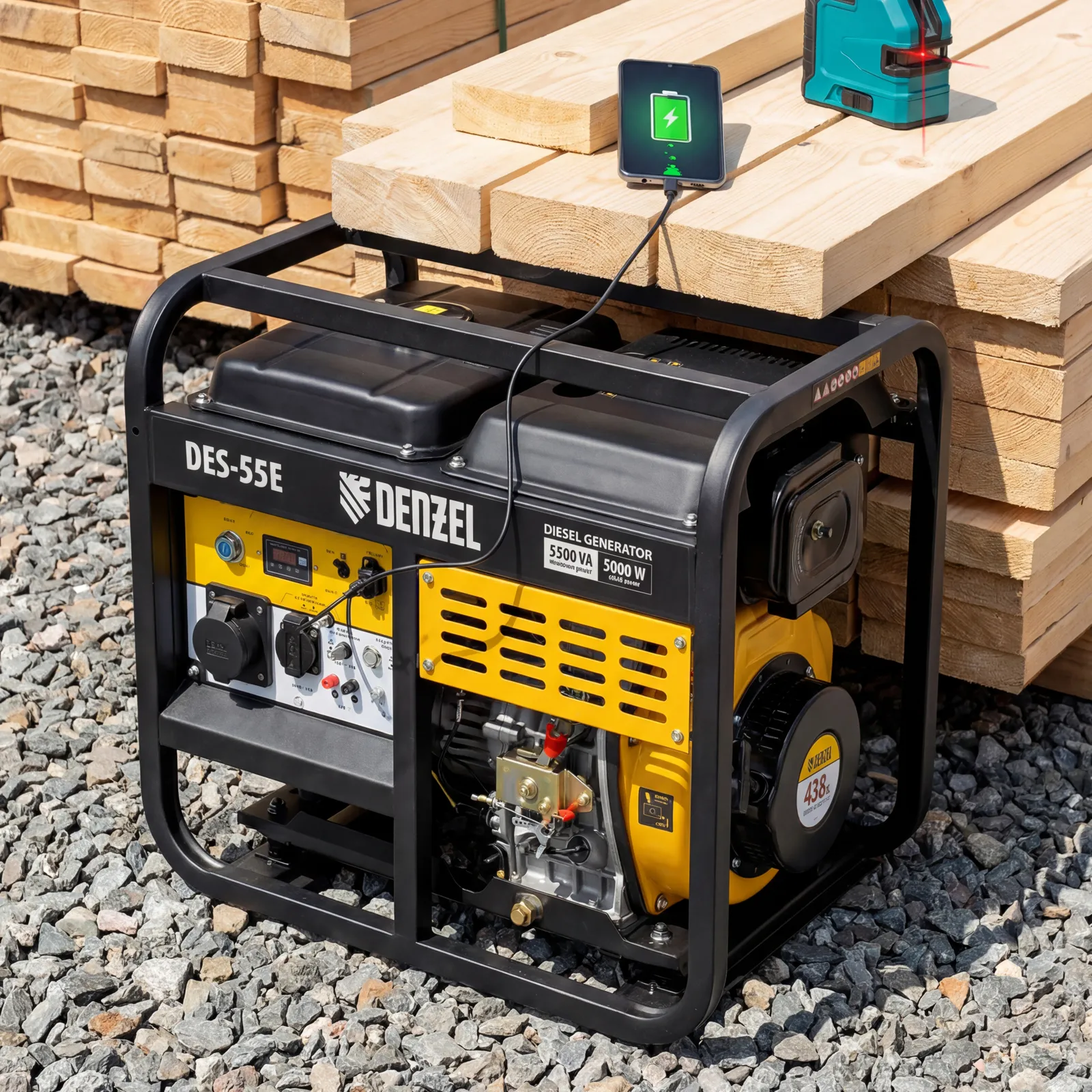 Генератор дизельный Denzel DES-55E 94414 с объемом топливного бака 11 л, с электростартером, имеет максимальную выходную мощность 5,5 кВт и поддерживает напряжение в сети 230 В. Используется для снабжения энергией потребителей однофазного тока (осветительных приборов, бытовой техники, электроинструмента) при отсутствии доступа к стационарному источнику питания. Для подключения электроприборов служат 2 розетки: 230 В/16 А и 230 В/32 А. Клеммы постоянного тока 12 В позволяют заряжать автомобильные аккумуляторы, а двойной выход USB 5 В предназначен для подключения мобильных устройств (планшетов, смартфонов и т. д.). Генератор пригодится в загородном доме.
