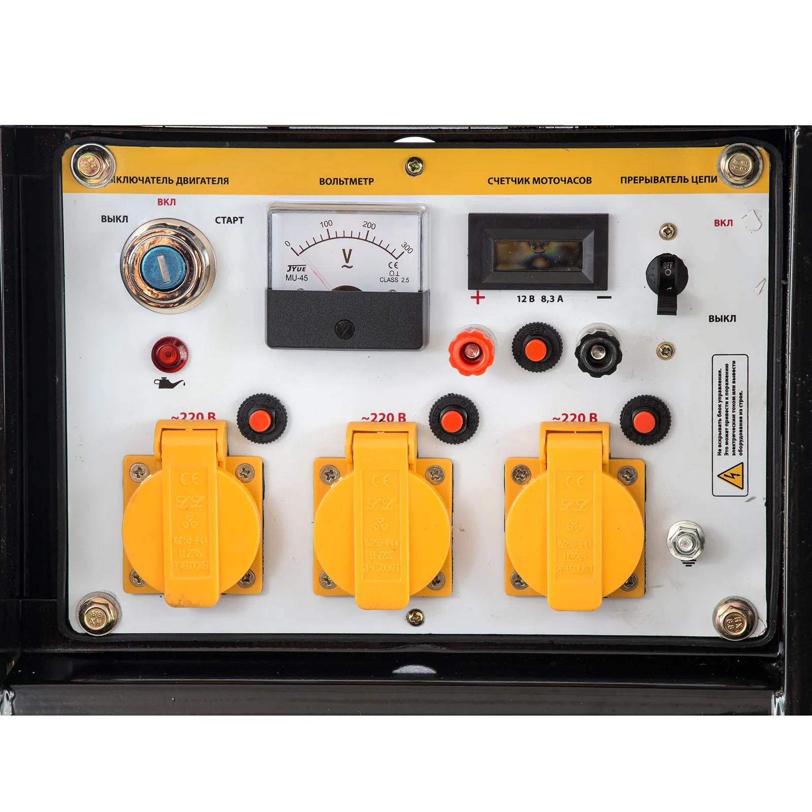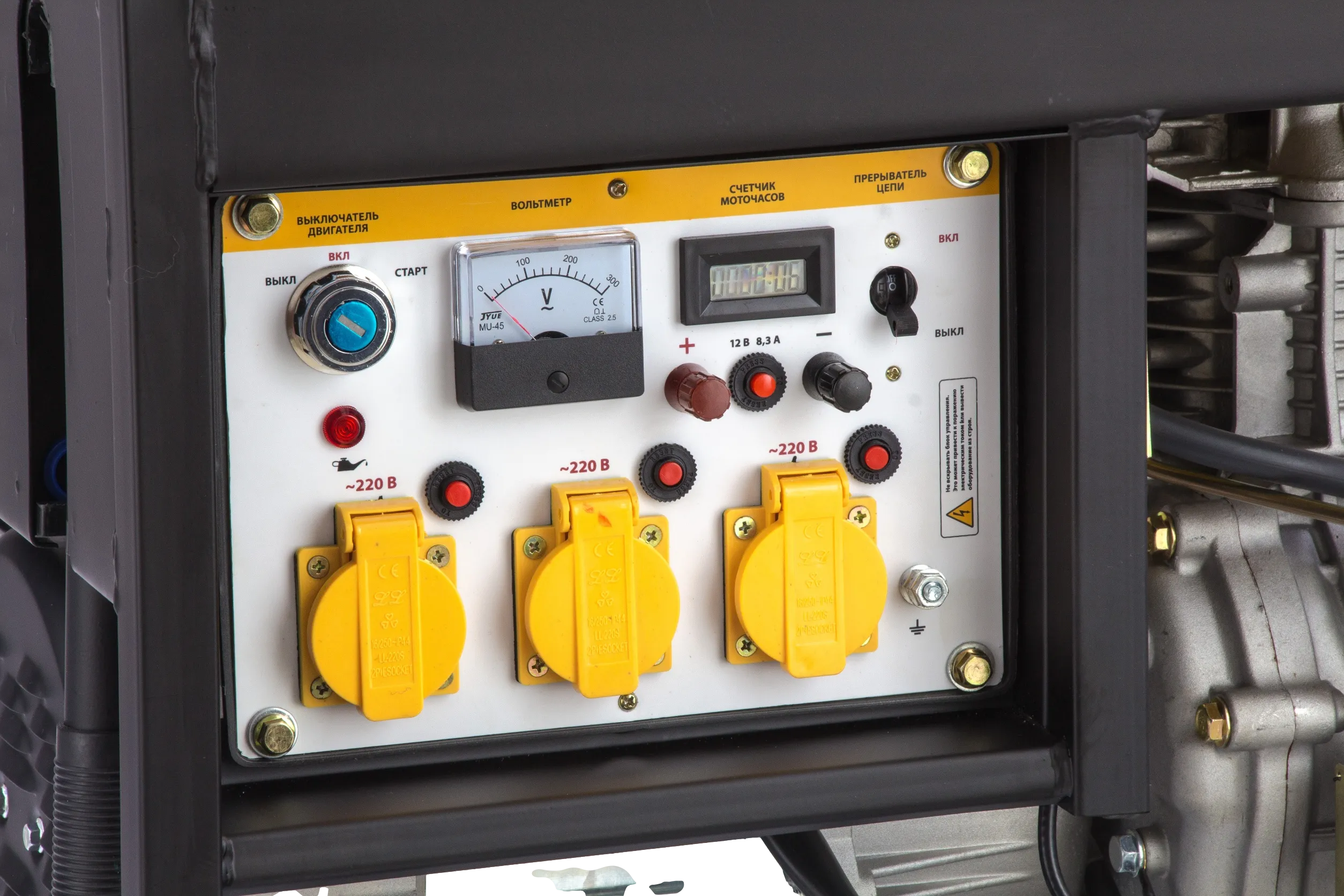 - Удобный контроль работы — счетчик моточасов отображает отработанное время, вольтметр позволяет отслеживать напряжение в сети, а индикатор топлива помогает своевременно заправлять бак.