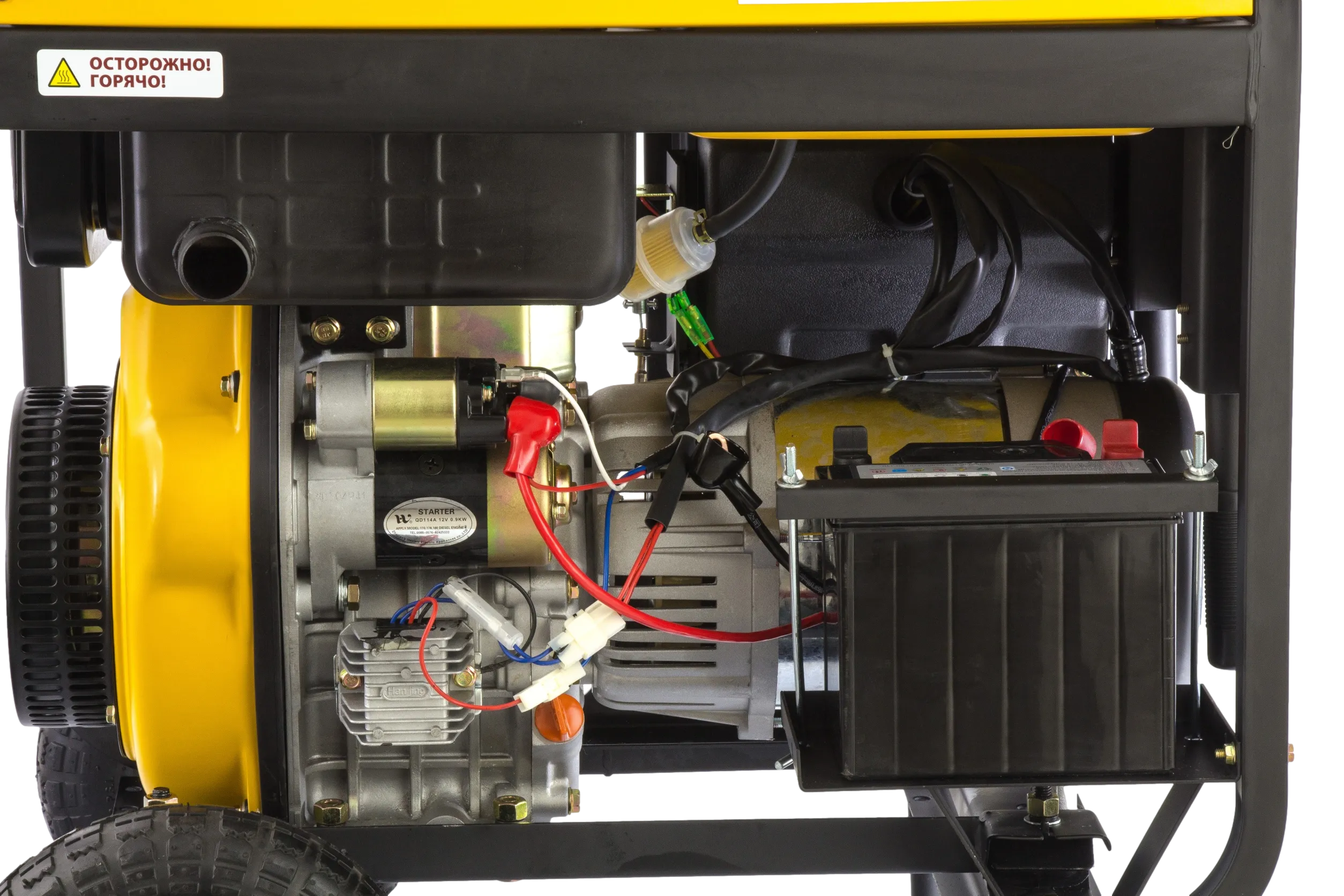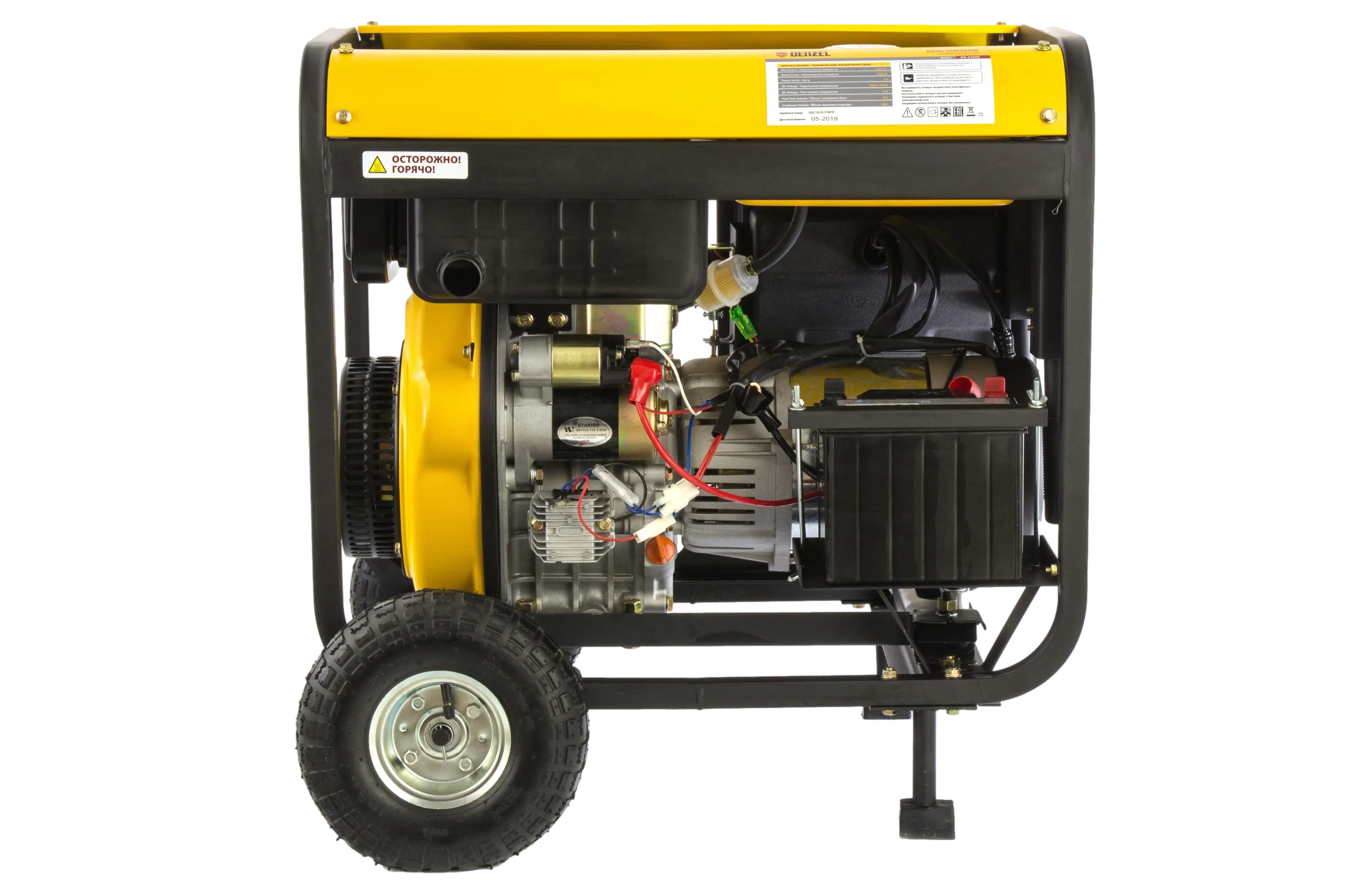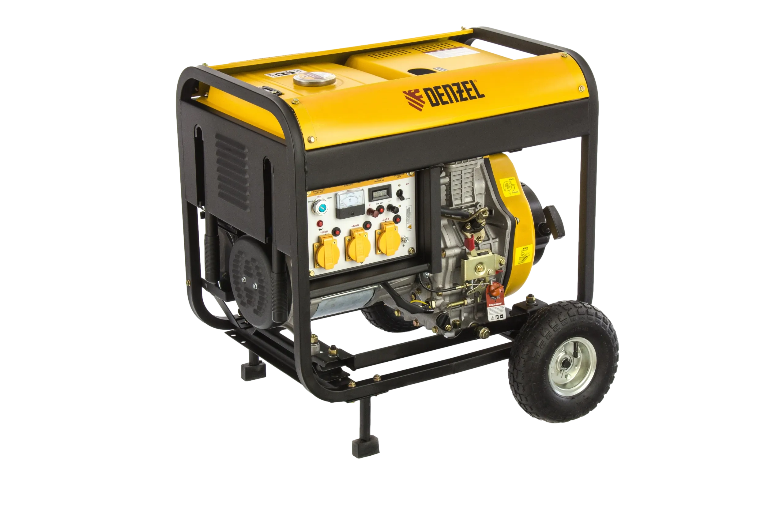Дизельный генератор Denzel DD6300Е 94657 мощностью 5,0 кВт, 230 В / 50 Гц, с баком объемом 15 л и электростартером, предназначен для снабжения электричеством дачи, садового участка, строительной площадки, мастерской, магазина. Например, к нему можно одновременно подключить телевизор, холодильник, утюг, микроволновку, 3 лампы накаливания. Дизельный генератор потребляет меньше топлива, чем аналогичный по мощности бензиновый — бака объемом 15 л хватит на 10 часов работы.