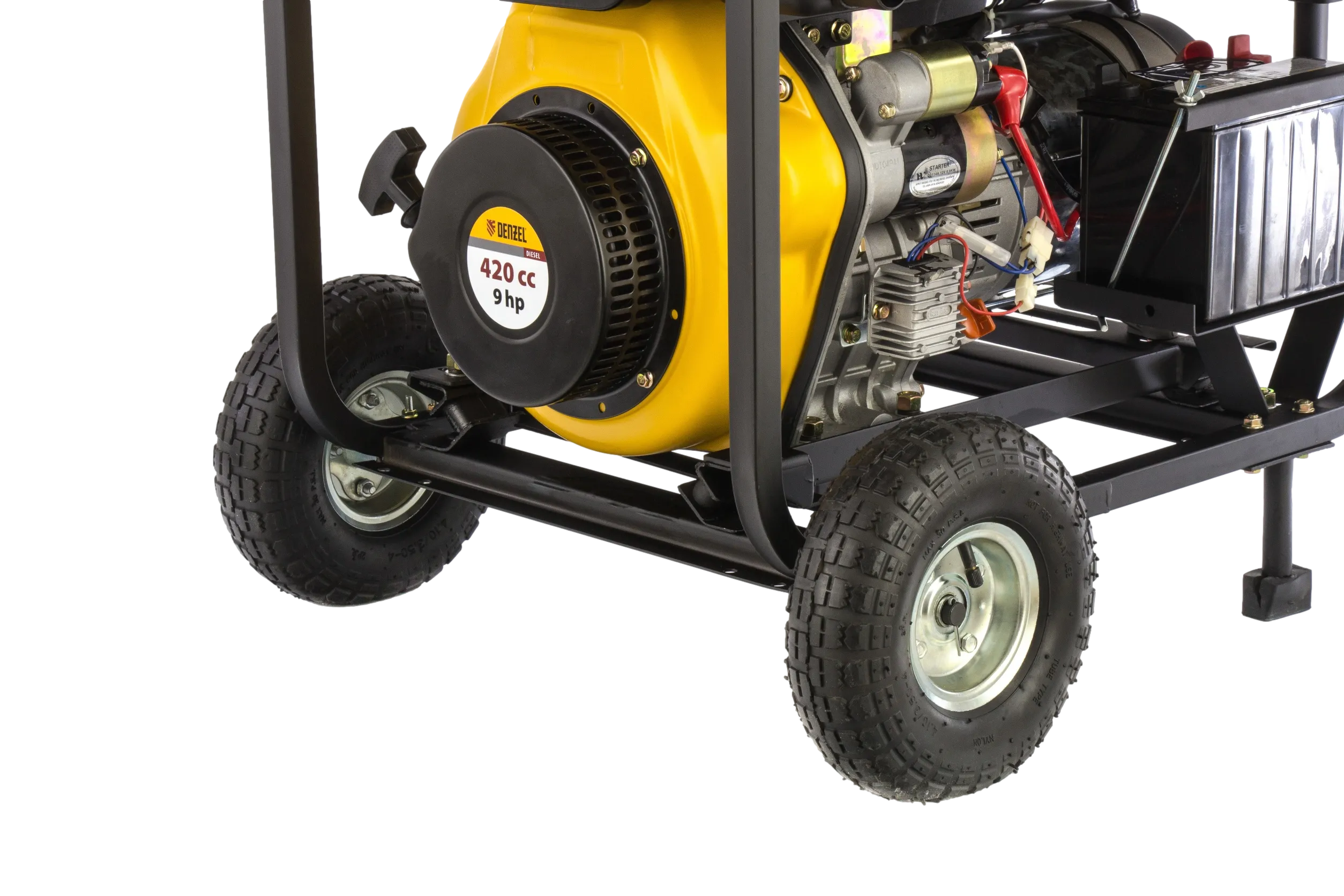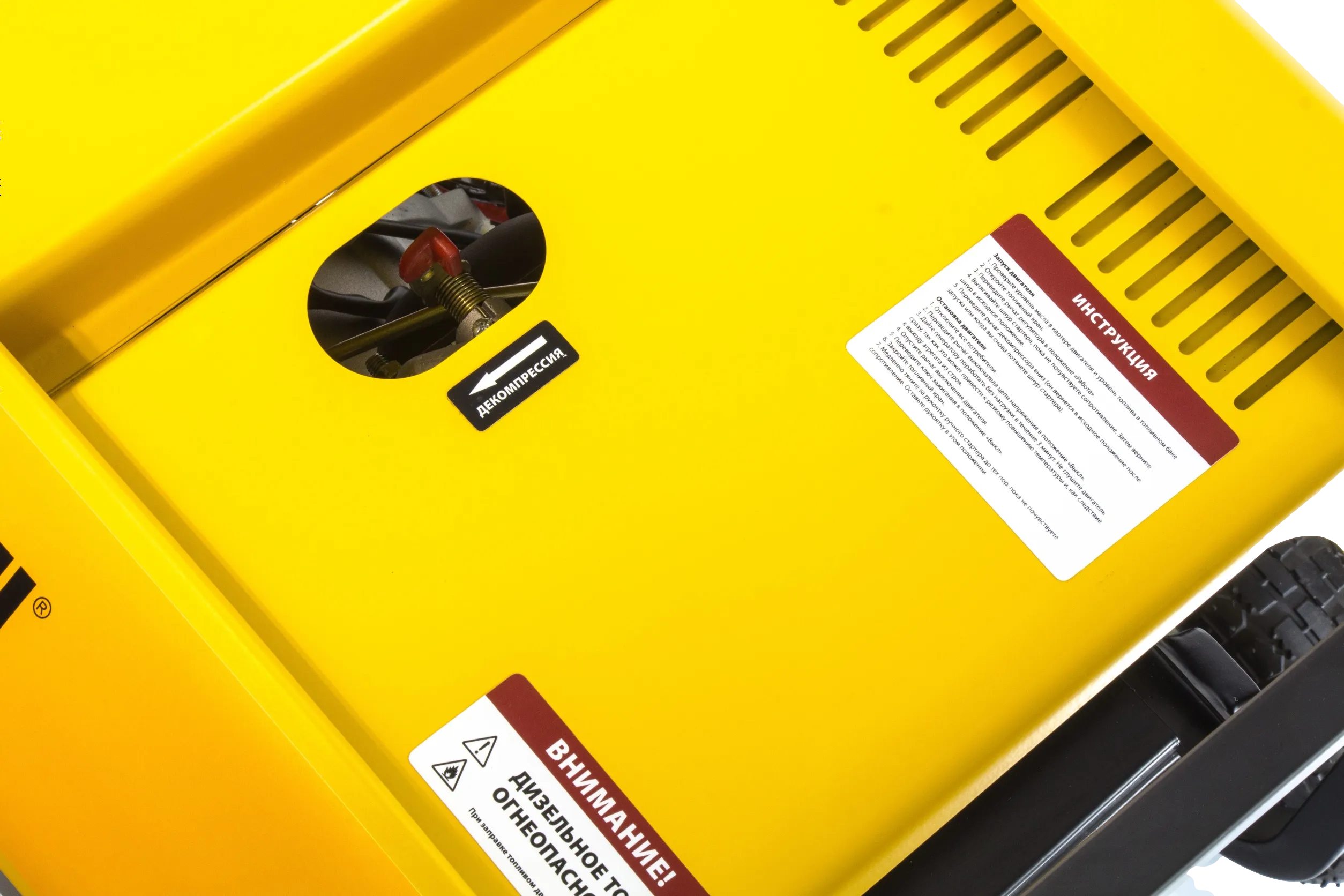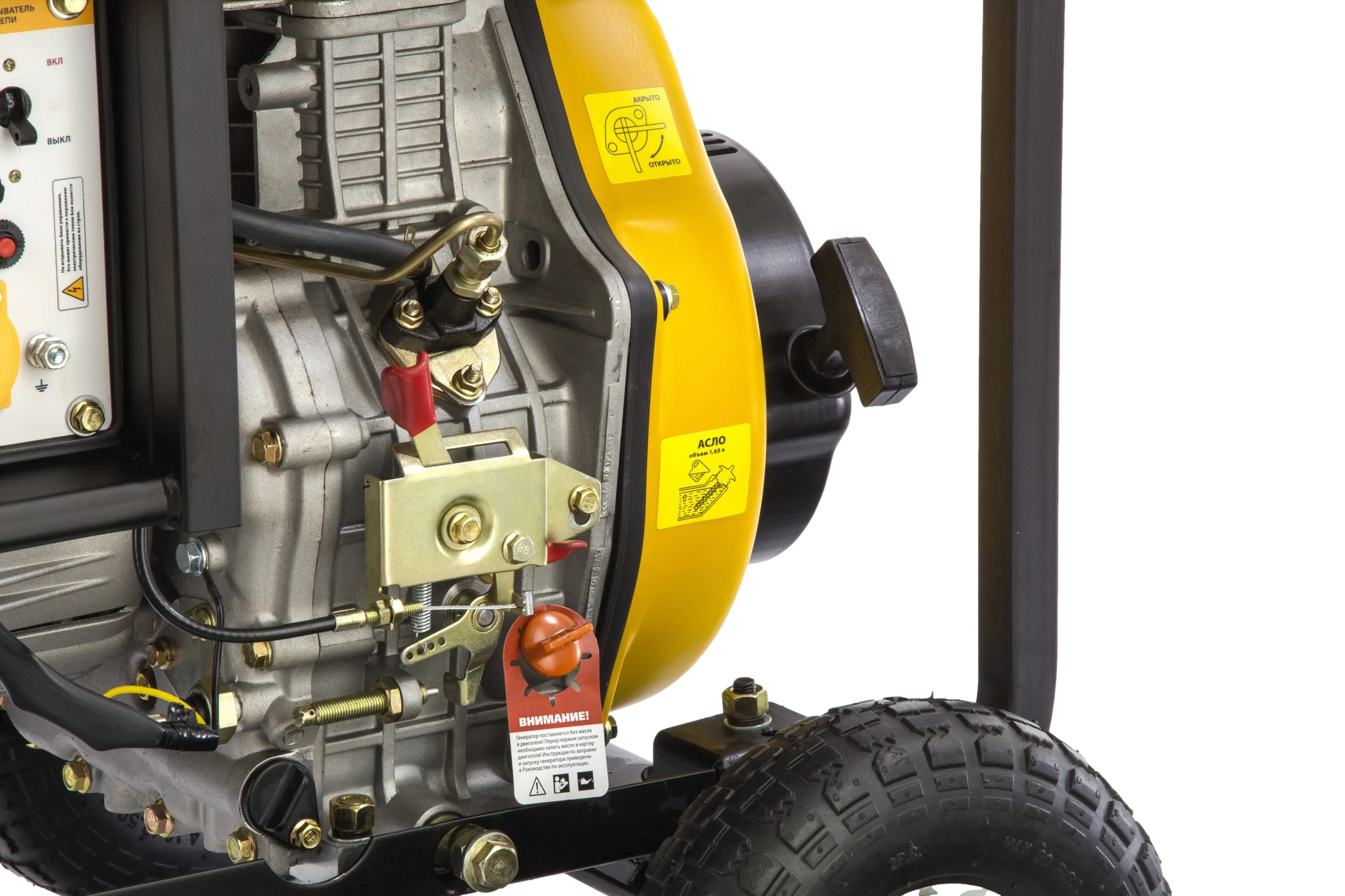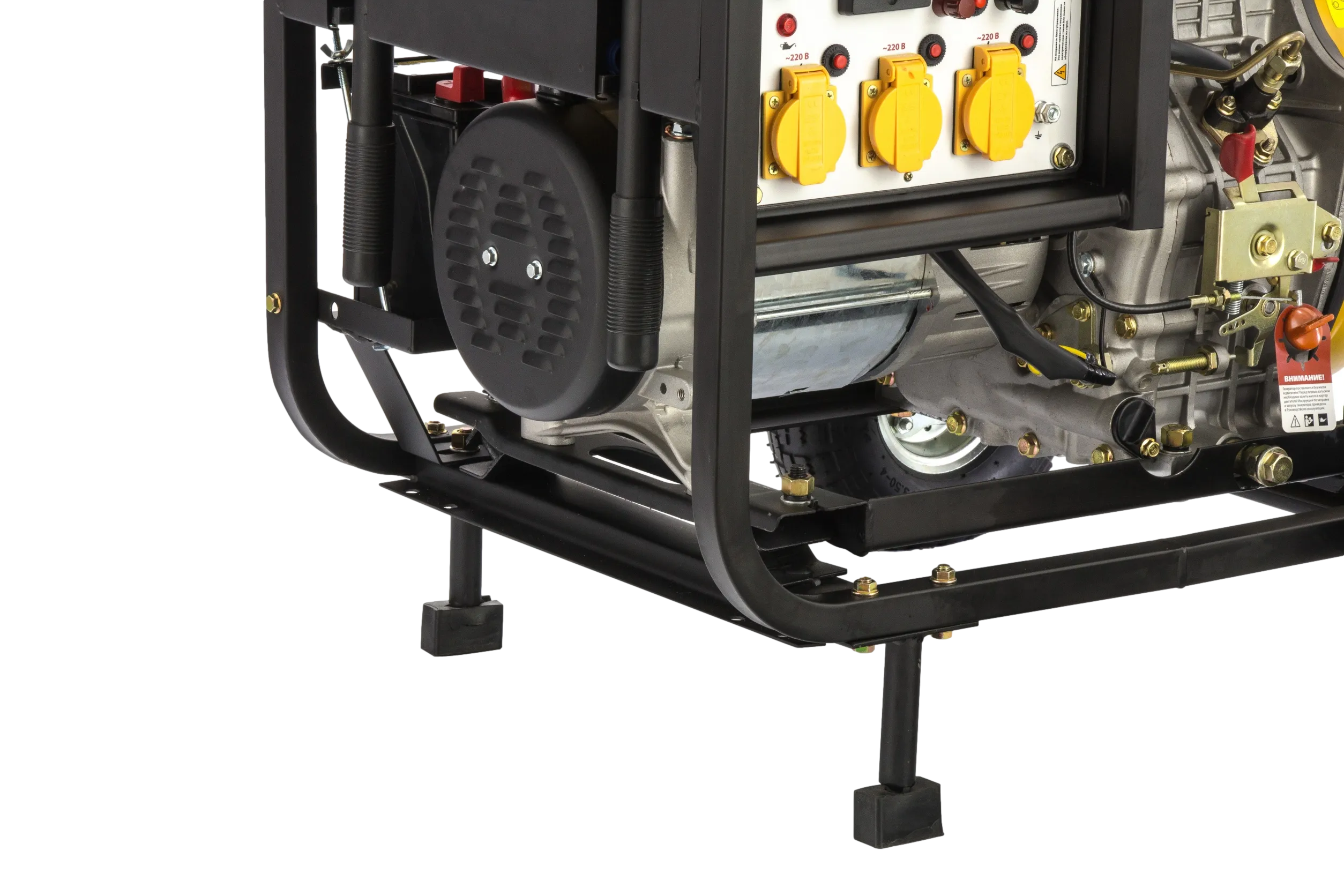 Дизельный генератор Denzel DD6300Е 94657 мощностью 5,0 кВт, 230 В / 50 Гц, с баком объемом 15 л и электростартером, предназначен для снабжения электричеством дачи, садового участка, строительной площадки, мастерской, магазина. Например, к нему можно одновременно подключить телевизор, холодильник, утюг, микроволновку, 3 лампы накаливания. Дизельный генератор потребляет меньше топлива, чем аналогичный по мощности бензиновый — бака объемом 15 л хватит на 10 часов работы.