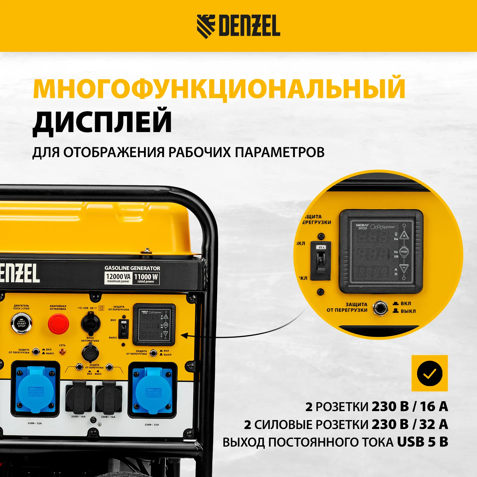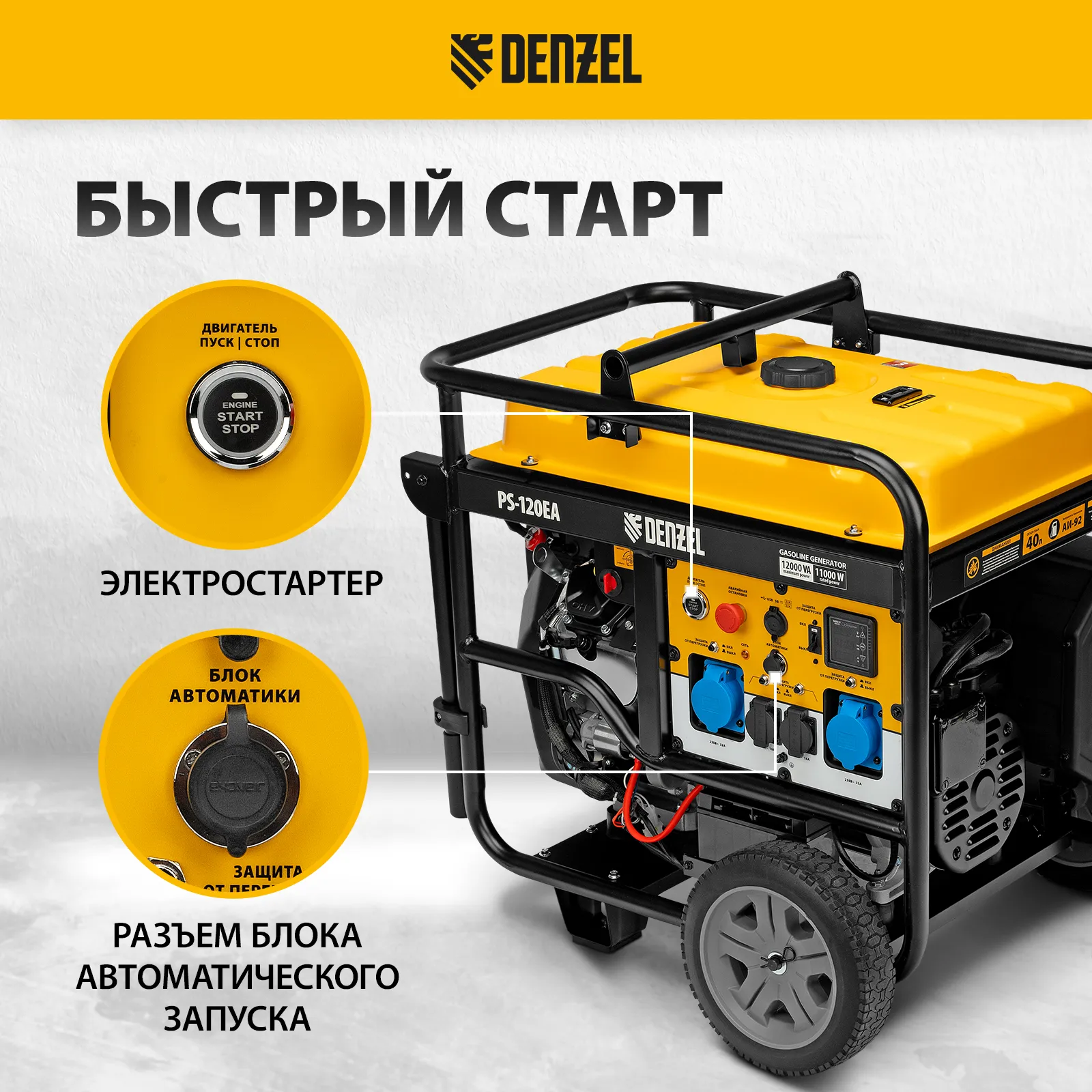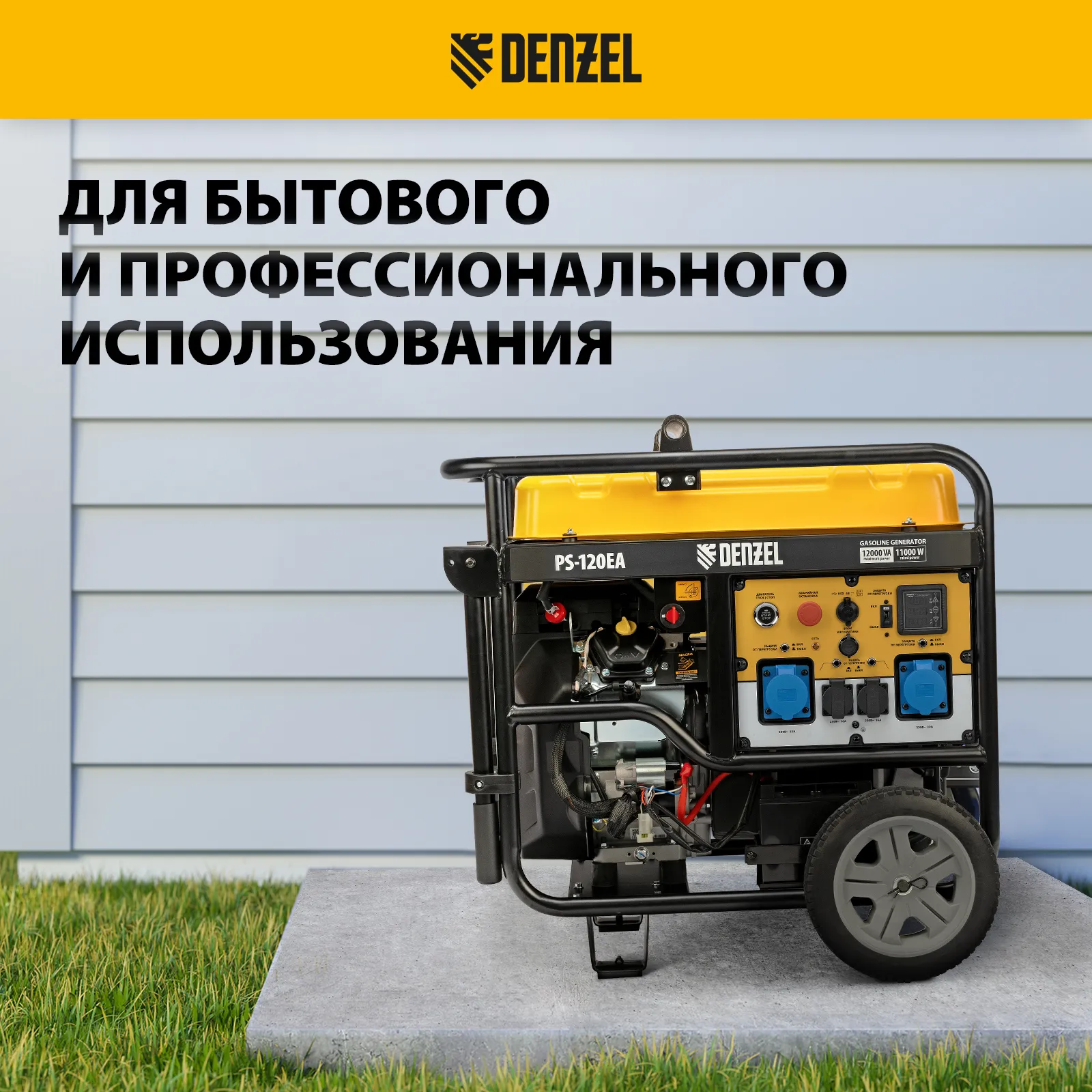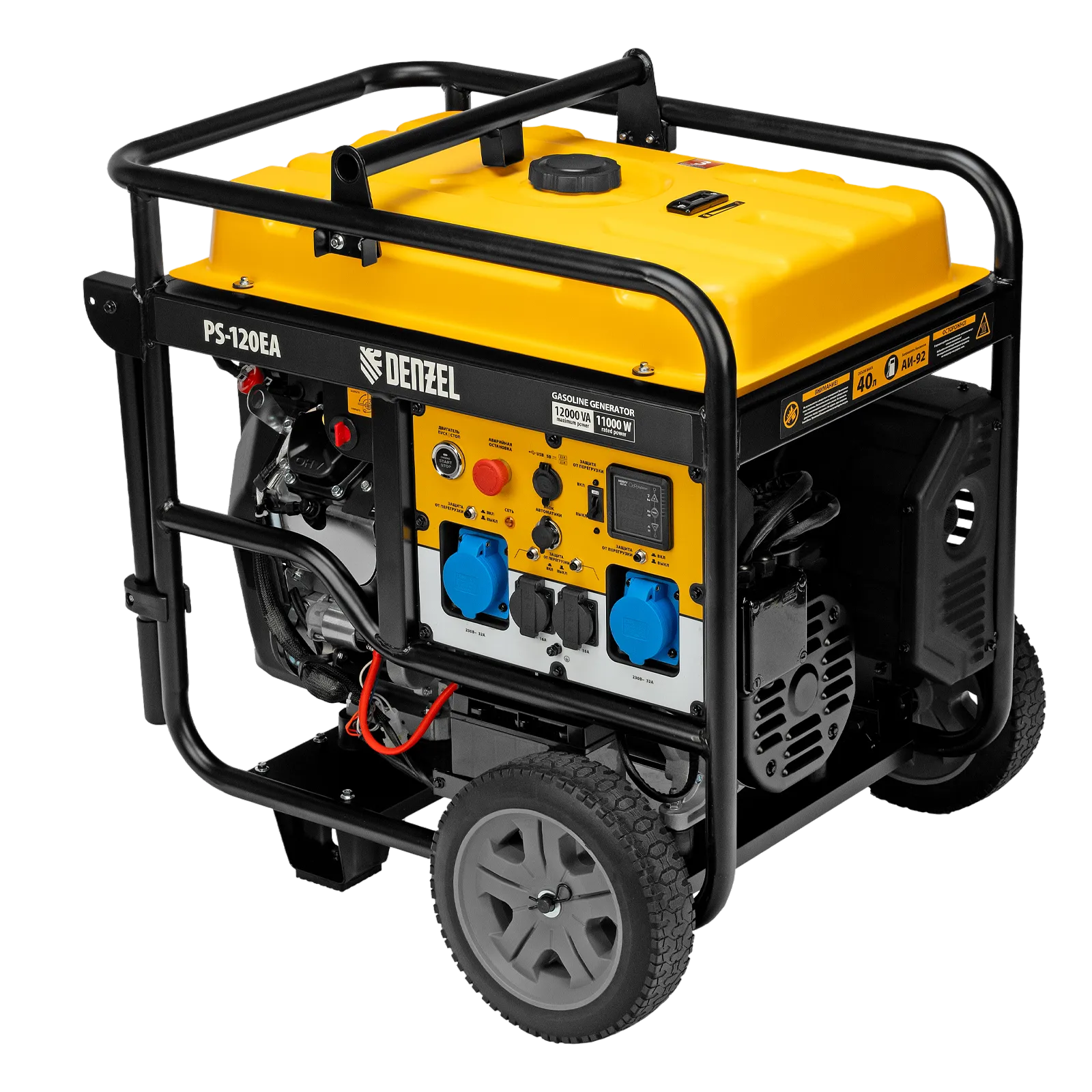 Бензиновый генератор Denzel PS-120EA 946964 максимальной мощностью 12 кВт, с баком объемом 40 л, разъемом ATS и электрическим стартером, поддерживает напряжение в сети 230 В. Предназначен для обеспечения питанием приборов и оборудования в случае отсутствия стационарной сети или перебоев в ее работе. Разъем USB 5 В позволяет заряжать мобильные устройства. Подключение потребителей производится при помощи 2-х розеток 230 В/16 А, а также 2-х силовых розеток 230 В/32 А.;Для работы с мощным оборудованием можно воспользоваться возможностью прямого подключения кабелей через распределительную коробку. Генератор пригодится в загородном доме, на производстве или строительной площадке.