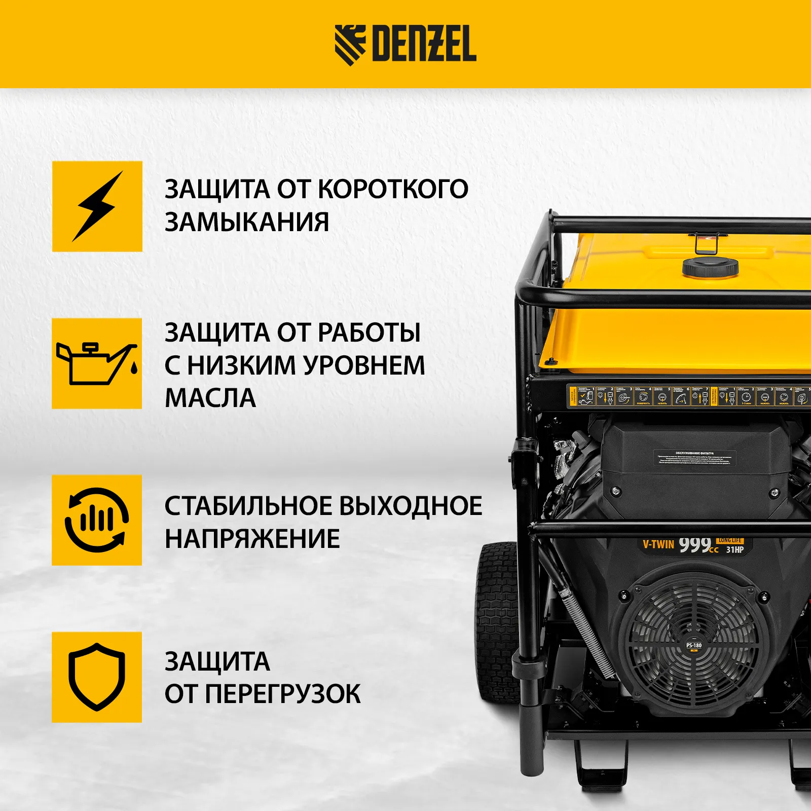 Бензиновый генератор Denzel PS-180EA 946974 максимальной мощностью 18 кВт, с баком объемом 65 л, разъемом ATS и электрическим стартером, поддерживает напряжение в сети 230 В. Предназначен для обеспечения питанием приборов и оборудования в случае отсутствия стационарной сети или перебоев в ее работе. Разъем USB 5 В позволяет заряжать мобильные устройства. Подключение потребителей производится при помощи 2-х розеток 230 В/16 А, а также 2-х силовых розеток 230 В/32 А.;Для работы с мощным оборудованием можно воспользоваться возможностью прямого подключения кабелей через распределительную коробку. Генератор пригодится в загородном доме, на производстве или строительной площадке.