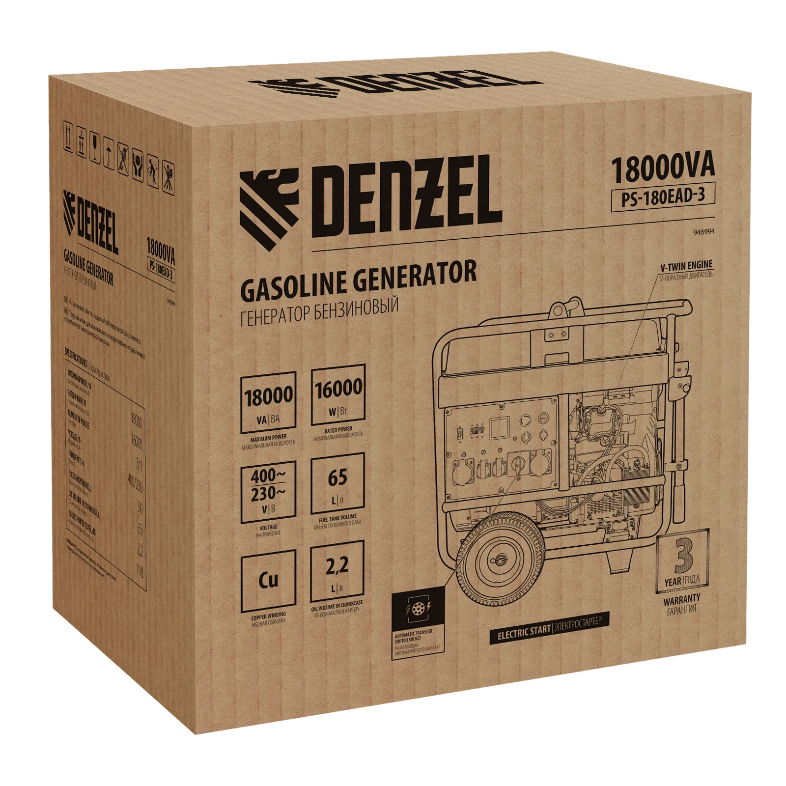 Бензиновый генератор Denzel PS-180EAD-3 946994 максимальной мощностью 18 кВт, с баком объемом 65 л, разъемом ATS, переключателем режима и электрическим стартером, способен поддерживать напряжение в сети 230/400 В. Предназначен для обеспечения питанием приборов и оборудования в случае отсутствия стационарной сети или перебоев в ее работе. Подключение потребителей производится при помощи 2-х розеток 230 В/16 А, а также силовой розетки 230 В/32 А и розетки трехфазного тока 400 В/32 А. Разъем USB 5 В позволяет заряжать мобильные устройства.;Мощное оборудование можно подключить напрямую через распределительную коробку. Генератор работает как в трехфазном, так и в однофазном режиме без потери мощности. Выбор режима осуществляется при помощи переключателя на передней панели. Генератор пригодится в загородном доме, на производстве или строительной площадке.