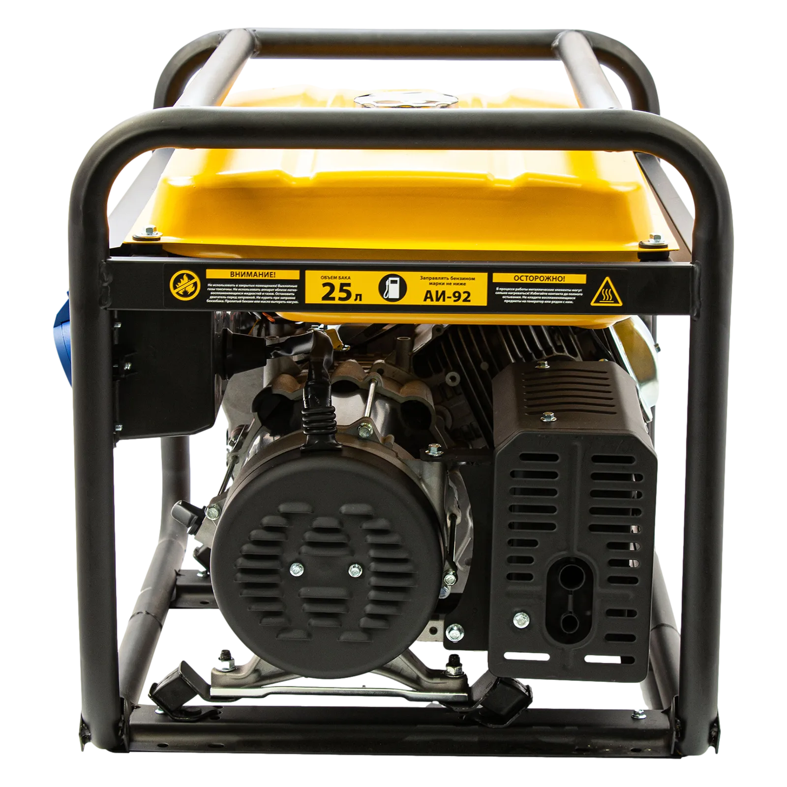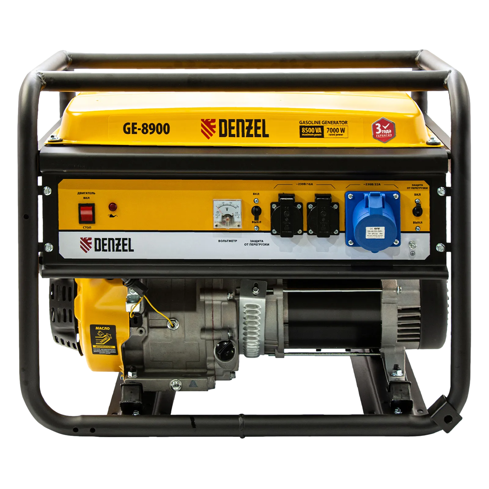 Бензиновый генератор Denzel GE 8900 94639, 220 В / 50 Гц, с баком на 25 л и ручным стартом, вырабатывает 8,5 кВт и способен обеспечить электричеством большой загородный дом, магазин или строительную площадку. Можно запитать сразу несколько потребителей, например, обогреватель или кондиционер, насос и электроинструменты. Силовая розетка позволяет подключать оборудование высокой мощности. Полного бака хватает на 7,8 ч работы без дозаправки.