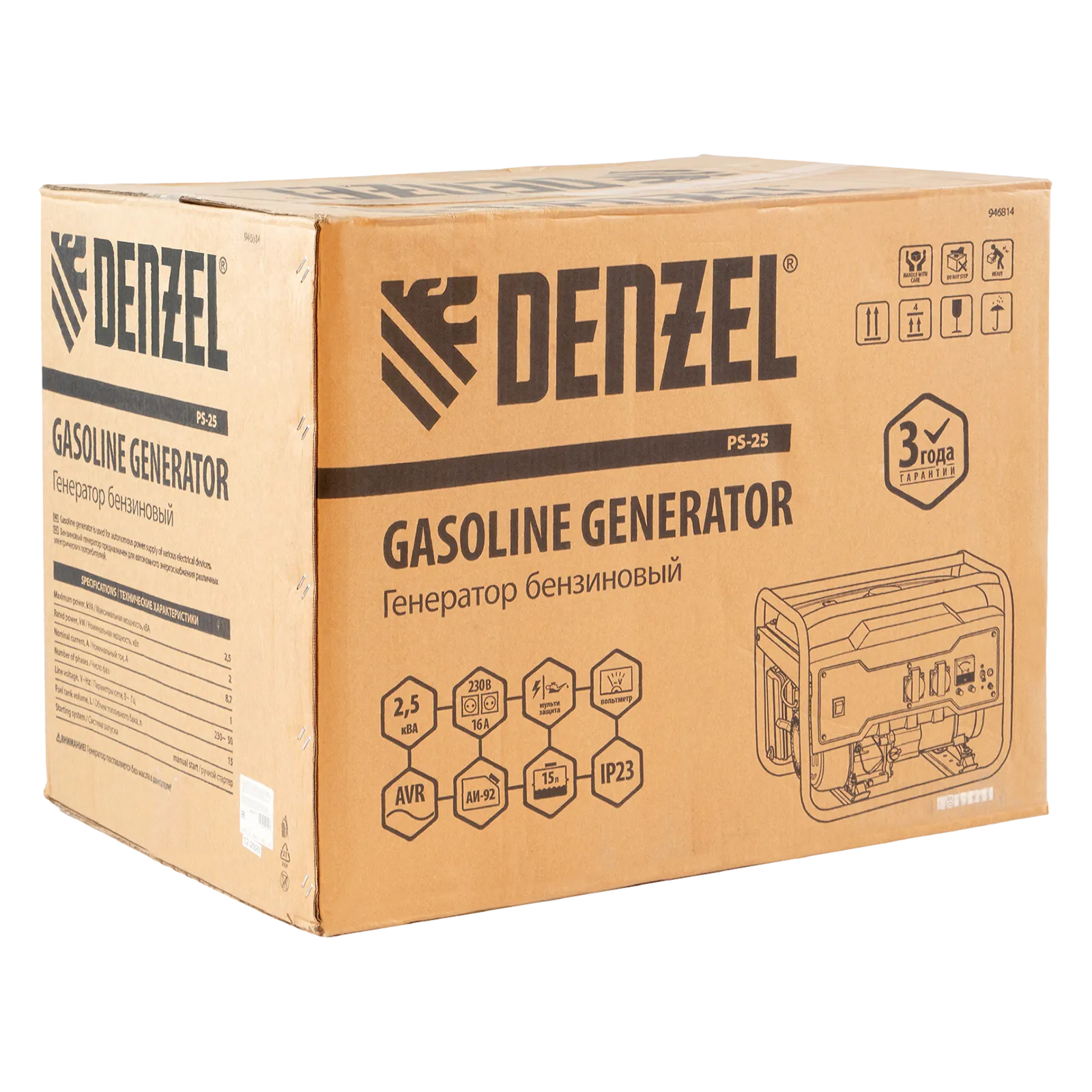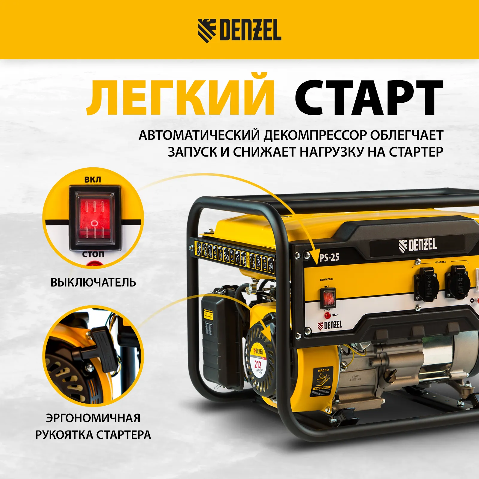 Бензиновый генератор Denzel PS-25 946814 мощностью 2,5 кВт, с баком объемом 15 л, работает от сети 230 В и подходит для дачи, палаточного лагеря, рыбалки, торговой точки. Он дает возможность подключать маломощные приборы и инструменты. Например, можно одновременно подключить 3 лампы накаливания, утюг, пылесос, холодильник. С интуитивно понятным управлением справится даже новичок.