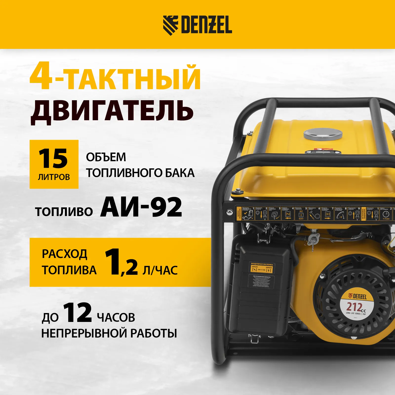 Бензиновый генератор Denzel PS 28 946824 мощностью 2,8 кВт с ручным стартером отлично подойдет для дачного участка, строительной площадки, домашней мастерской, кемпинга, рыбалки. Позволяет одновременно подключать несколько приборов, например, электрочайник, холодильник и 3 лампы дневного освещения. Благодаря увеличенному бензобаку на 15 л устройство будет работать более 12 часов без дозаправки. Экономичный и надежный четырехтактный двигатель мощностью 7 л.с. снижает выхлопы, расход топлива и уровень шума.