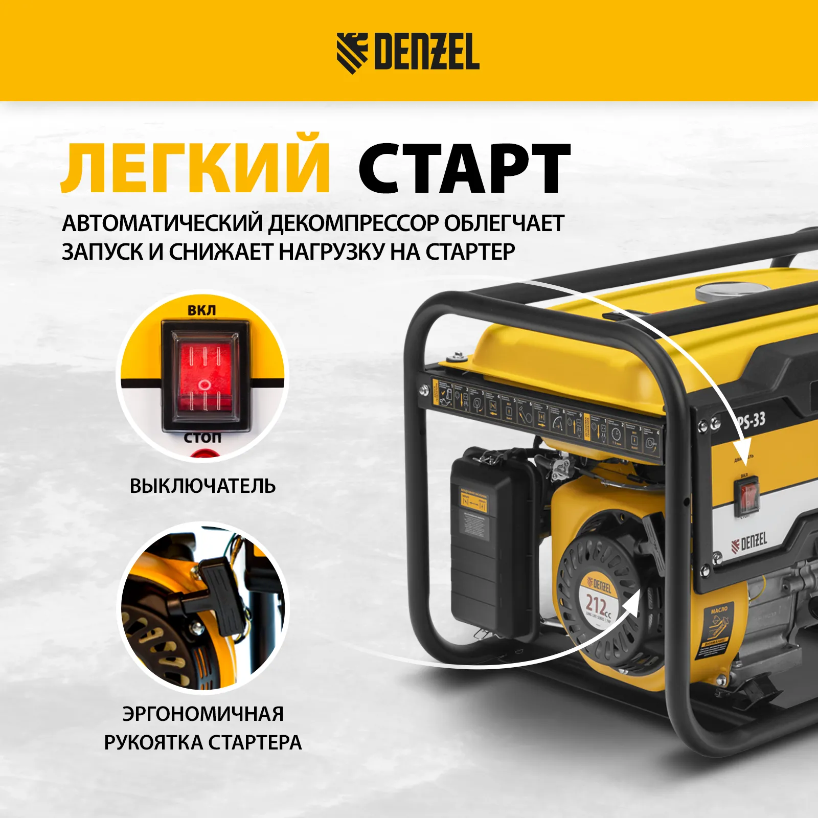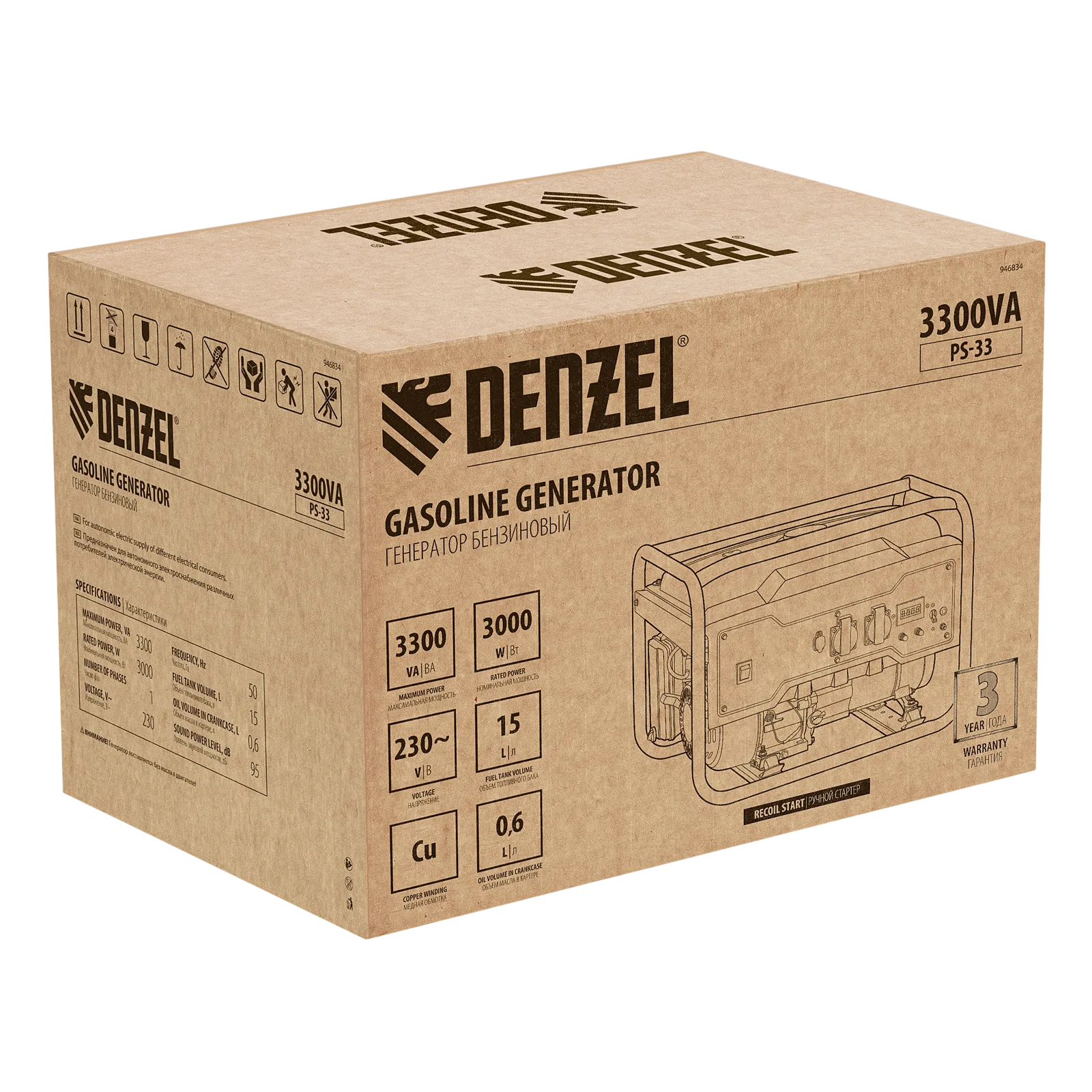 Генератор бензиновый Denzel PS 33 946834 максимальной мощностью 3,3 кВт при параметрах сети 230 В, оснащен ручным стартером и увеличенным бензобаком на 15 л. Предназначен для автономного электроснабжения однофазным током маломощного оборудования. Это экономичная и простая в использовании модель, оптимально подходящая для дачного участка, домашней мастерской, кемпинга и рыбалки, а также строительной площадки.