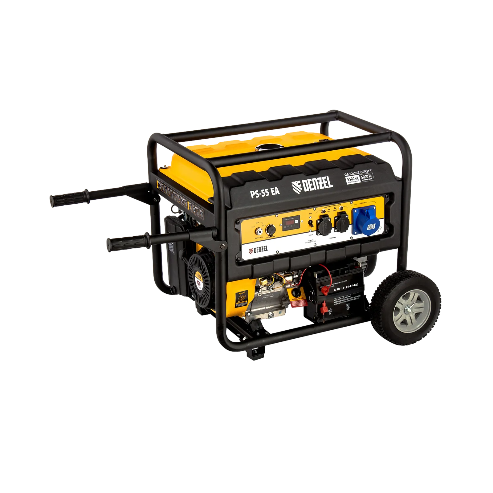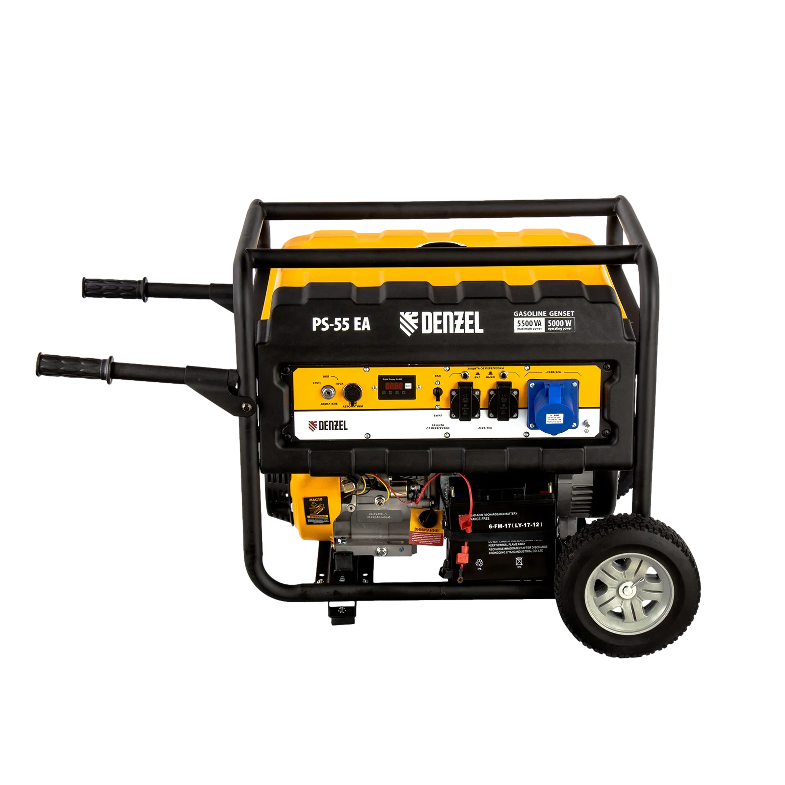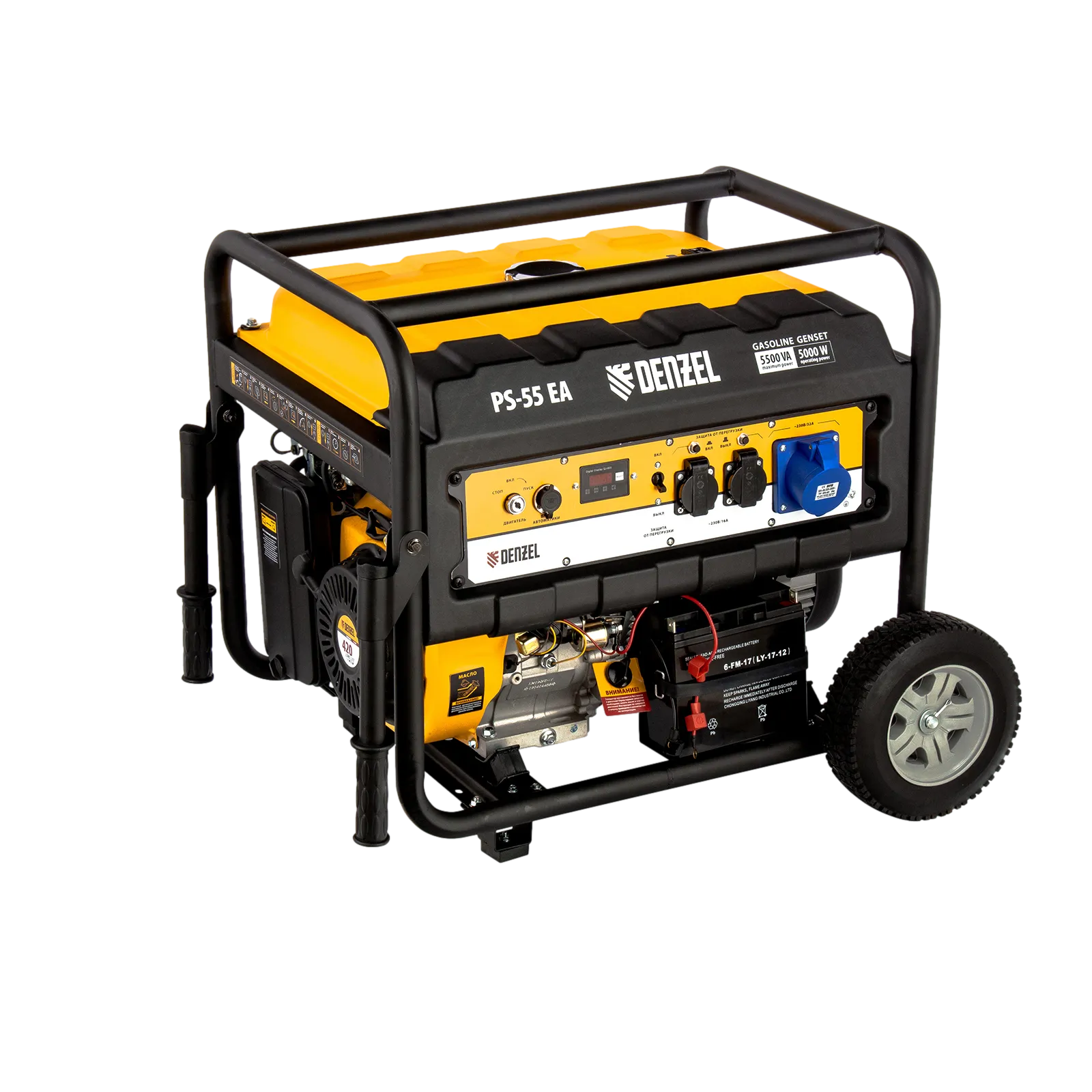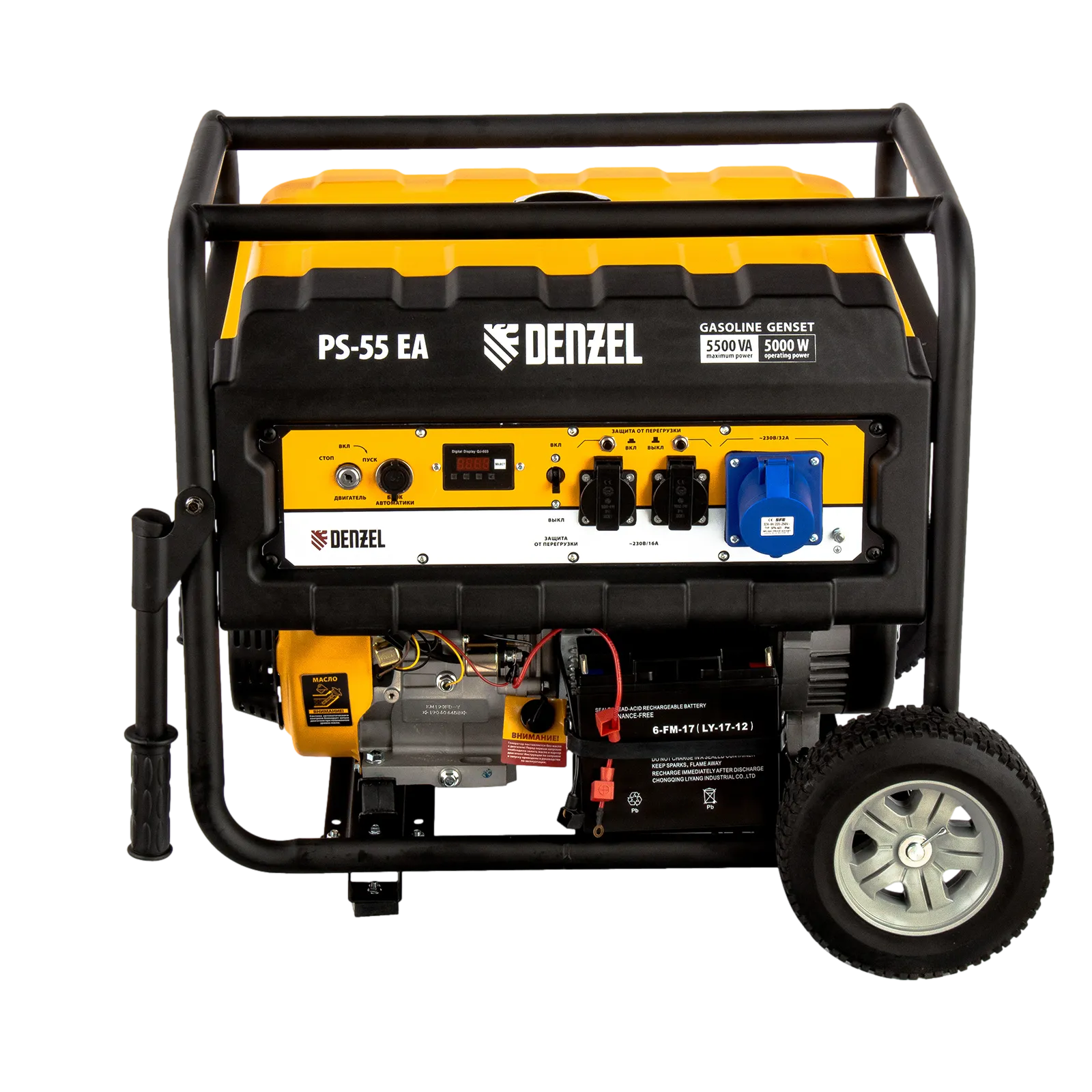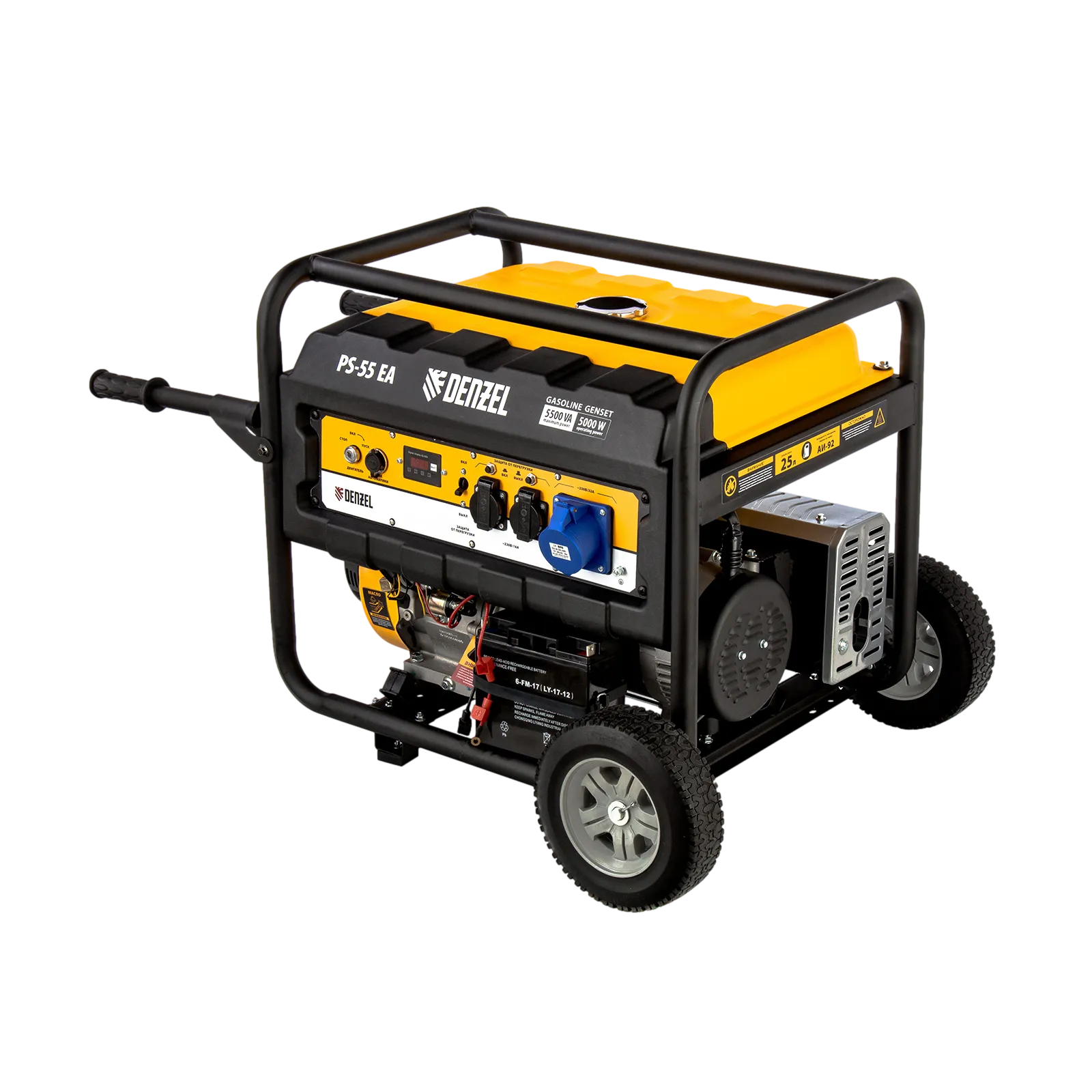 Бензиновый генератор Denzel PS 55 EA 946874 мощностью 5,5 кВт, с коннектором автоматики и электростартером, имеет бак объемом 25 л и поддерживает напряжение в сети 230 В. Подходит для подключения мощных электроинструментов и бытовых приборов, незаменим в условиях отсутствия электричества. В доме можно одновременно использовать 3 лампы накаливания, холодильник, телевизор, утюг, электрочайник. На стройплощадке можно подключить шлифовальную машину, дрель, циркулярную пилу, бетономешалку, компрессор. Выход постоянного тока USB 5 В позволяет использовать генератор для зарядки смартфона, планшета и других мобильных устройств.