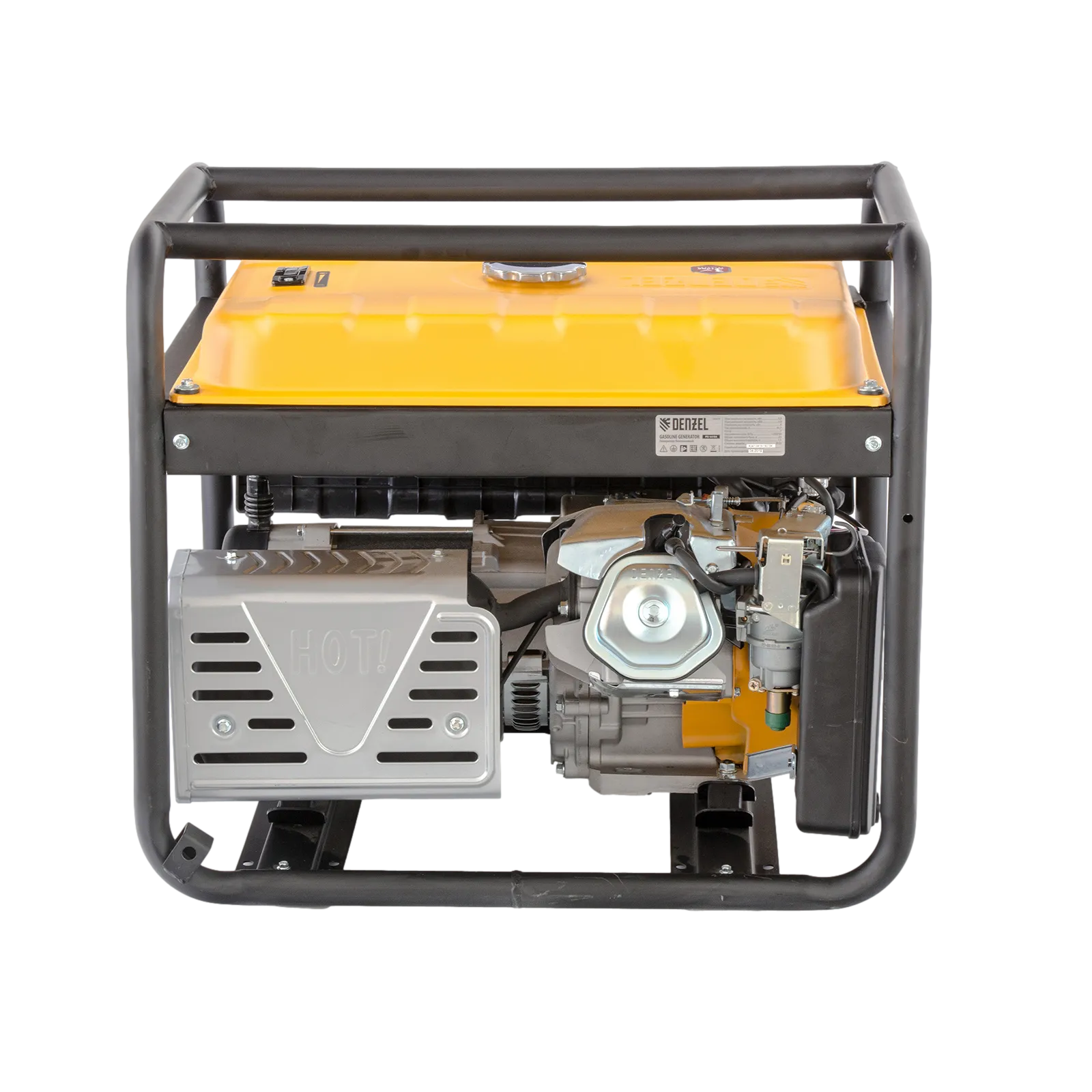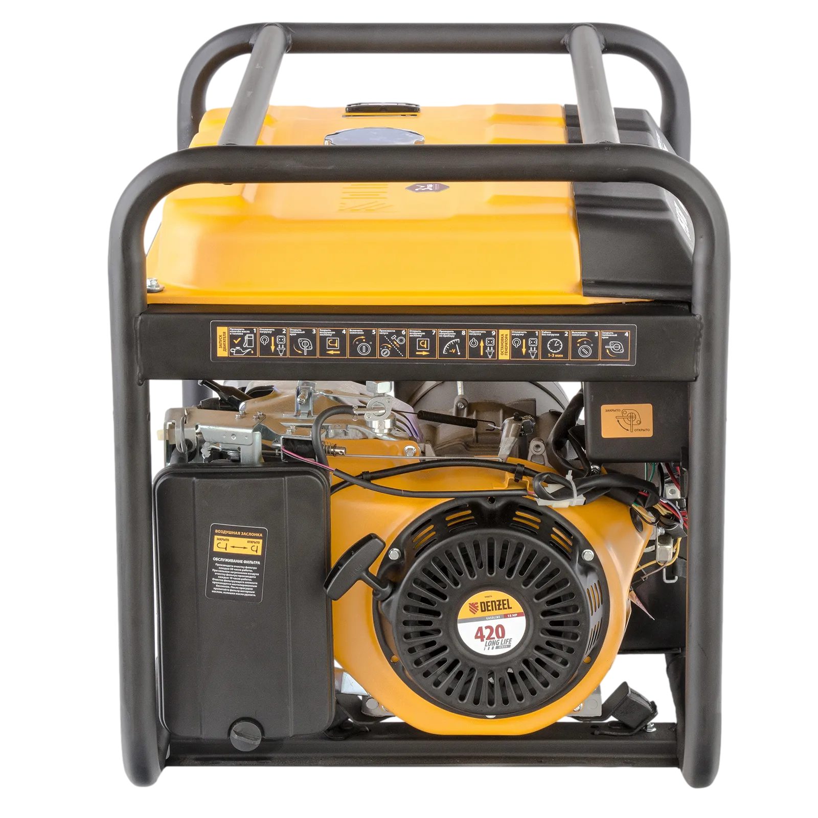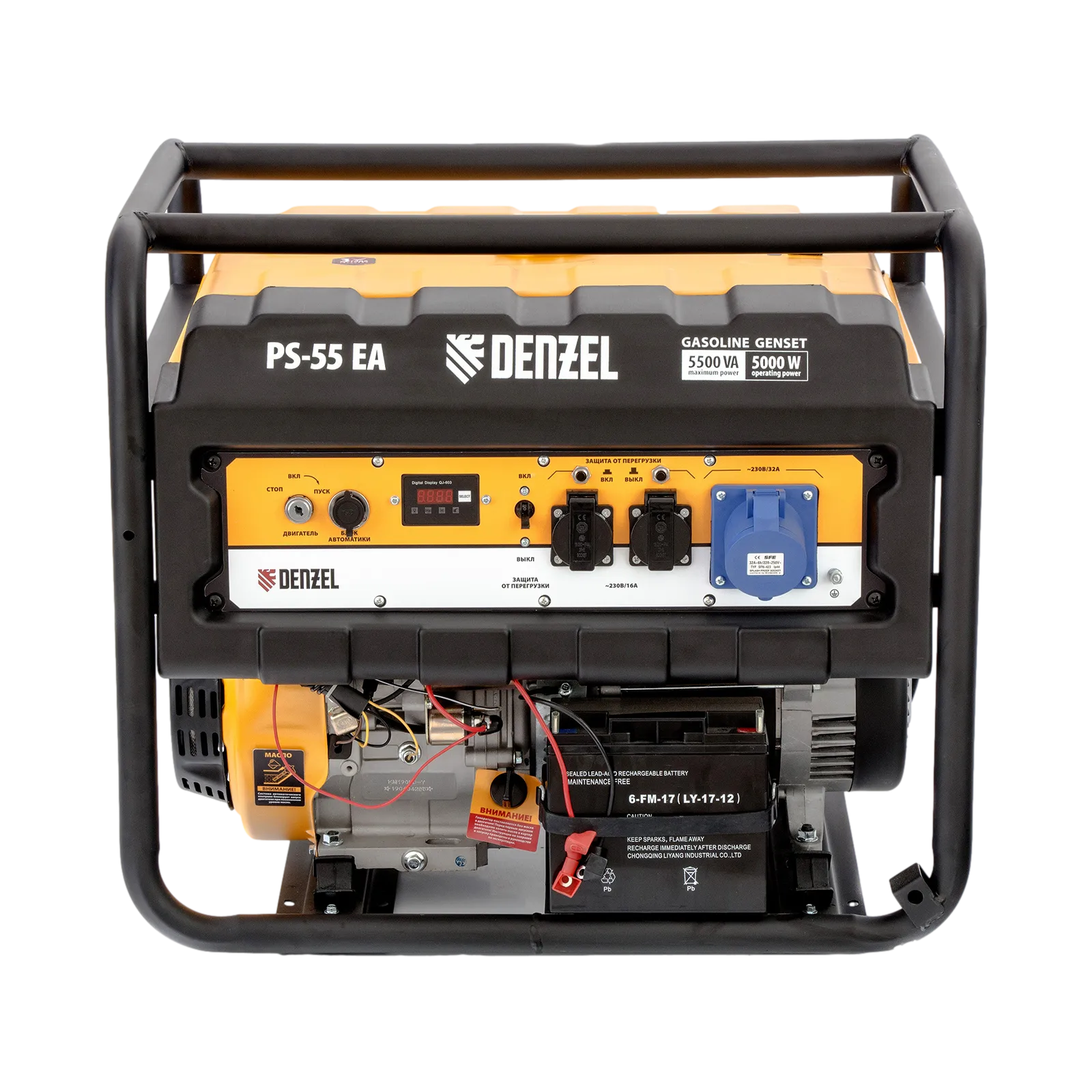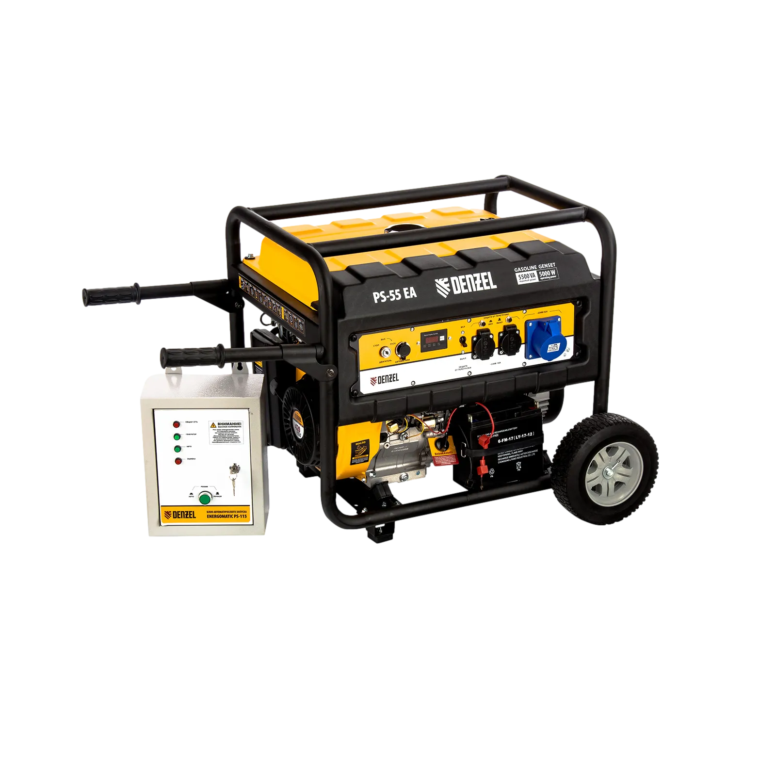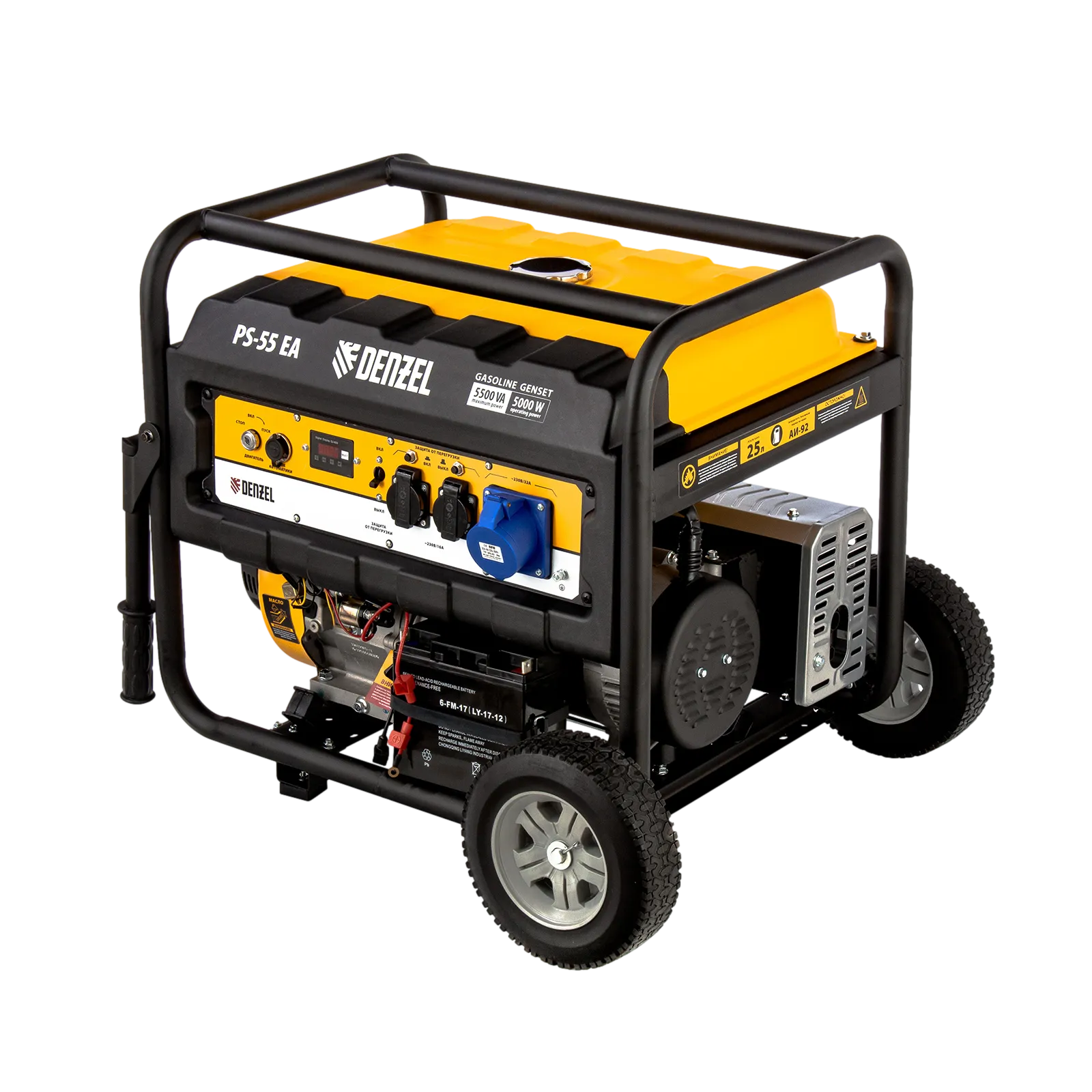 Бензиновый генератор Denzel PS 55 EA 946874 мощностью 5,5 кВт, с коннектором автоматики и электростартером, имеет бак объемом 25 л и поддерживает напряжение в сети 230 В. Подходит для подключения мощных электроинструментов и бытовых приборов, незаменим в условиях отсутствия электричества. В доме можно одновременно использовать 3 лампы накаливания, холодильник, телевизор, утюг, электрочайник. На стройплощадке можно подключить шлифовальную машину, дрель, циркулярную пилу, бетономешалку, компрессор. Выход постоянного тока USB 5 В позволяет использовать генератор для зарядки смартфона, планшета и других мобильных устройств.