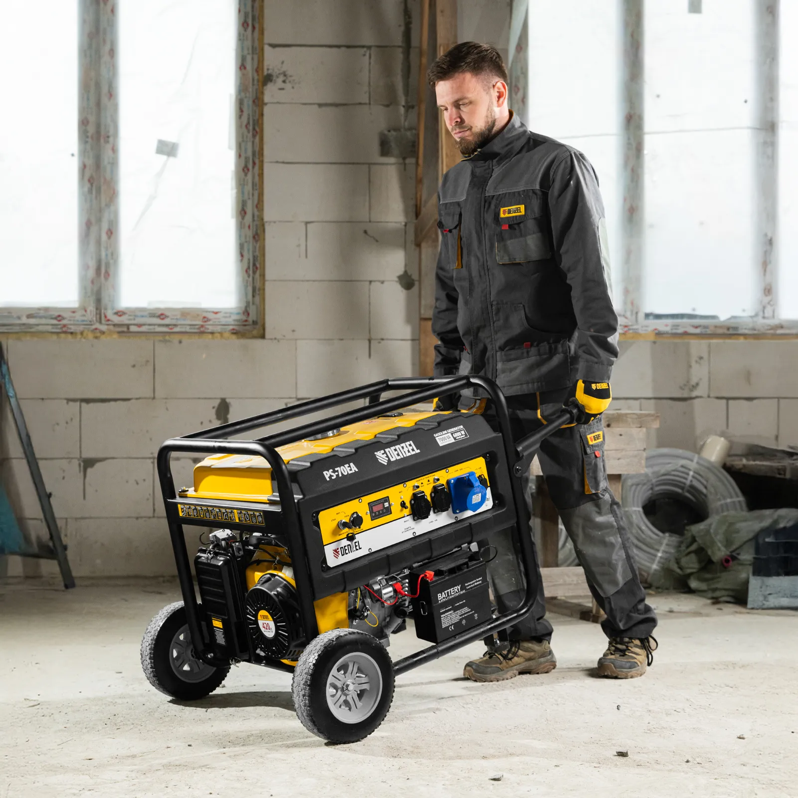 - Есть возможность установки транспортировочного комплекта (колеса, ручки) арт. 946725 , который значительно облегчает транспортировку генератора (приобретается отдельно).