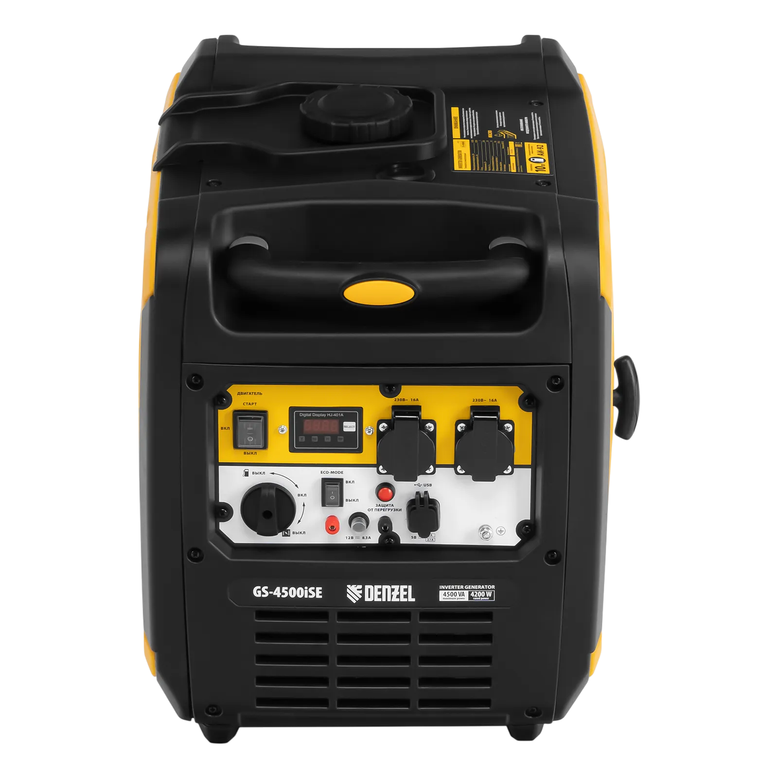 Инверторный генератор Denzel GS-4500iSE 94714 мощностью 4,5 кВт оснащен электростартером и поддерживает напряжение 230 В. Используется в качестве автономного источника электроэнергии для бытовой техники, электроинструмента, осветительных приборов, незаменим в загородном доме. Для подключения потребителей предусмотрено 2 розетки переменного тока 230 В/16 А. Клеммы постоянного тока 12 В позволяют заряжать автомобильные аккумуляторы, а выход USB 5 В — мобильные устройства. Генератор обеспечивает подачу электроэнергии высокого качества и оптимален для подключения чувствительных приборов: газовых котлов, цифровых устройств, серверов и т.д.