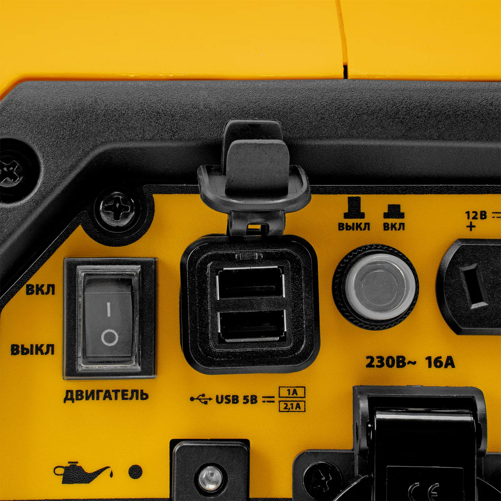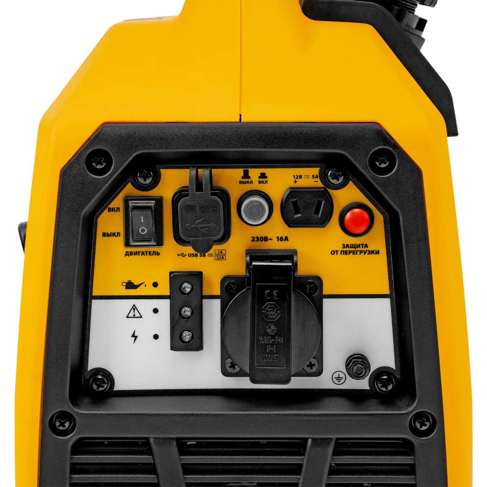 - Защита от поломки — при низком уровне масла в картере двигатель не запускается, при перегрузке подача питания автоматически прекращается, также срабатывают специальные индикаторы.