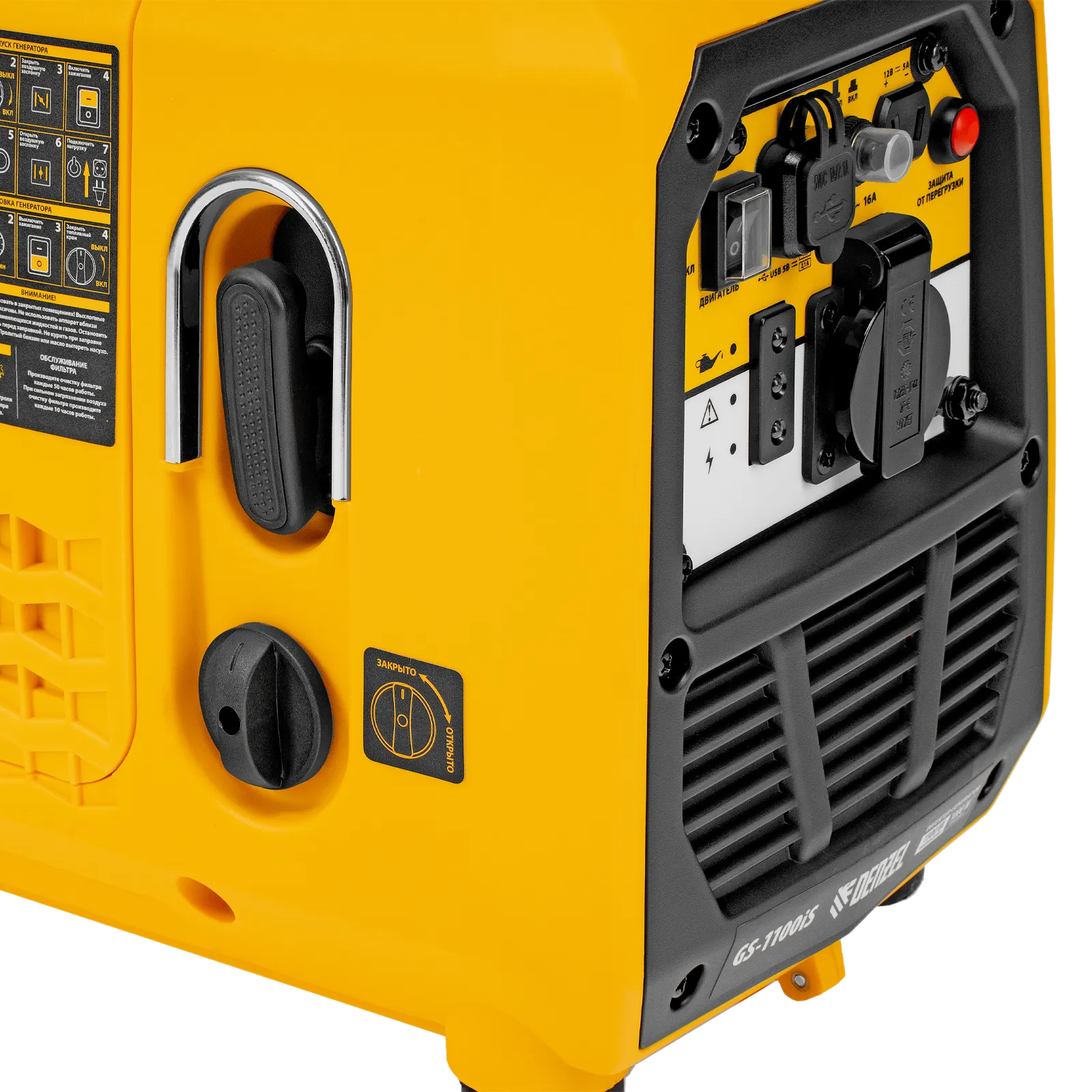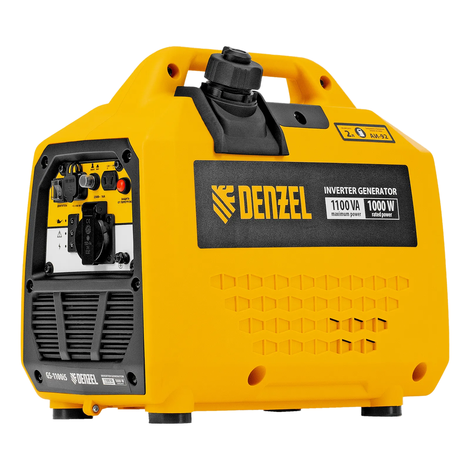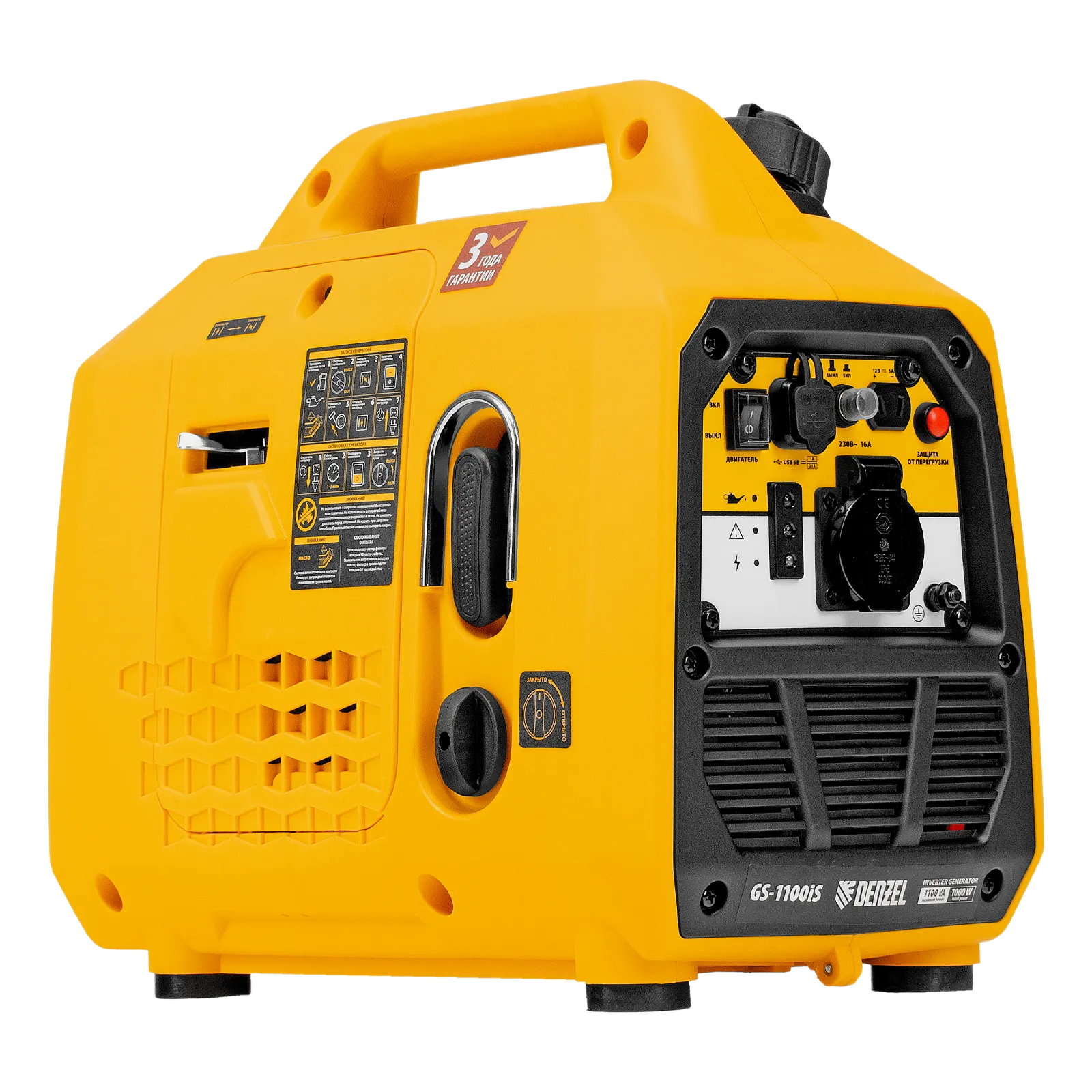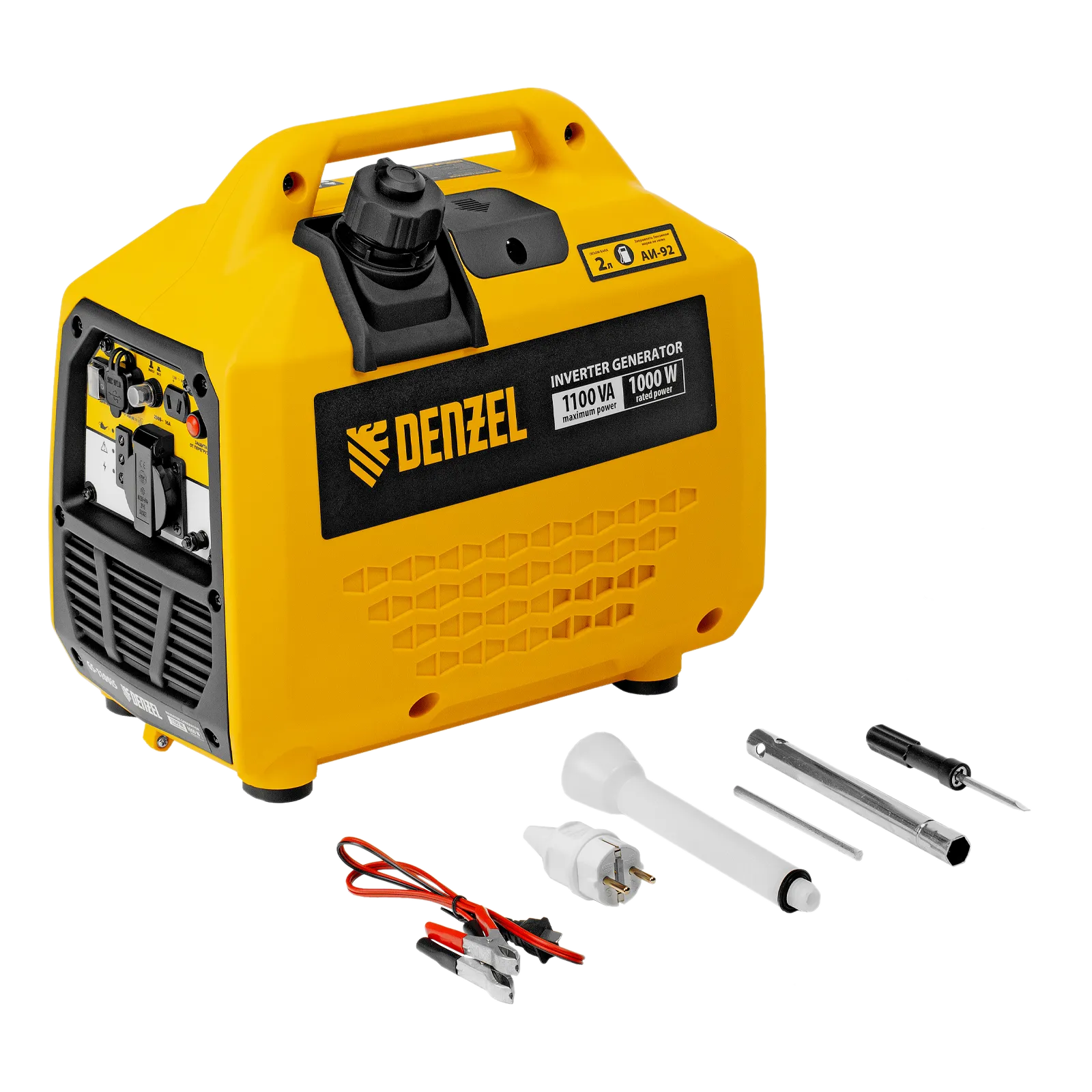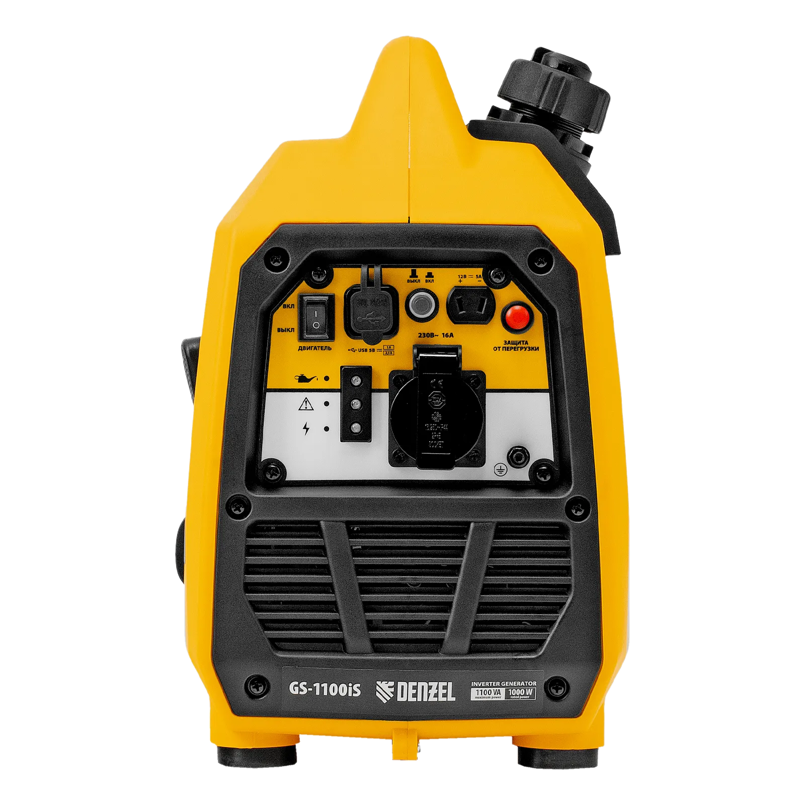 Генератор инверторный Denzel GS-1100iS 94718 максимальной мощностью 1,1 кВт, в закрытом корпусе и с ручным стартом, поддерживает напряжение 230 В. Незаменим при отсутствии электросети: к нему можно подключать осветительные приборы, электроинструмент, бытовую технику. Для этого предусмотрена розетка 230 В/16 A, закрытая специальной крышкой для защиты от пыли и влаги. Генератор обеспечивает высокое качество электрической энергии и подходит для работы с серверами, цифровой техникой и т.д. Выход 12 В позволяет заряжать автомобильные аккумуляторы. Также предусмотрена возможность обеспечения электропитанием мобильной техники: смартфонов, планшетов и т.д. Генератор пригодится в загородном доме, на рыбалке и т.д.