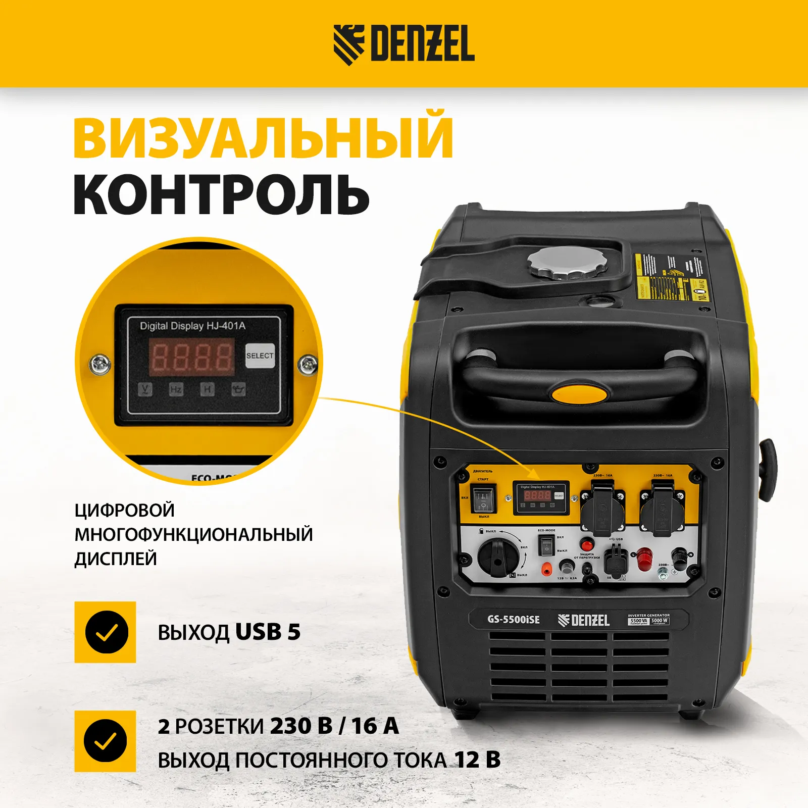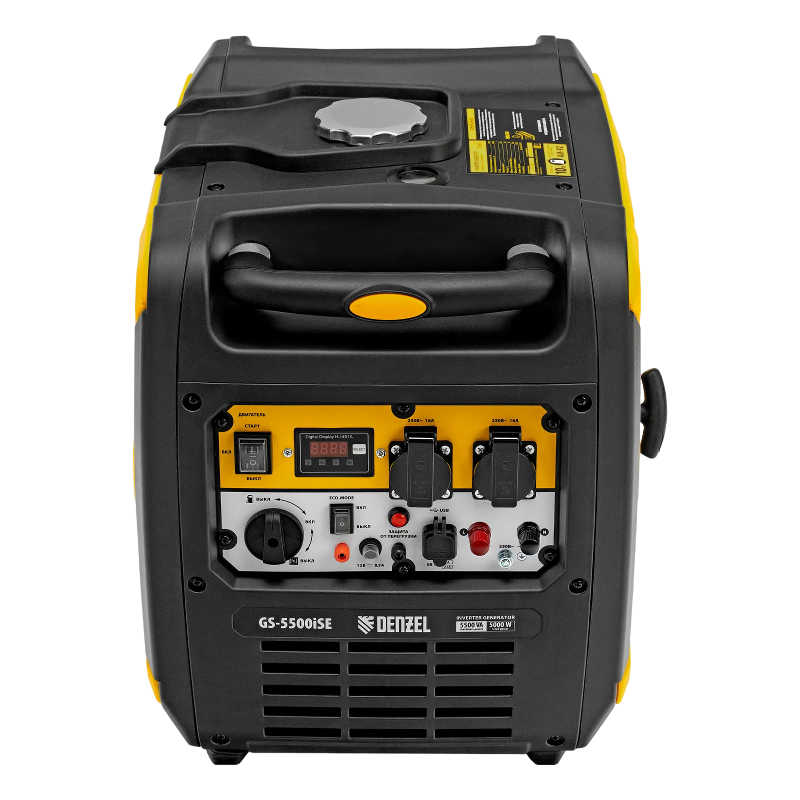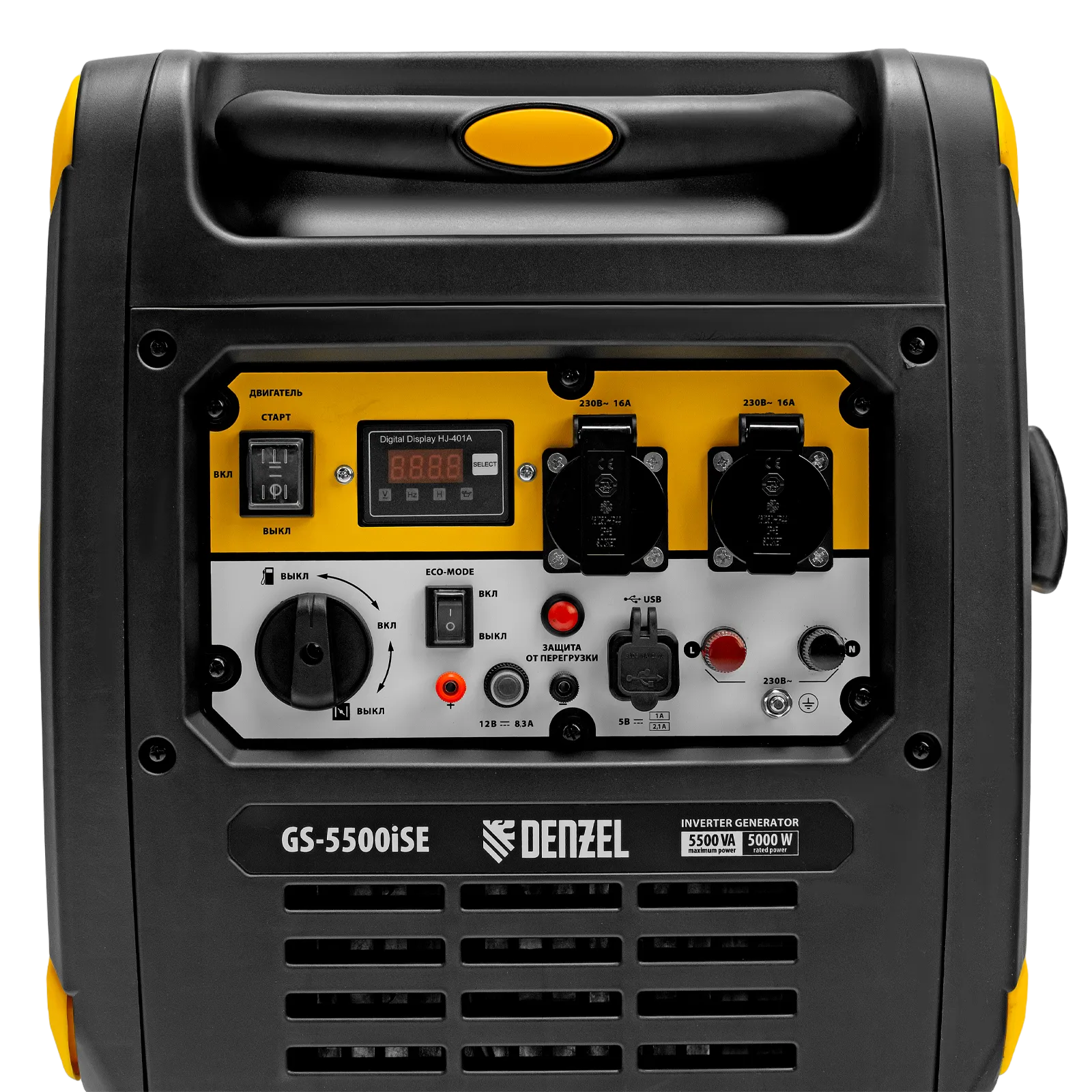 Генератор инверторный Denzel GS-5500iSE 94712 максимальной мощностью 5,5 кВт, в закрытом корпусе, с электростартером, поддерживает напряжение в сети 230 В и используется для обеспечения работоспособности бытовой техники, электроинструмента и осветительных приборов в условиях отсутствия бытовой сети. Для подключения потребителей предусмотрено две розетки 230 В / 16 А. Выход USB 5 В позволяет подключать мобильное устройство, например, смартфон или планшет, а клеммы постоянного тока 12 В служат для зарядки автомобильных аккумуляторов. Предусмотрена возможность снятия полной мощности одним потребителем: на панели управления имеются силовые клеммы. Генератор незаменим в загородном доме.
