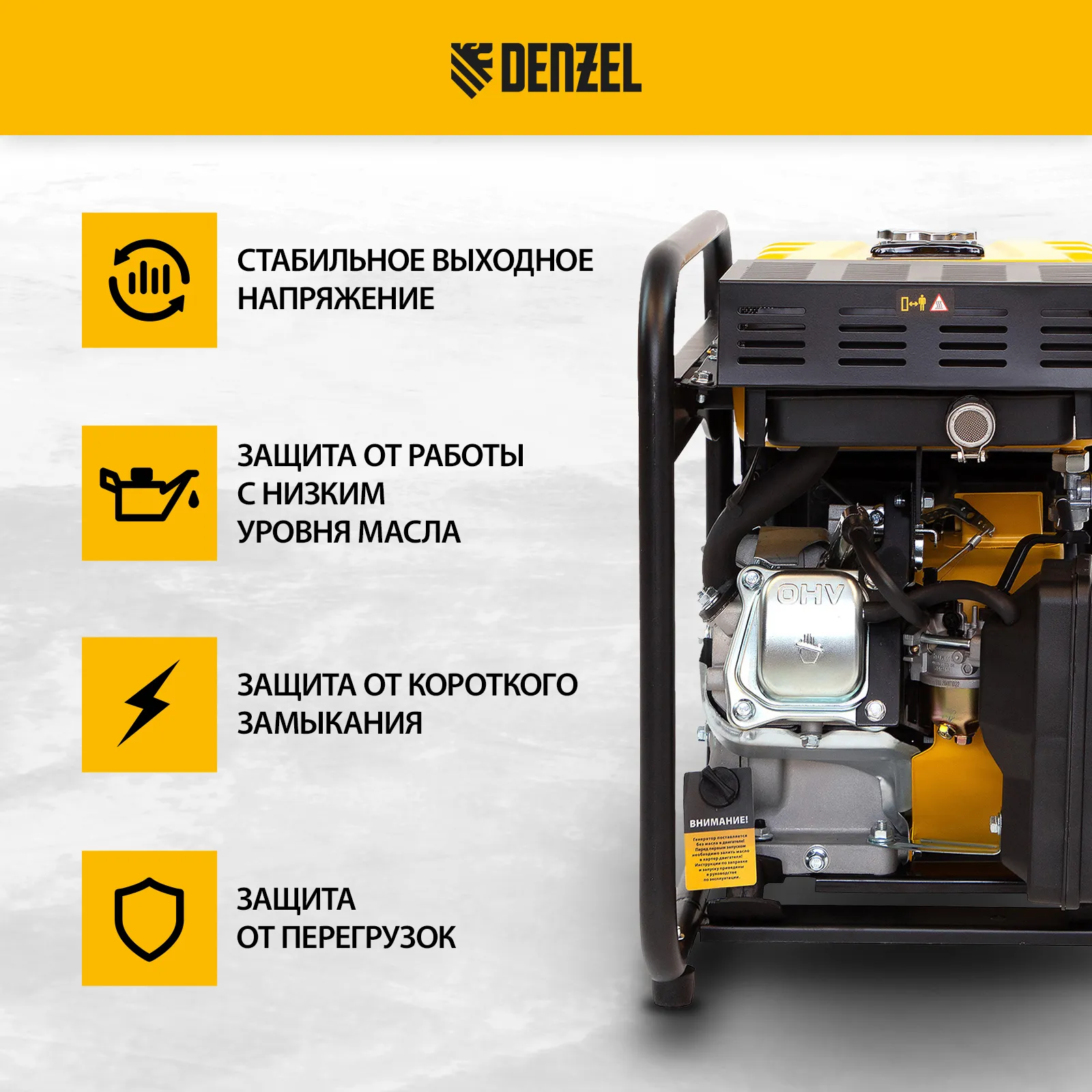 Инверторный генератор Denzel GT-2500iF 94704 мощностью 2,5 кВт, в открытом корпусе, с ручным стартом, — легкий и экономичный, но при этом достаточно мощный, с ним легко справится даже неопытный пользователь. Идеально подходит для использования на даче, в гараже, в мастерской и на природе. Четырехтактный двигатель Denzel Long Life мощностью 7 л.с. и объемом 212 куб. см работает стабильно и имеет относительно невысокий уровень шума (96 дБ) и вибраций. Прочная рама защищает рабочие элементы от повреждений в процессе работы и транспортировки.