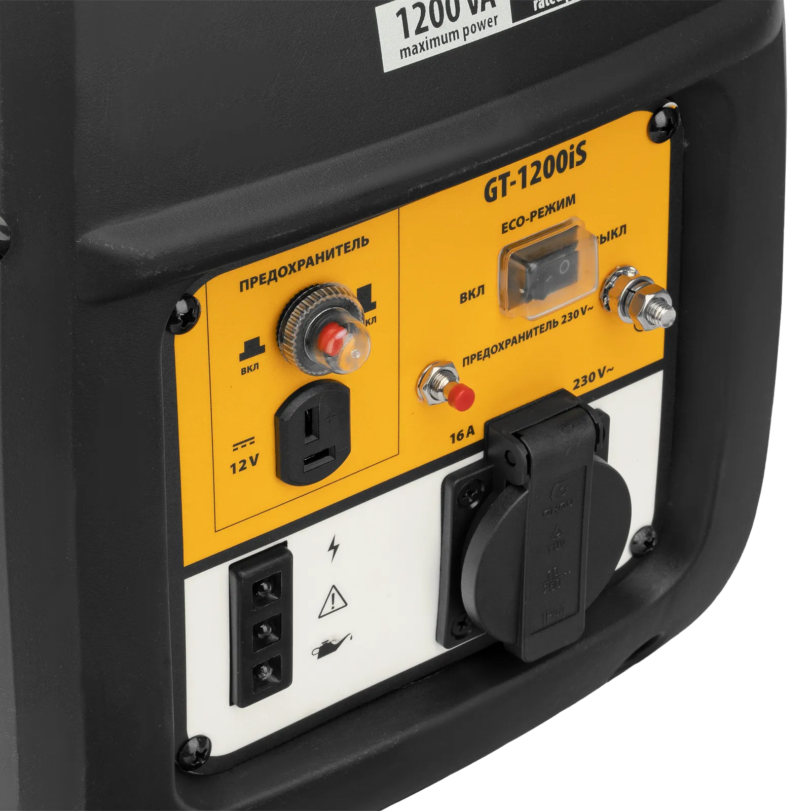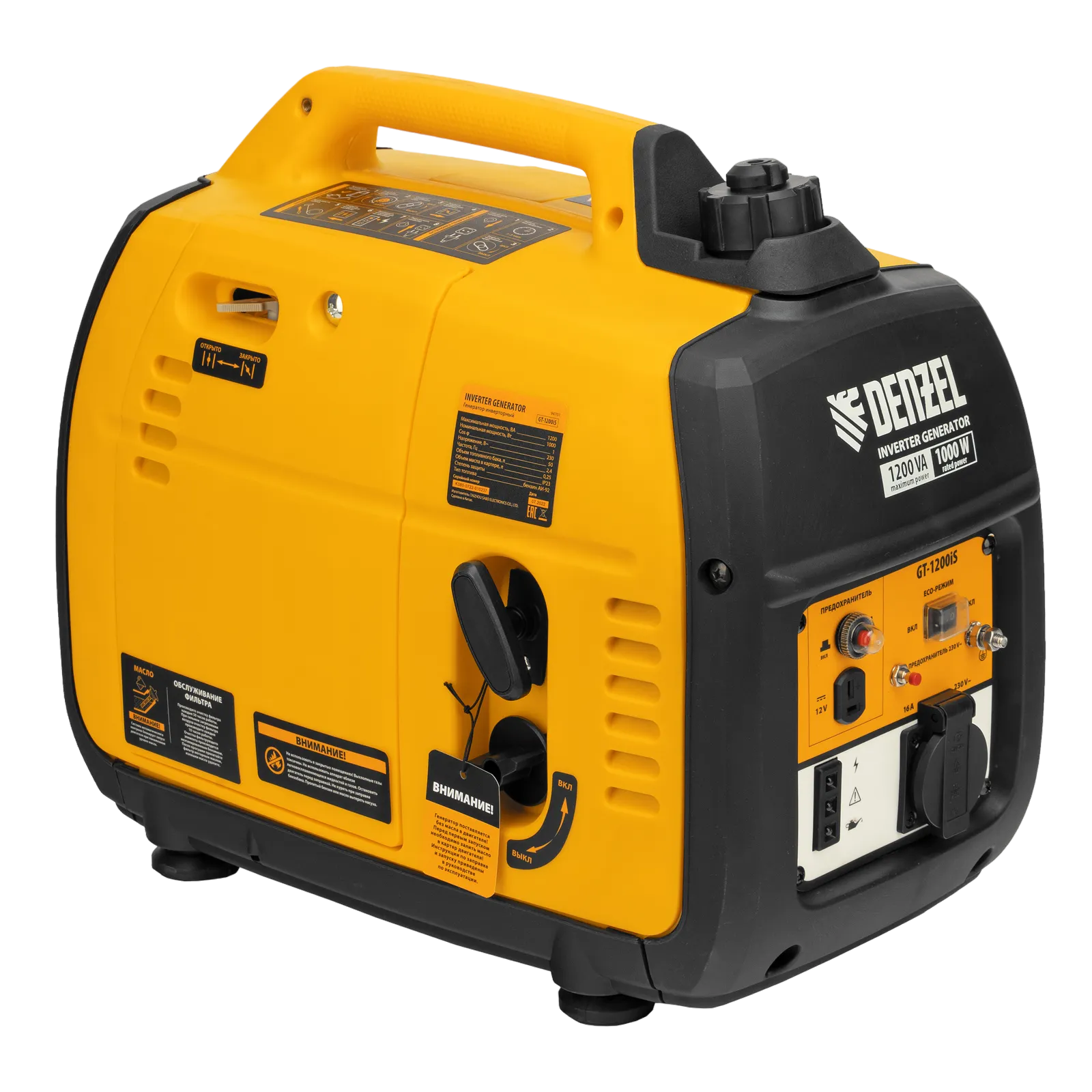 Инверторный генератор Denzel GT-1200iS 94701 мощностью 1,2 кВт, в закрытом корпусе, с ручным стартом, — самый компактный, легкий и экономичный в своей линейке, с ним легко справится даже неопытный пользователь. Идеально подходит для выездов на природу и рыбалку, также будет незаменим на дачном участке и в торговой палатке. Четырехтактный двигатель мощностью 1,8 л.с. и объемом 53,5 куб. см работает стабильно и имеет небольшой уровень шума 52 дБ.