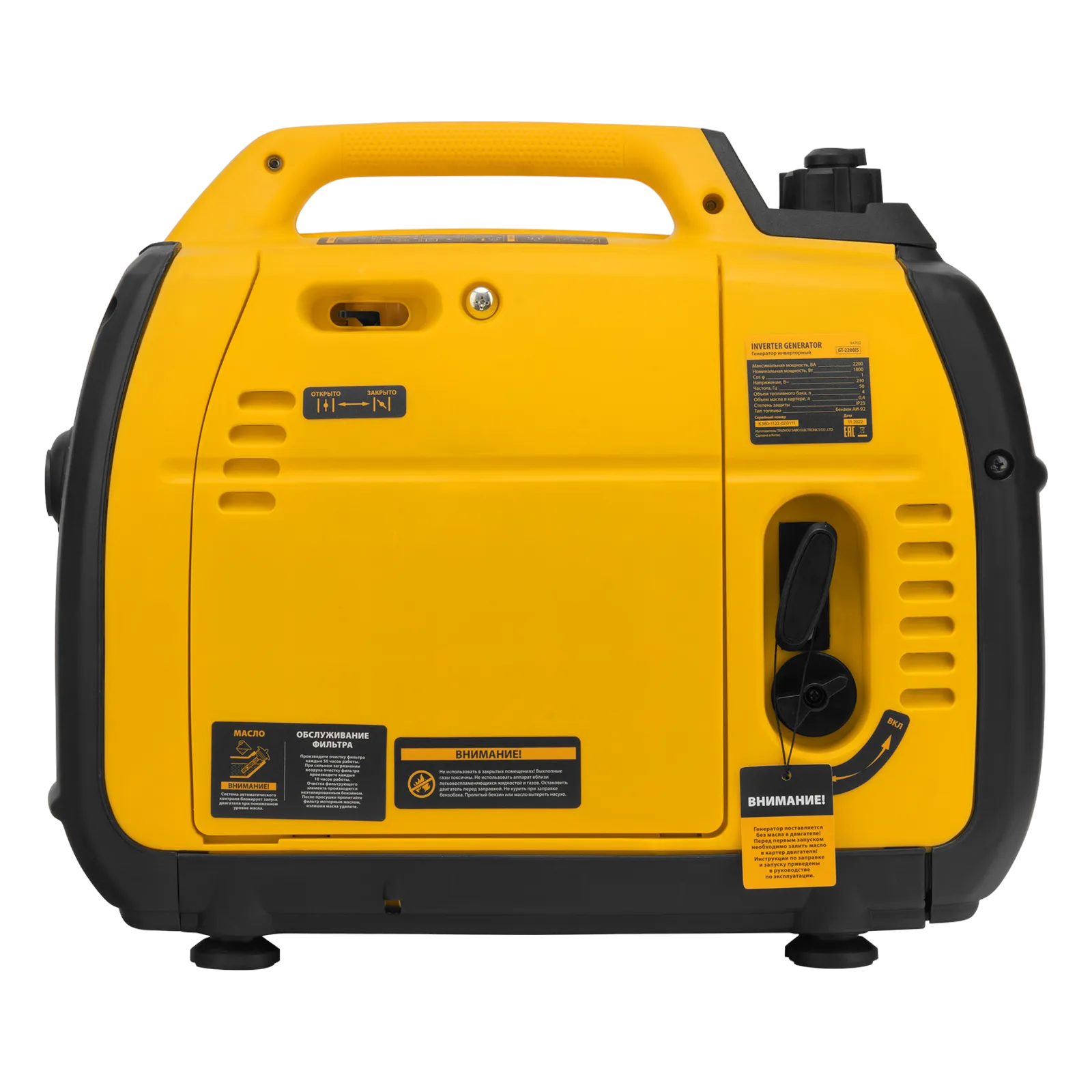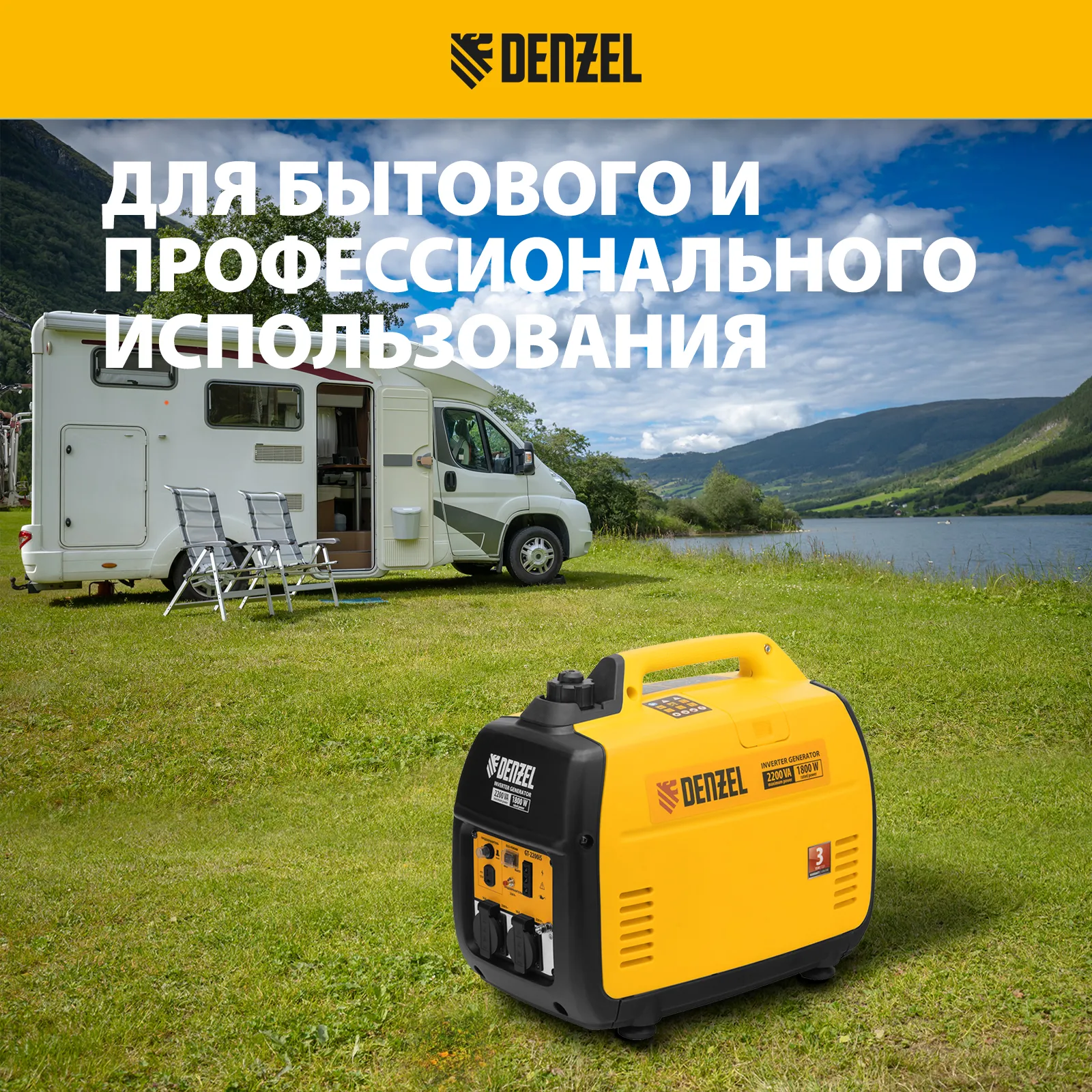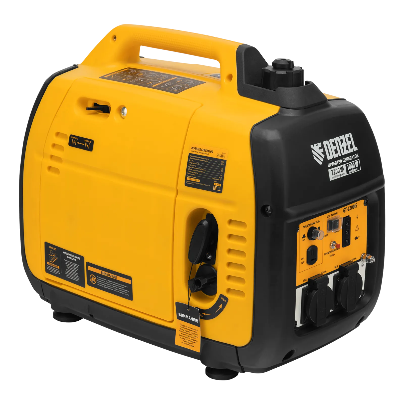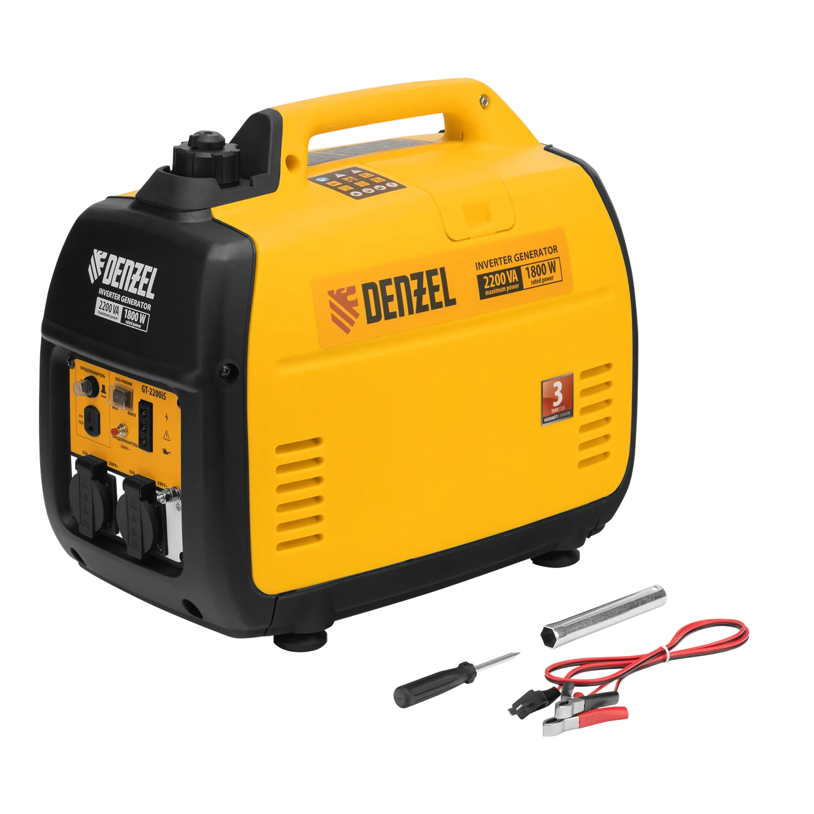 Инверторный генератор Denzel GT-2200iS 94702 мощностью 2,2 кВт, в закрытом корпусе, с ручным стартом, — легкий и экономичный, но при этом достаточно мощный, с ним легко справится даже неопытный пользователь. Идеально подходит для выездов на природу и рыбалку, но также будет незаменим на дачном участке и в торговой палатке. Четырехтактный двигатель мощностью 3,2 л.с. и объемом 113 куб. см работает стабильно и имеет небольшой уровень шума 57 дБ.