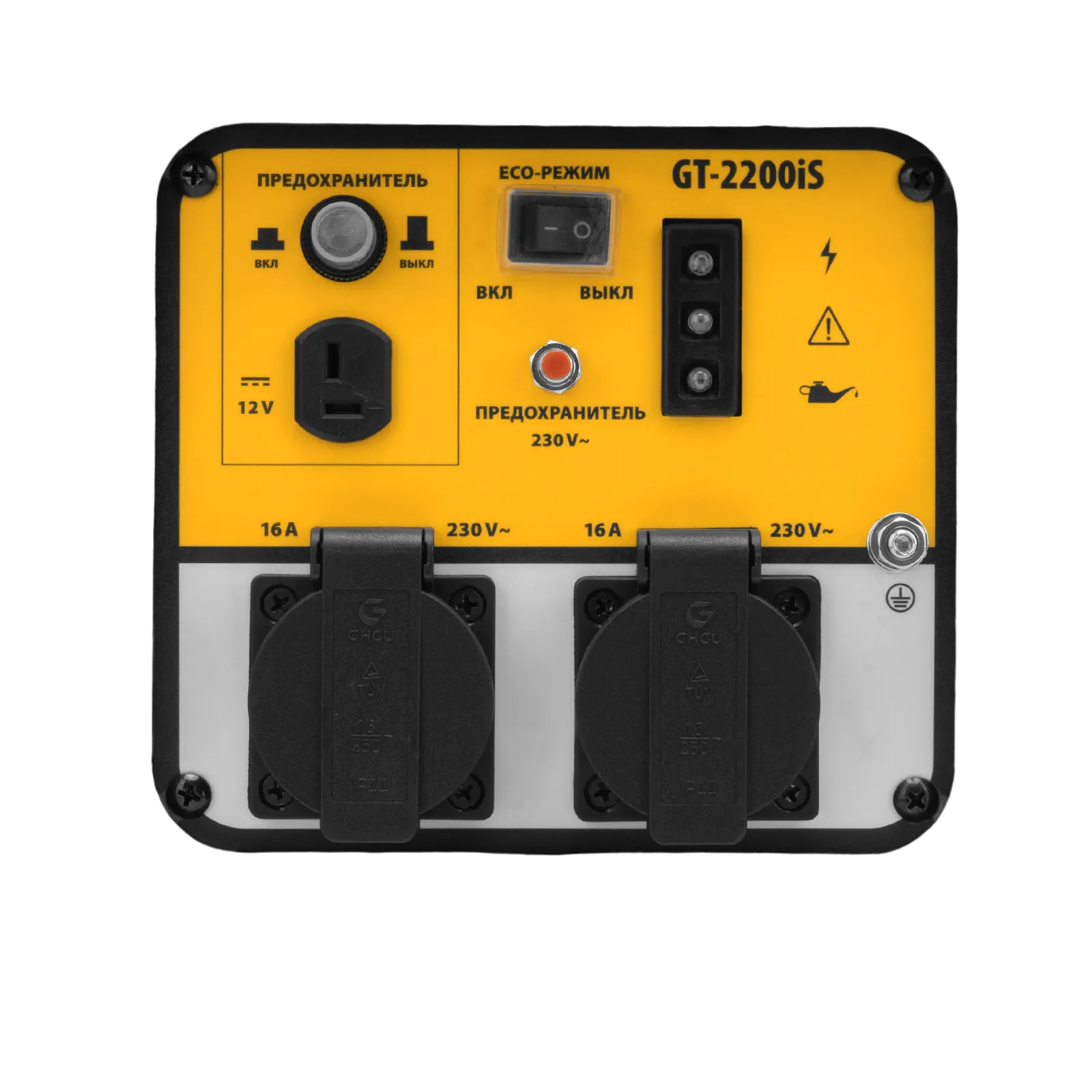 - Визуальный контроль — индикаторы на передней панели информируют о работе генератора, недостаточном уровне топлива и о перегрузке.
