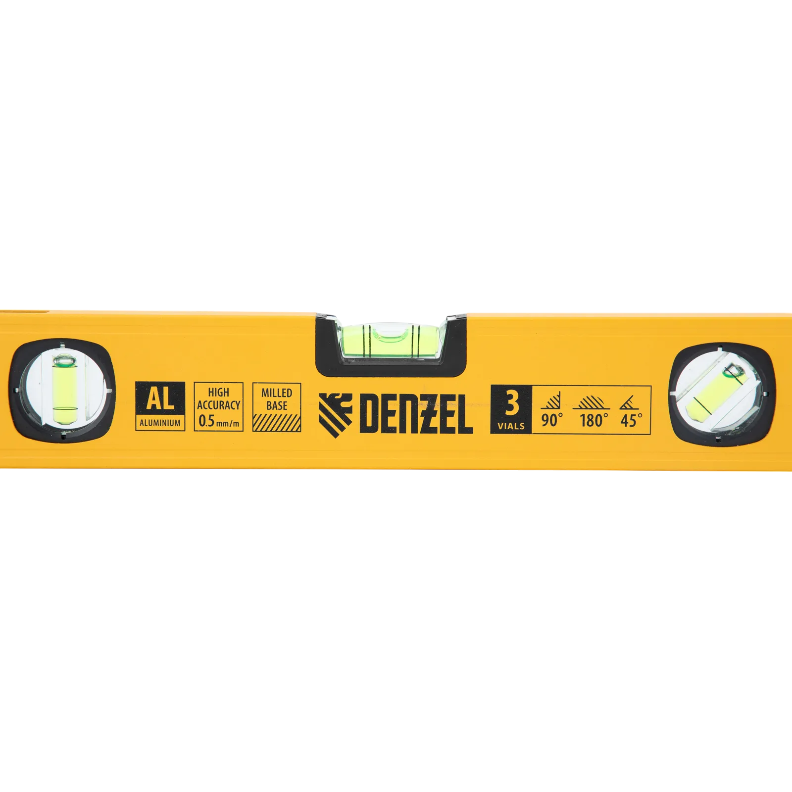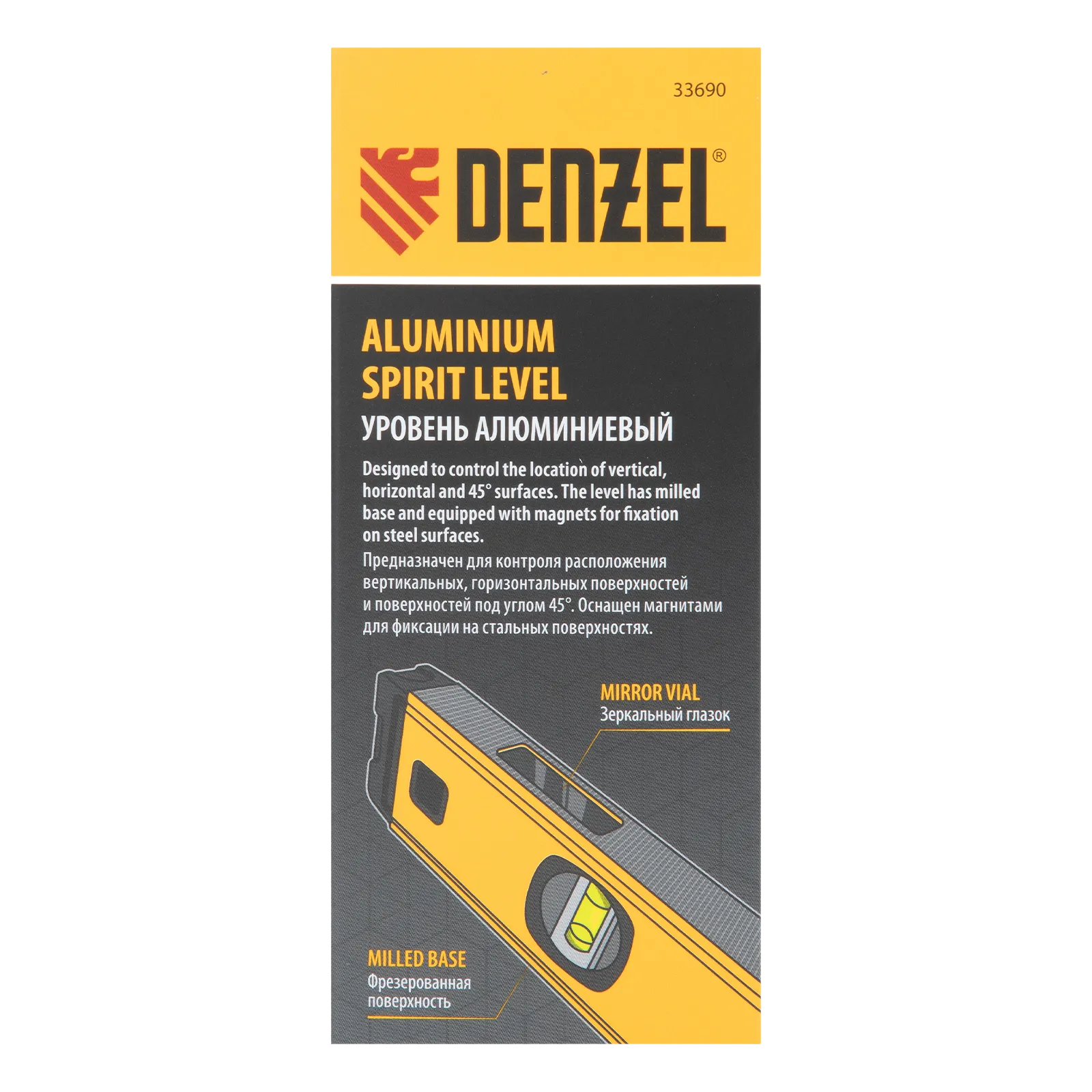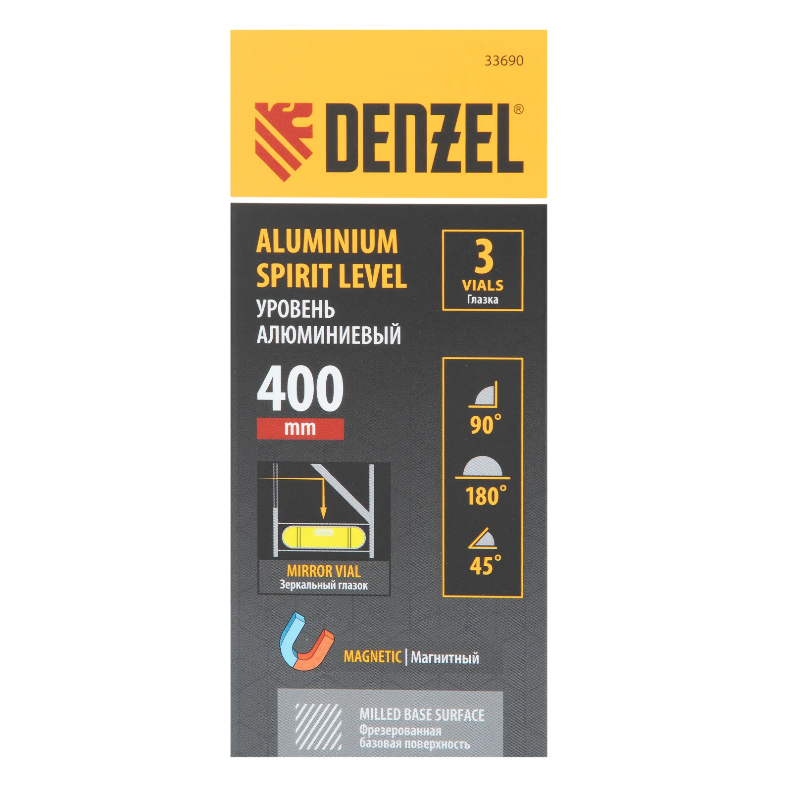 Алюминиевый фрезерованный уровень Denzel 33690 длиной 400 мм, с магнитом и 3 глазками, из которых 1 зеркальный, предназначен для контроля отклонений от горизонтальной, вертикальной и поверхности под углом 45° с точностью 0,5 мм/м. 3 пузырьковые камеры 90°, 180° и 45° позволяют быстро проверить правильность разметки. Инструмент незаменим при проведении строительных, ремонтных, сантехнических работ.