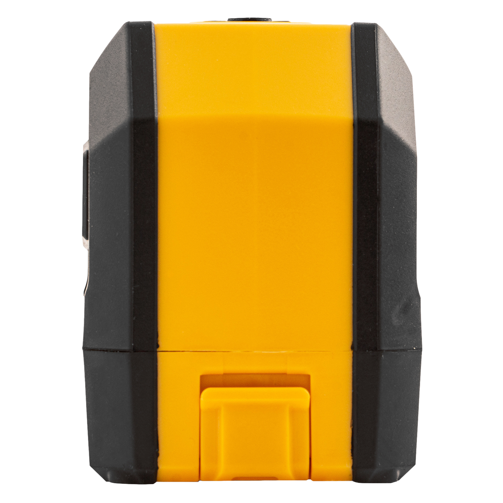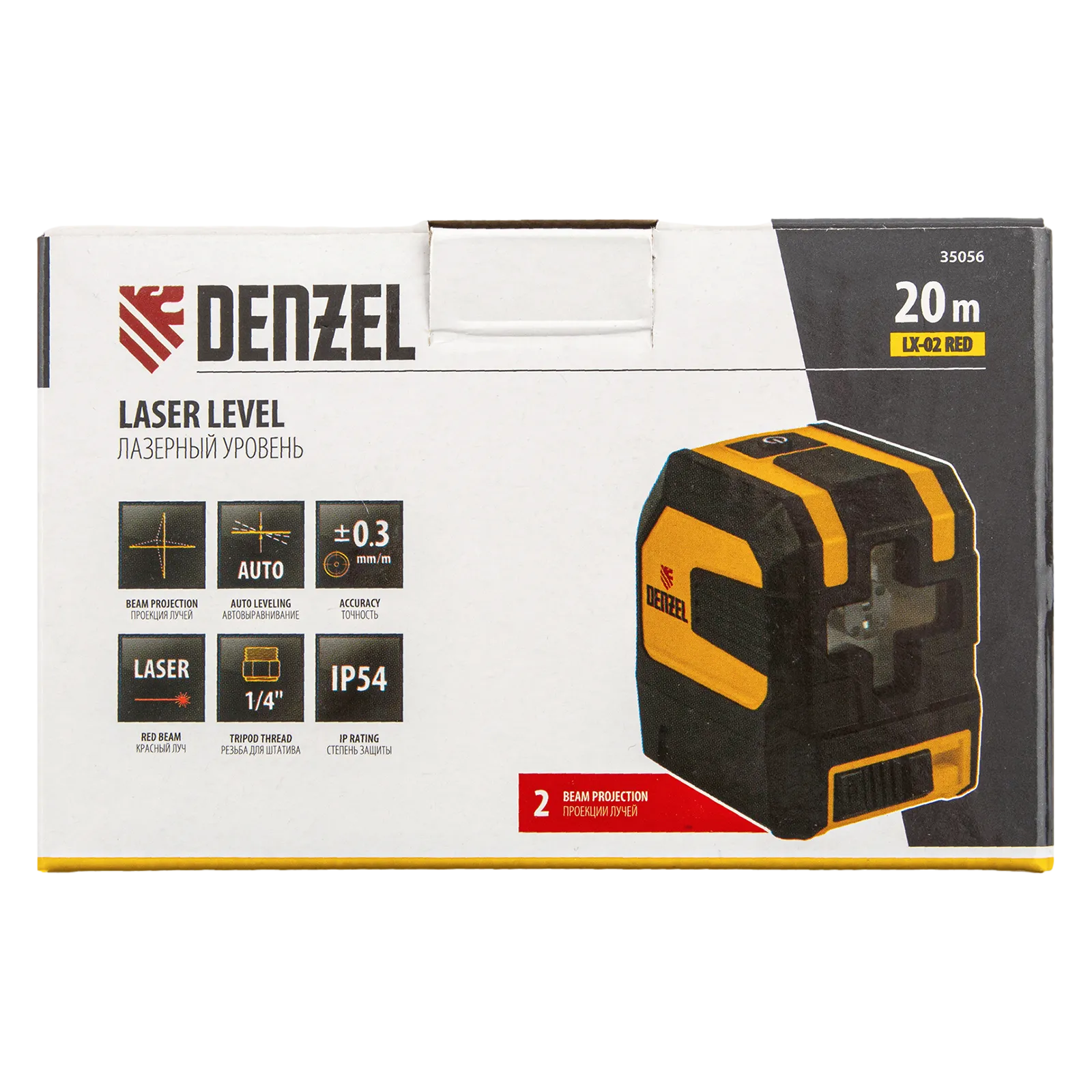 Лазерный уровень Denzel LX 02 35056 с резьбой 1/4" под штатив имеет точность ±0,3 мм/1 м и проецирует вертикальную и горизонтальную линию на расстояние до 20 м при помощи красных лучей 635 нм. Используется для построения разметки на стенах, полу и потолке. Пригодится во время укладки плитки, монтажа подвесных потолков, установки оконных рам, а также проведения других ремонтных и отделочных работ.