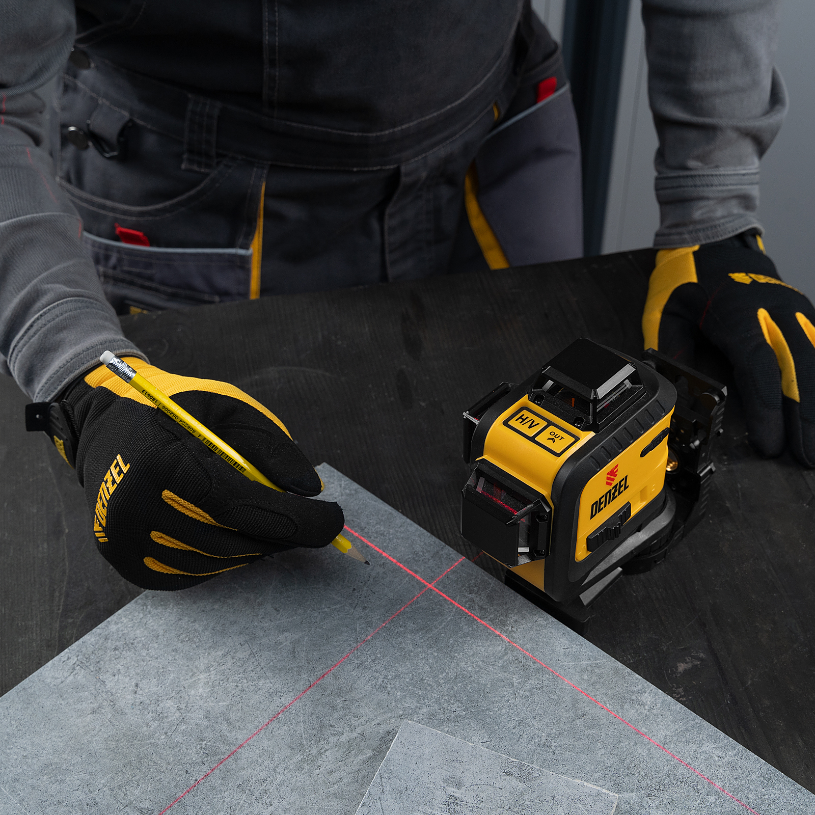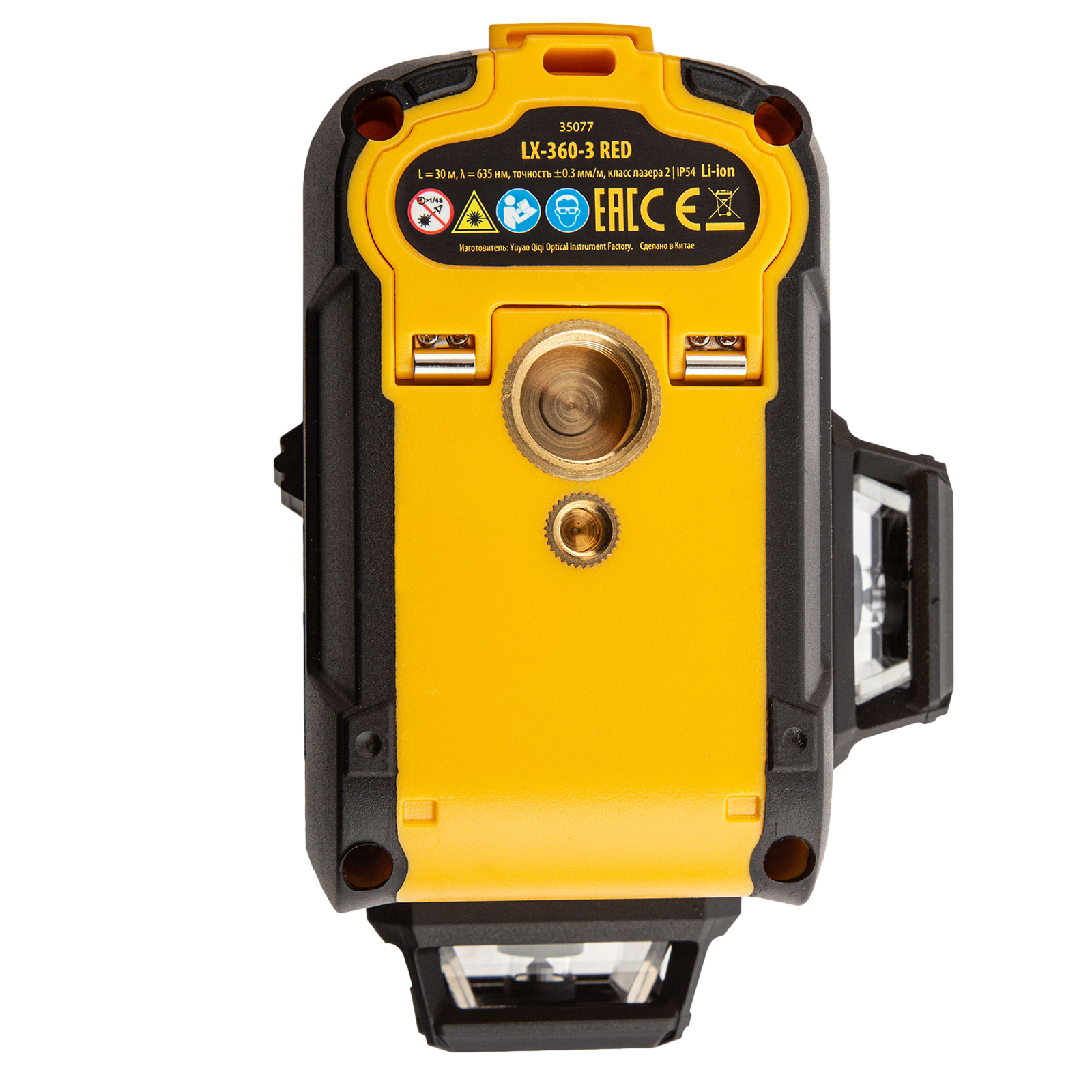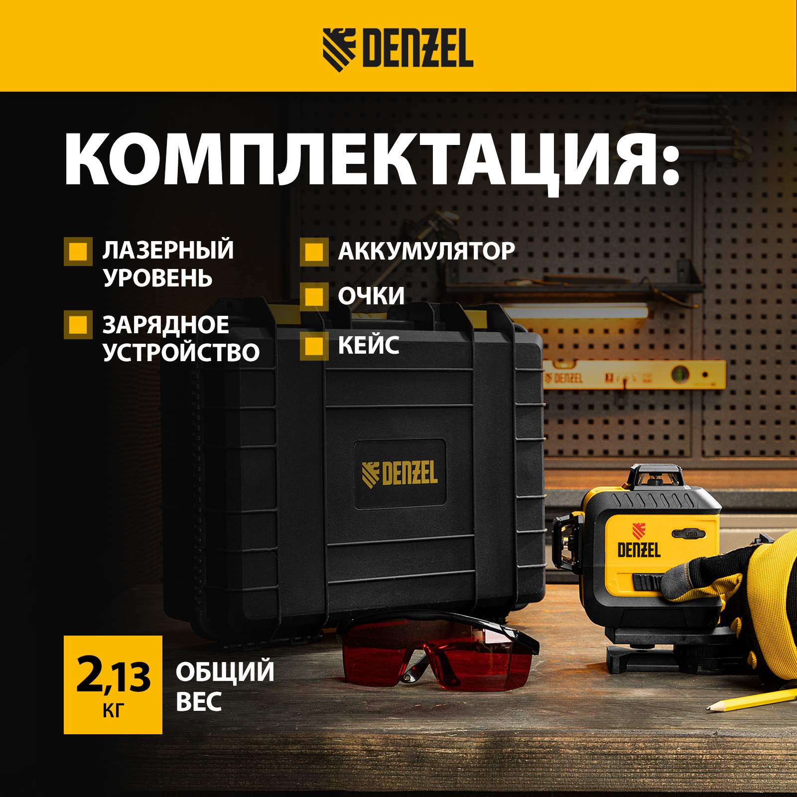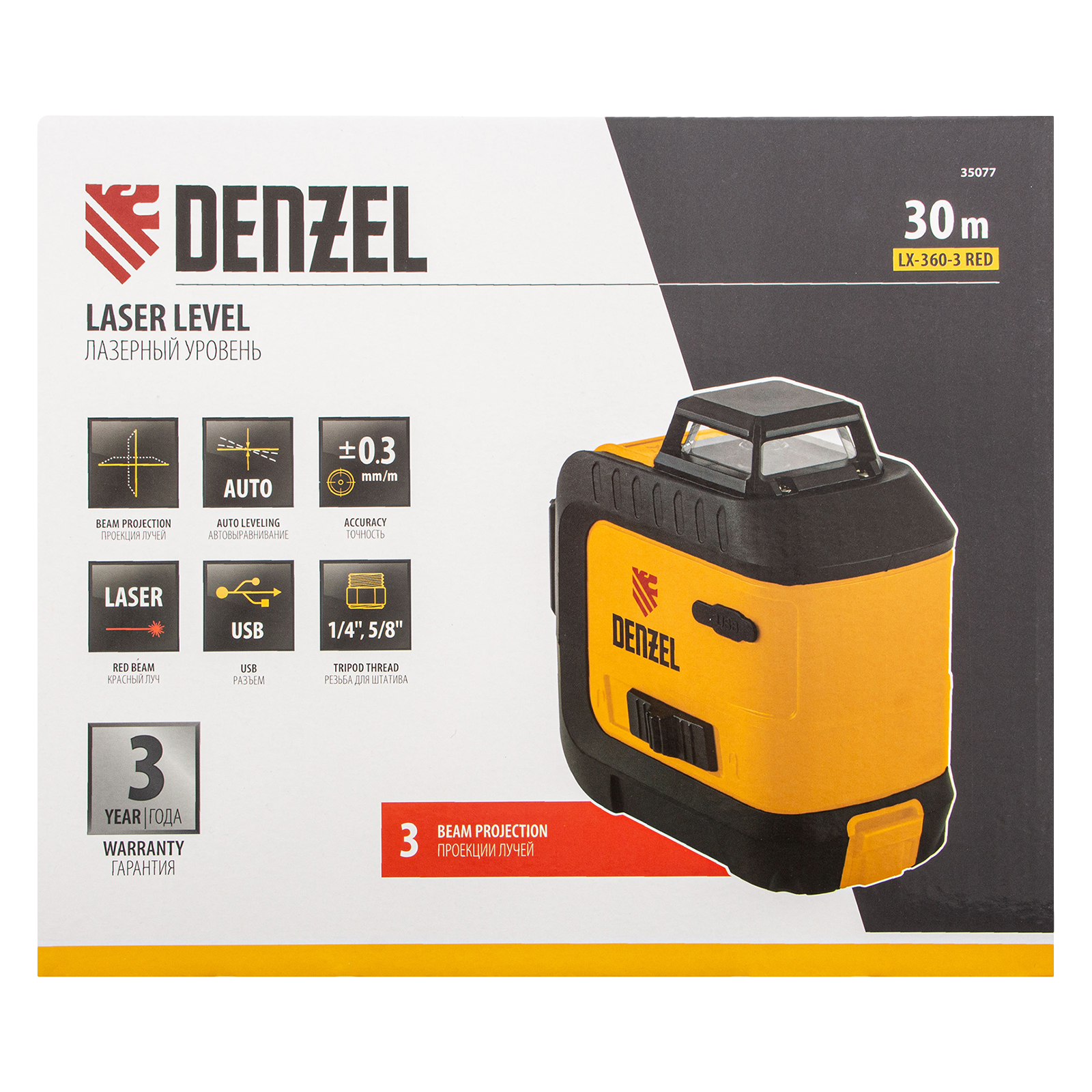 Мультипризменный лазерный уровень Denzel LX 360-3 Red 35077 с резьбой 5/8" под штатив работает от аккумулятора Li-Ion 2800 мАч и проецирует горизонтальные и вертикальные линии с охватом 360° на расстояние до 30 м при помощи лазерных лучей длиной 635 нм. Используется для разметки поверхностей в ходе строительных и отделочных работ.