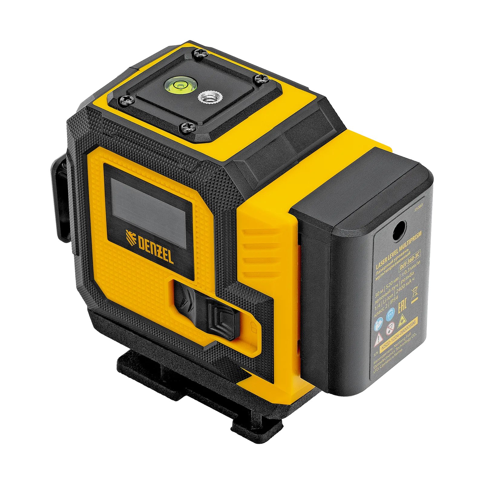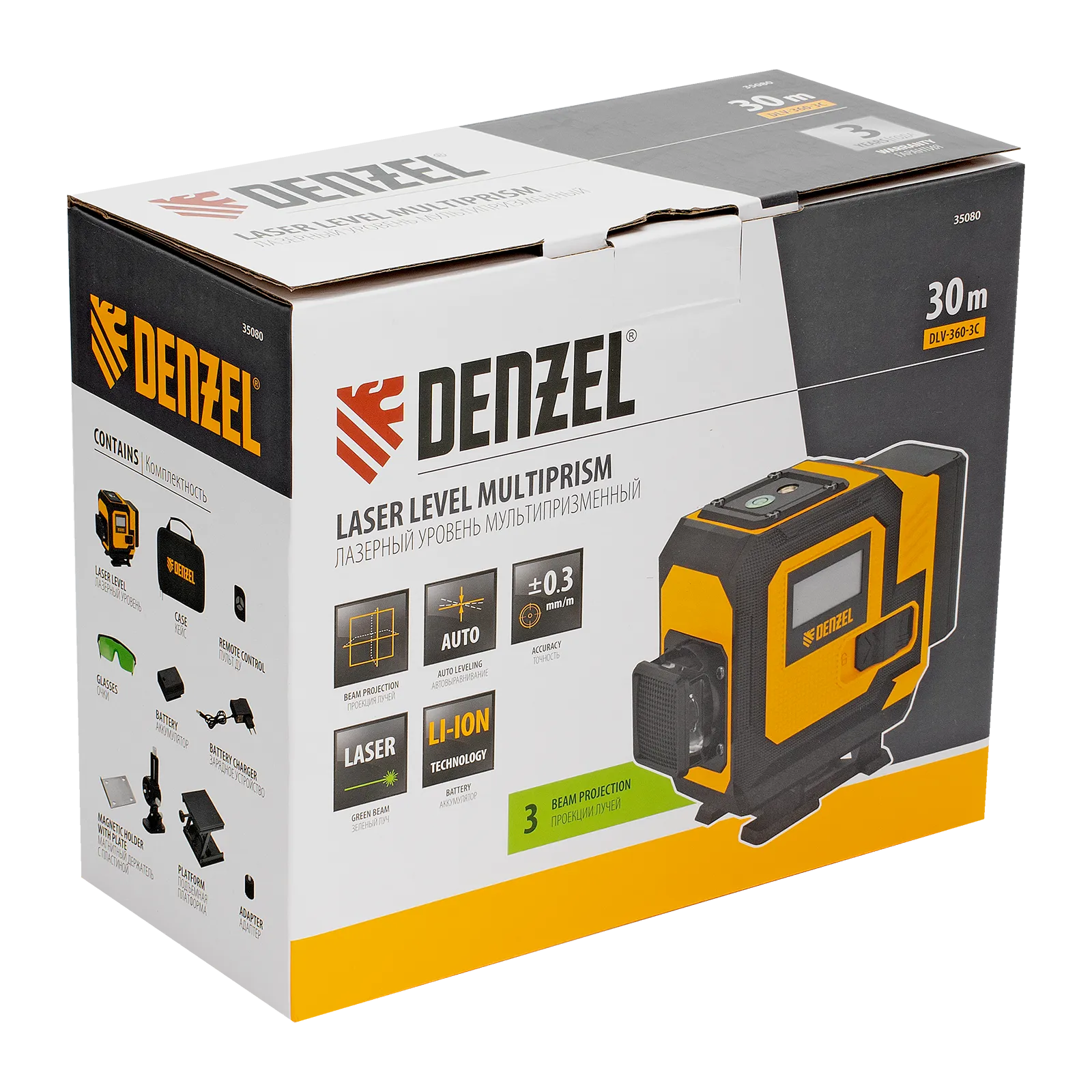 Мультипризменный лазерный уровень Denzel DLV-360-3C 35080 поставляется в кейсе, работает от аккумулятора Li-Ion емкостью 2,4 А·ч и проецирует горизонтальную и 2 вертикальные линии на расстояние до 30 м при помощи зеленых лучей длиной 520 нм. С его помощью можно нанести разметку и выровнять предметы относительно друг друга и земли с точностью до 0,3 мм/м. Угол развертки составляет 360°, что повышает удобство и эффективность работы. Прибор незаменим во время проведения строительных, ремонтных, отделочных работ, обустройства интерьера.