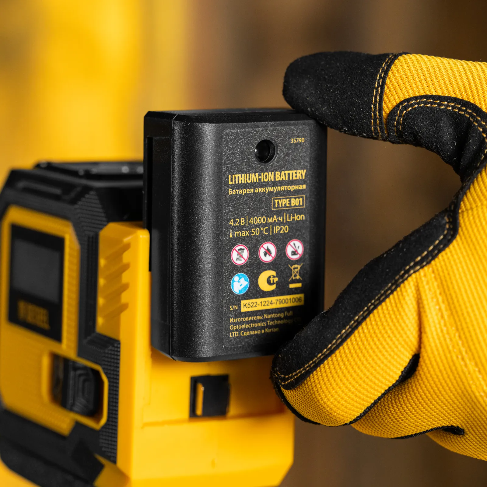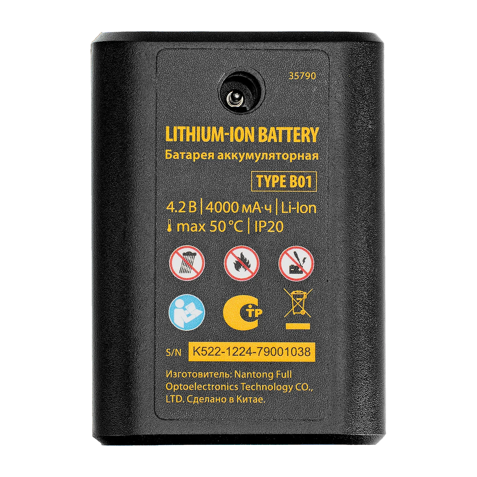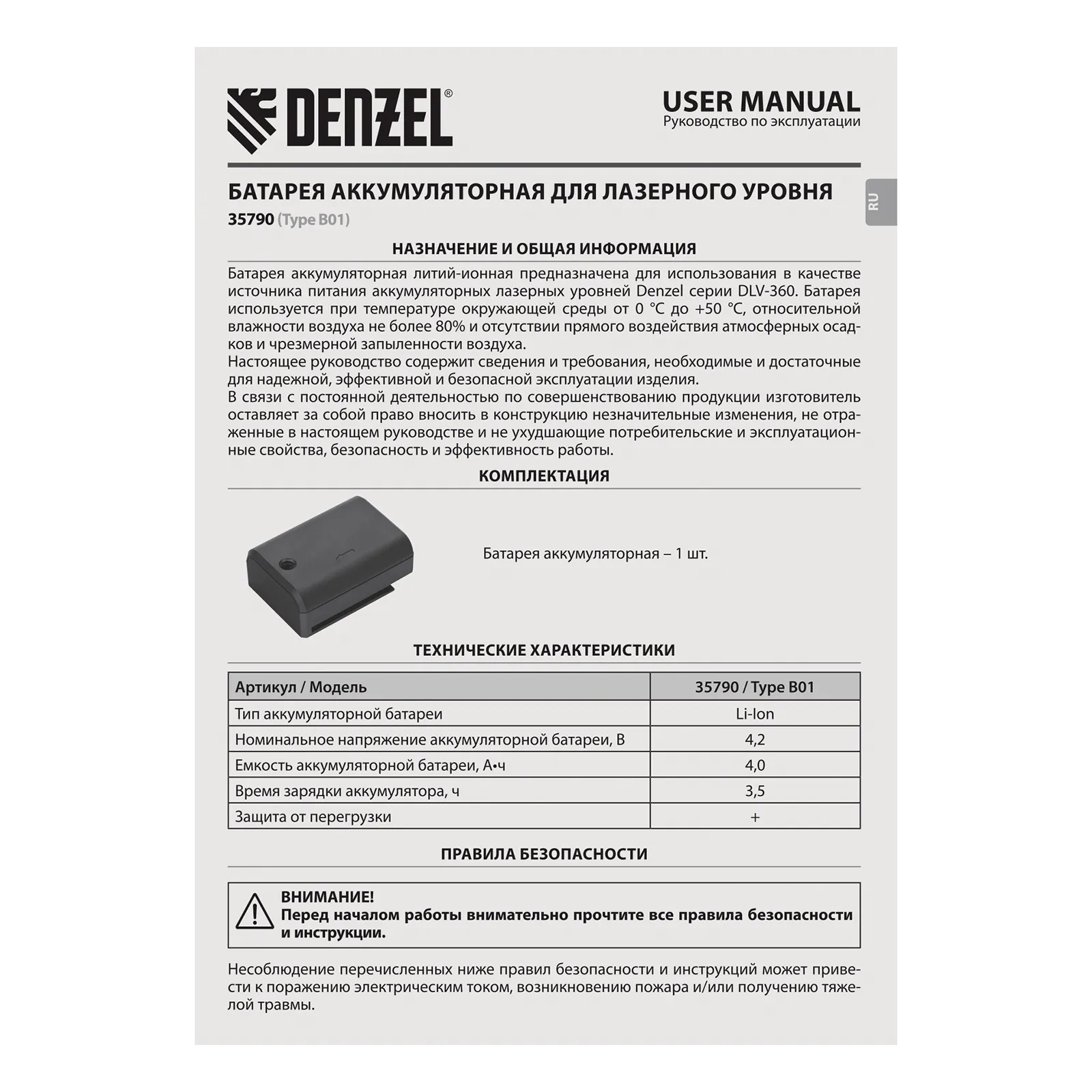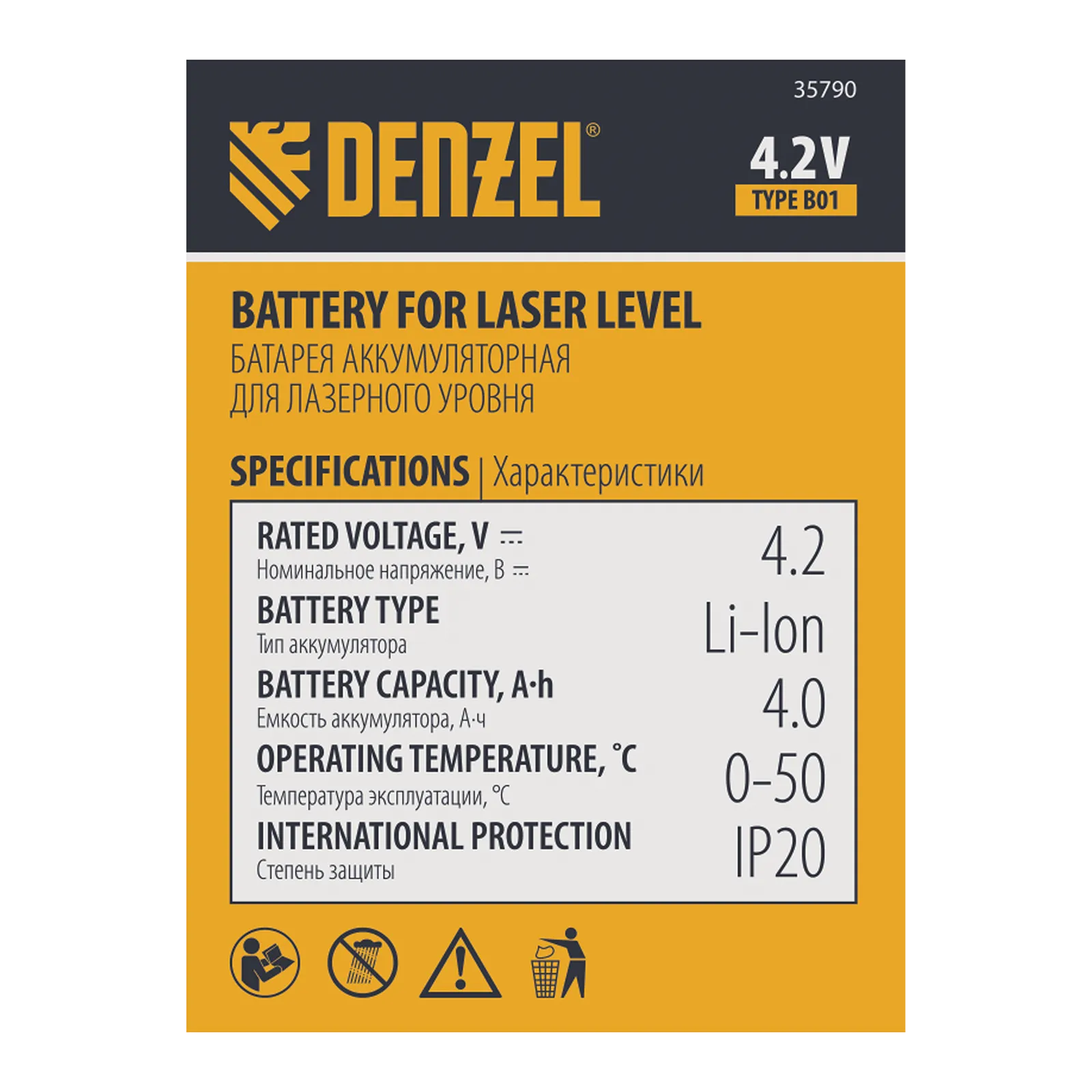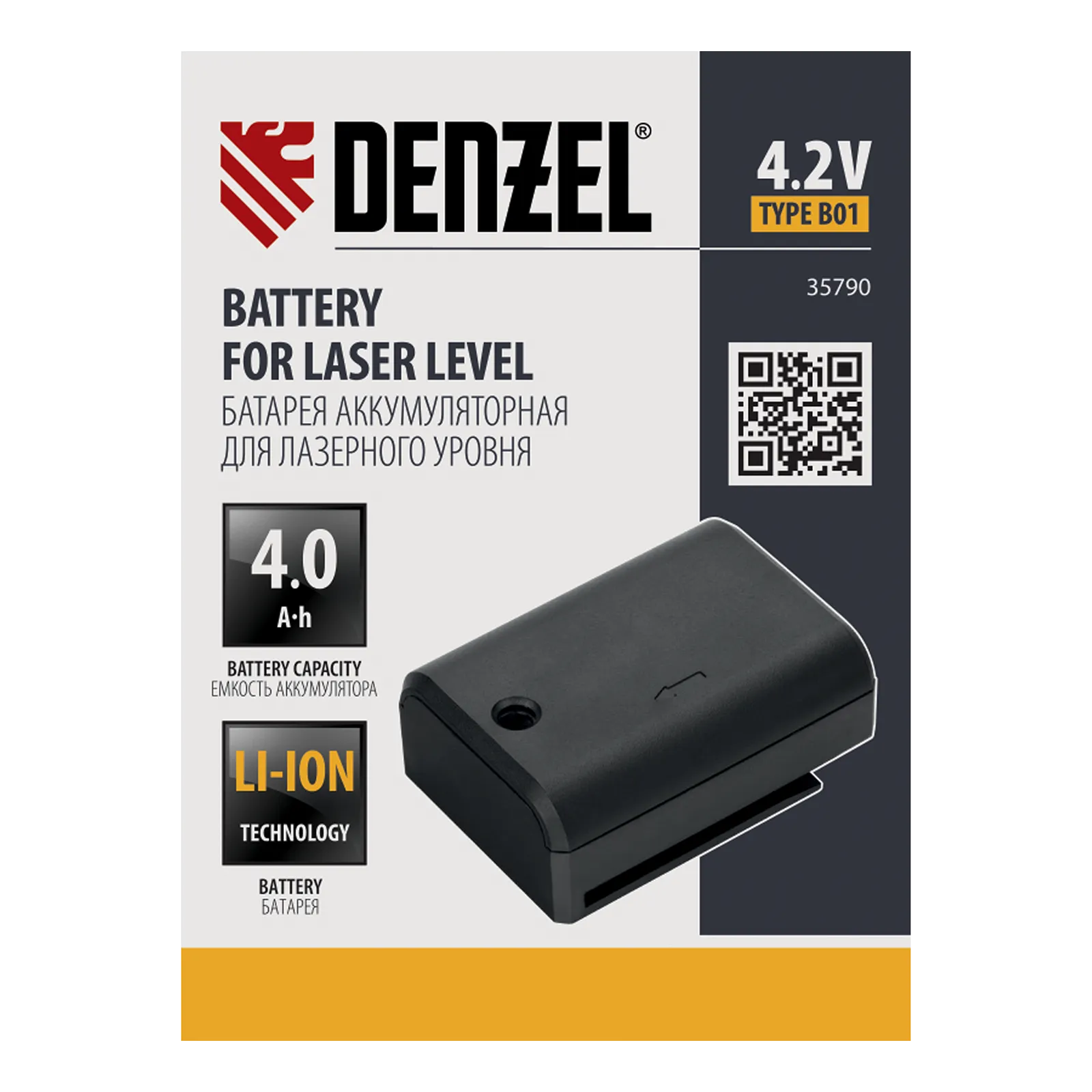 Аккумуляторная батарея Type B01 Denzel 35790 емкостью 4000 мА·ч поддерживает напряжение 4,2 В и предназначена для обеспечения функционирования лазерных уровней Denzel серии DLV-360. Легко снимается и устанавливается в отсек инструмента при помощи полозьев и специального разъема. Аккумулятор Li-Ion обеспечивает эффективную работу лазерного уровня в течение длительного времени.