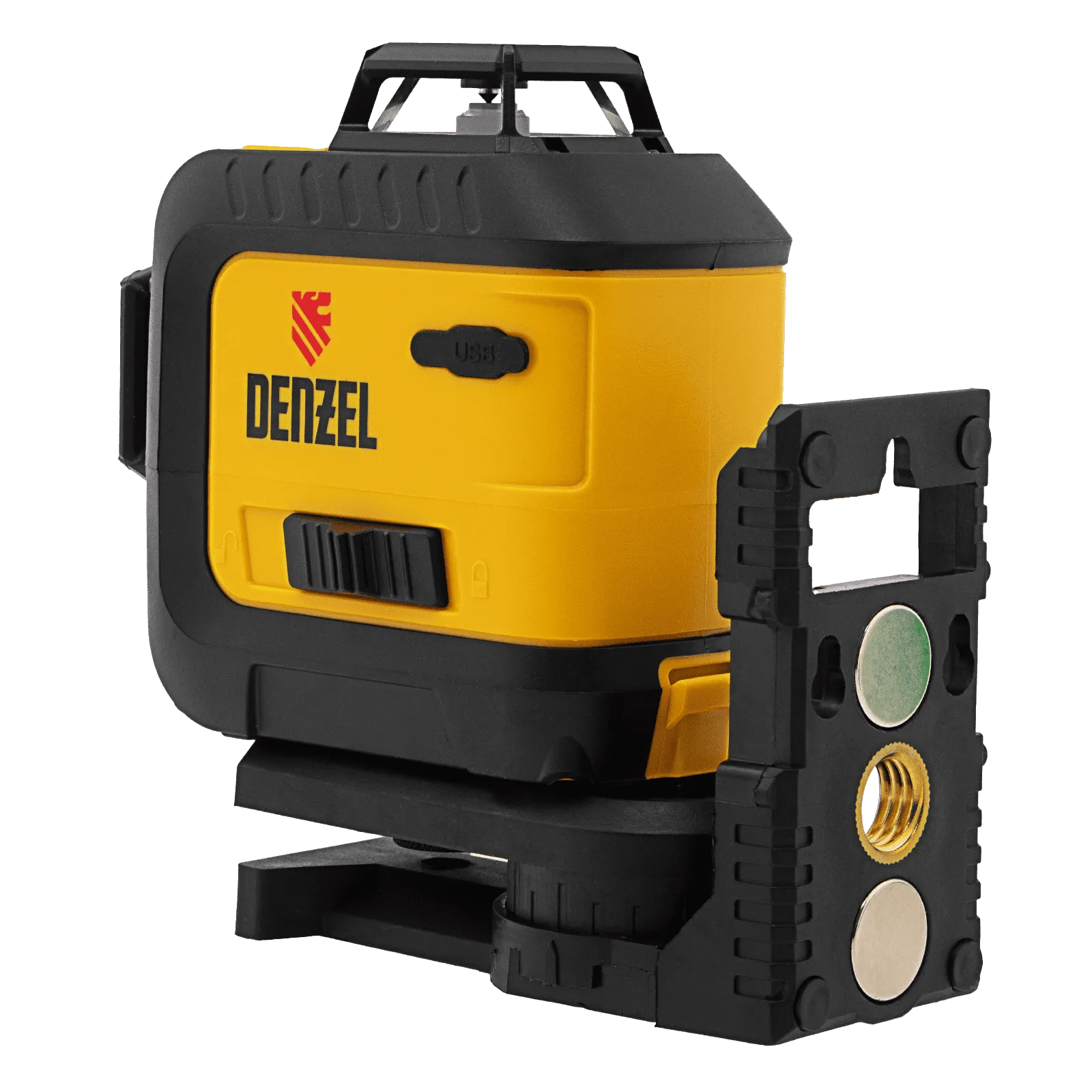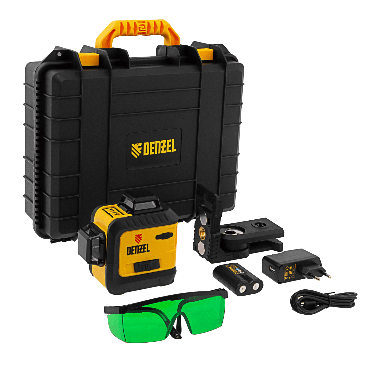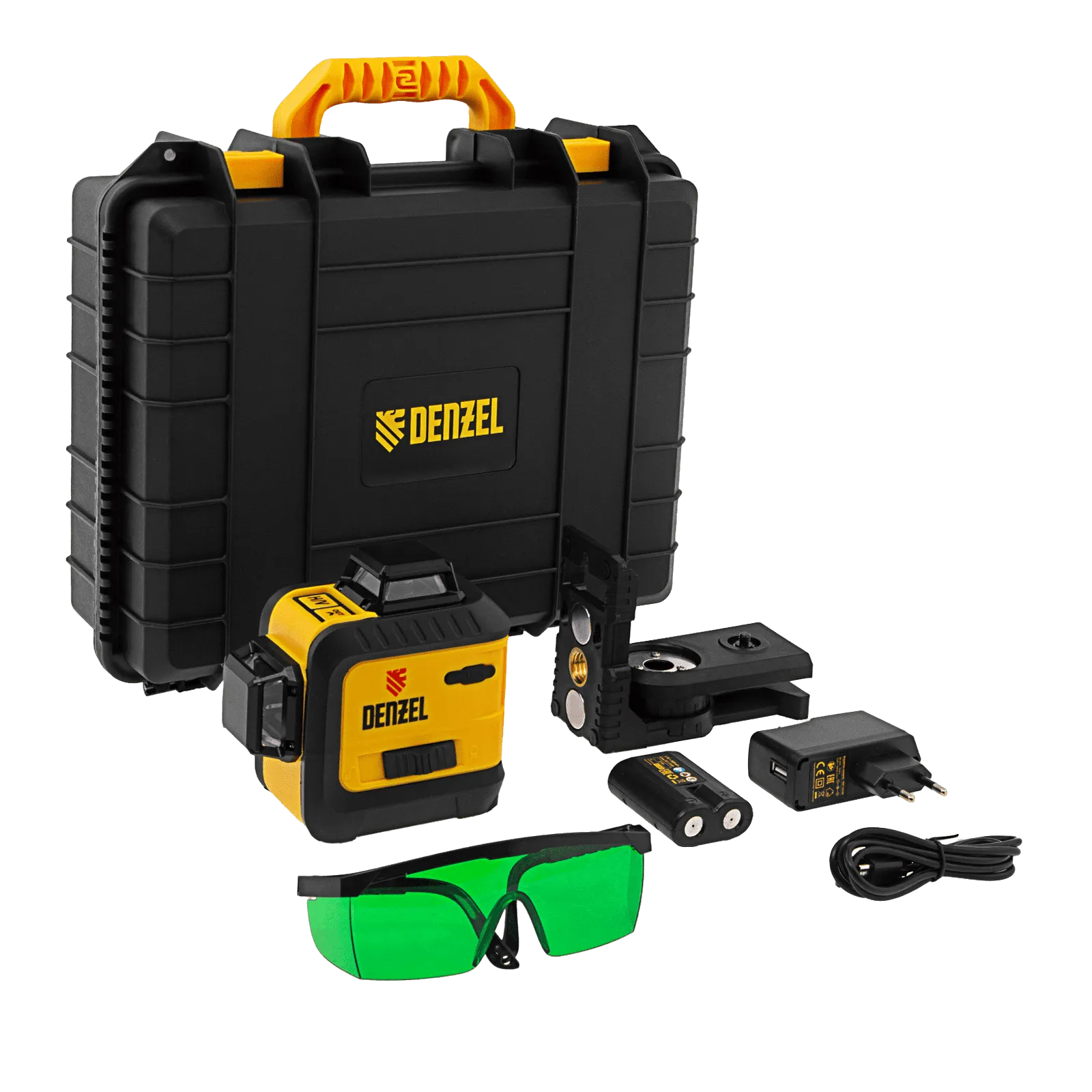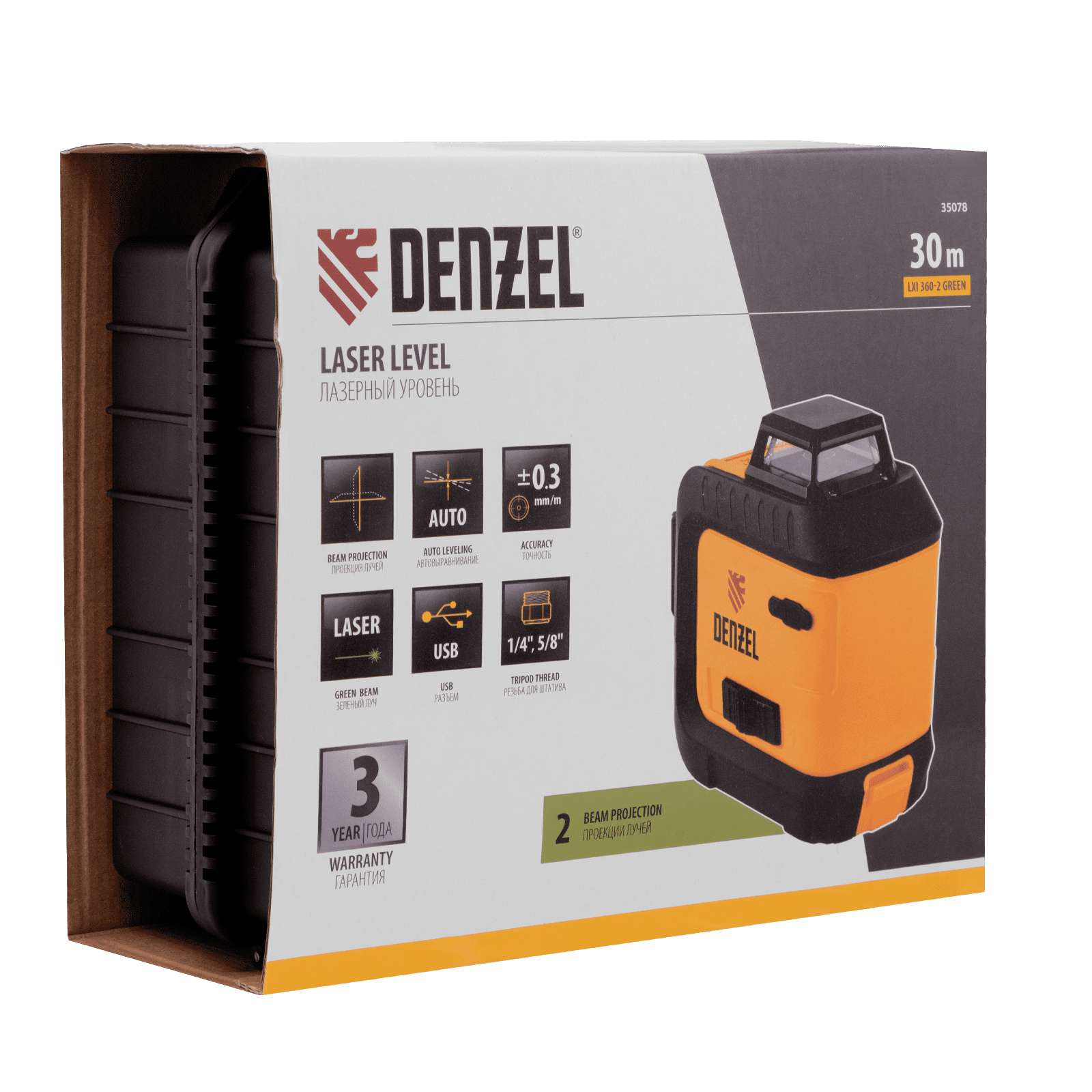 Мультипризменный лазерный уровень Denzel LXI 360-2 Green 35078 с резьбой под штатив 1/4″ проецирует 2 взаимно перпендикулярные линии с охватом в 360° на расстояние до 30 м при помощи зеленых лучей длиной 520 нм. Точность составляет ±0,3 мм/м. Уровень используется для построения разметки во время проведения отделочных и строительных работ. Подходит для площадки длиной до 60 м.