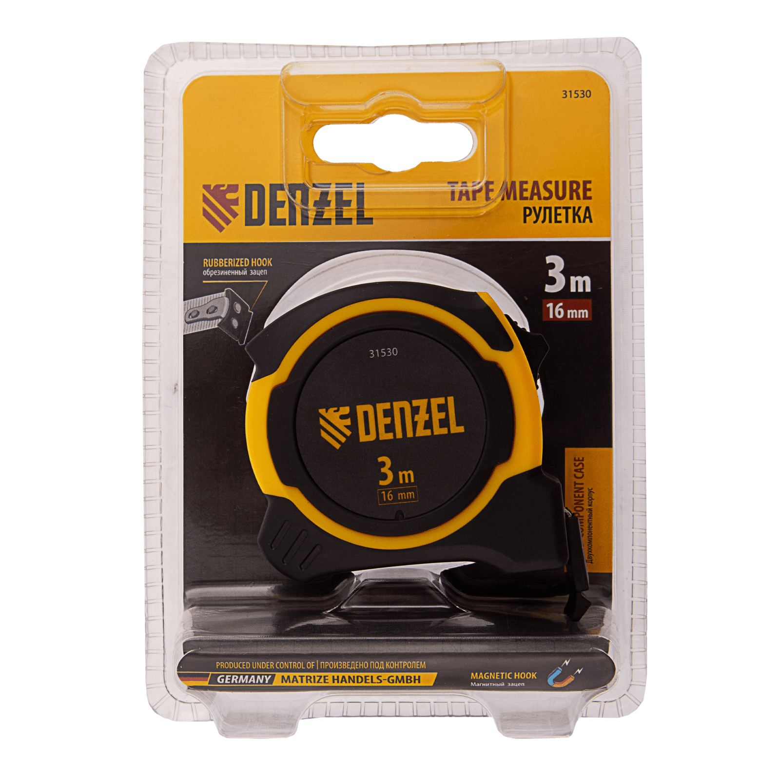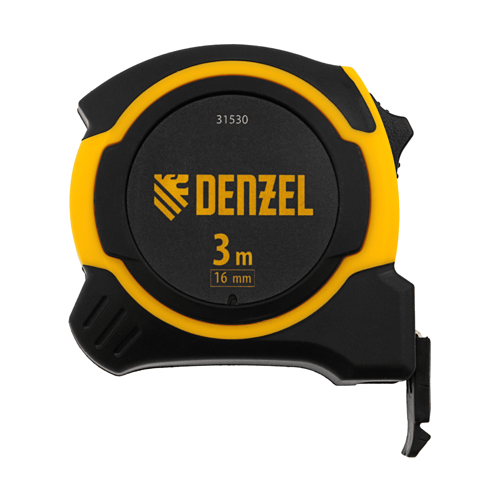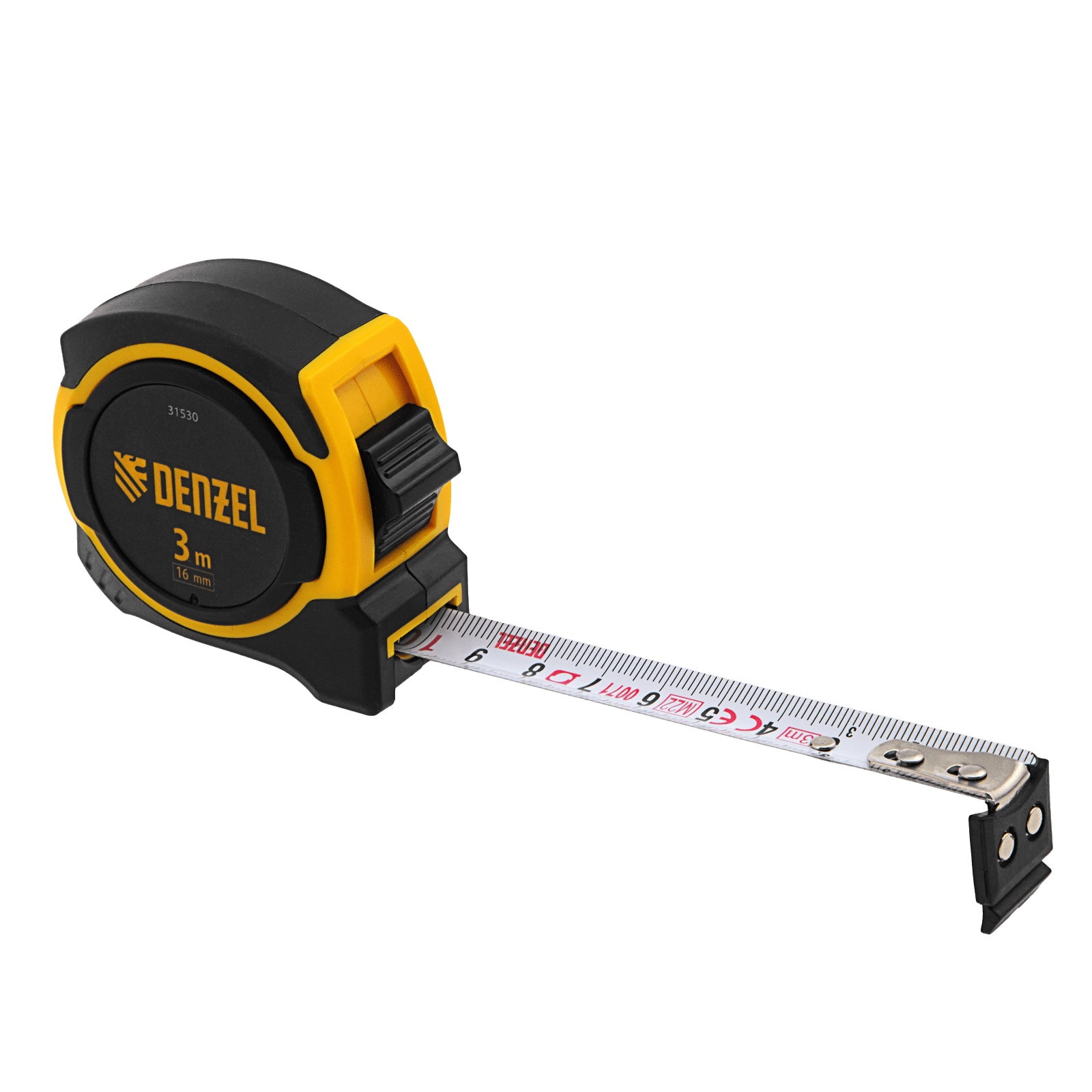 Рулетка Denzel 31530 в двухкомпонентном корпусе, с измерительной лентой шириной 16 мм и магнитным обрезиненным зацепом, позволяет определять размеры предметов и расстояния до 3 м. Рулетка будет полезна при проведении строительных, ремонтных и различных бытовых работ.