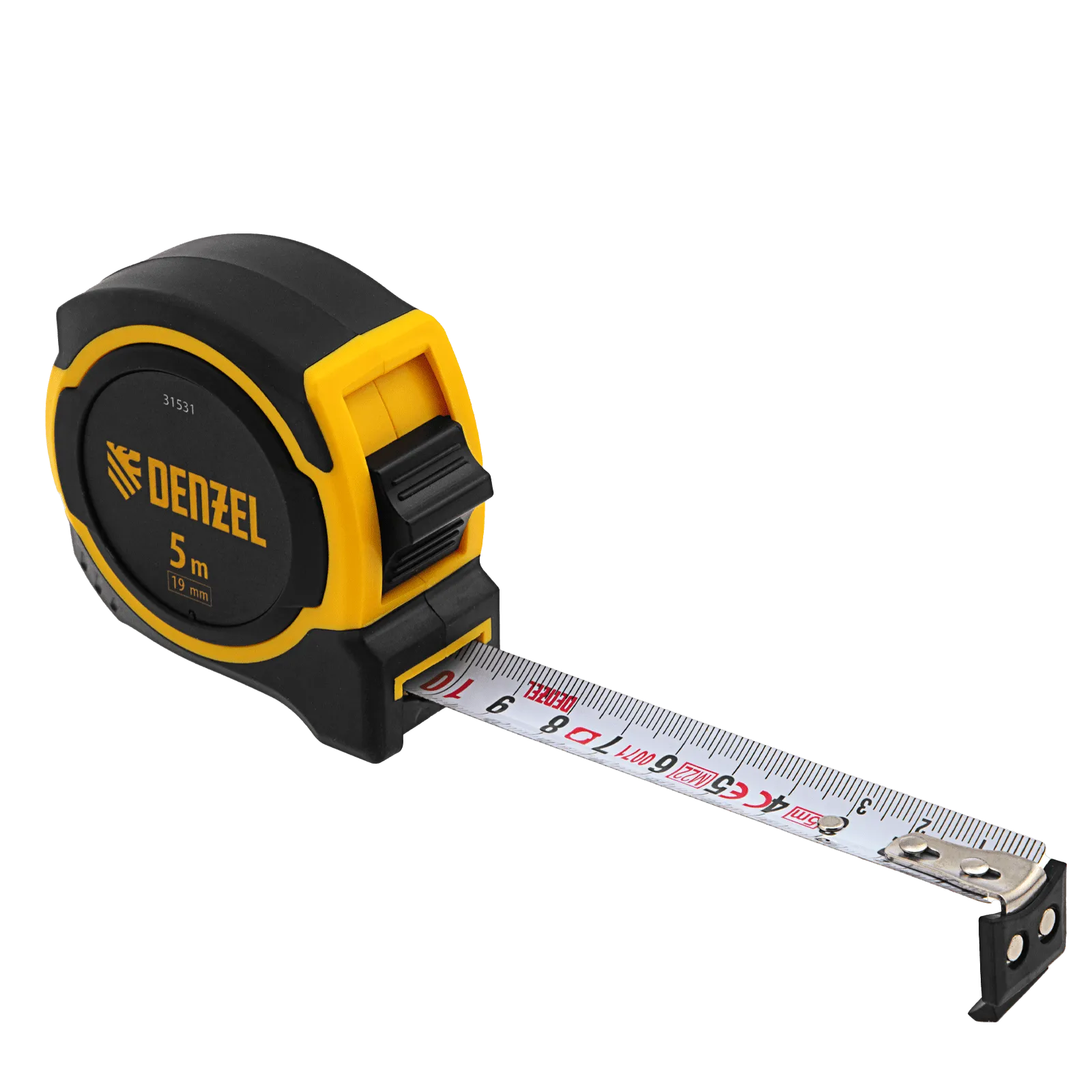Рулетка Denzel 31531 в двухкомпонентном корпусе, с измерительной лентой шириной 16 мм и магнитным обрезиненным зацепом, позволяет определять размеры предметов и расстояния до 5 м. Рулетка будет полезна при проведении строительных, ремонтных и различных бытовых работ.