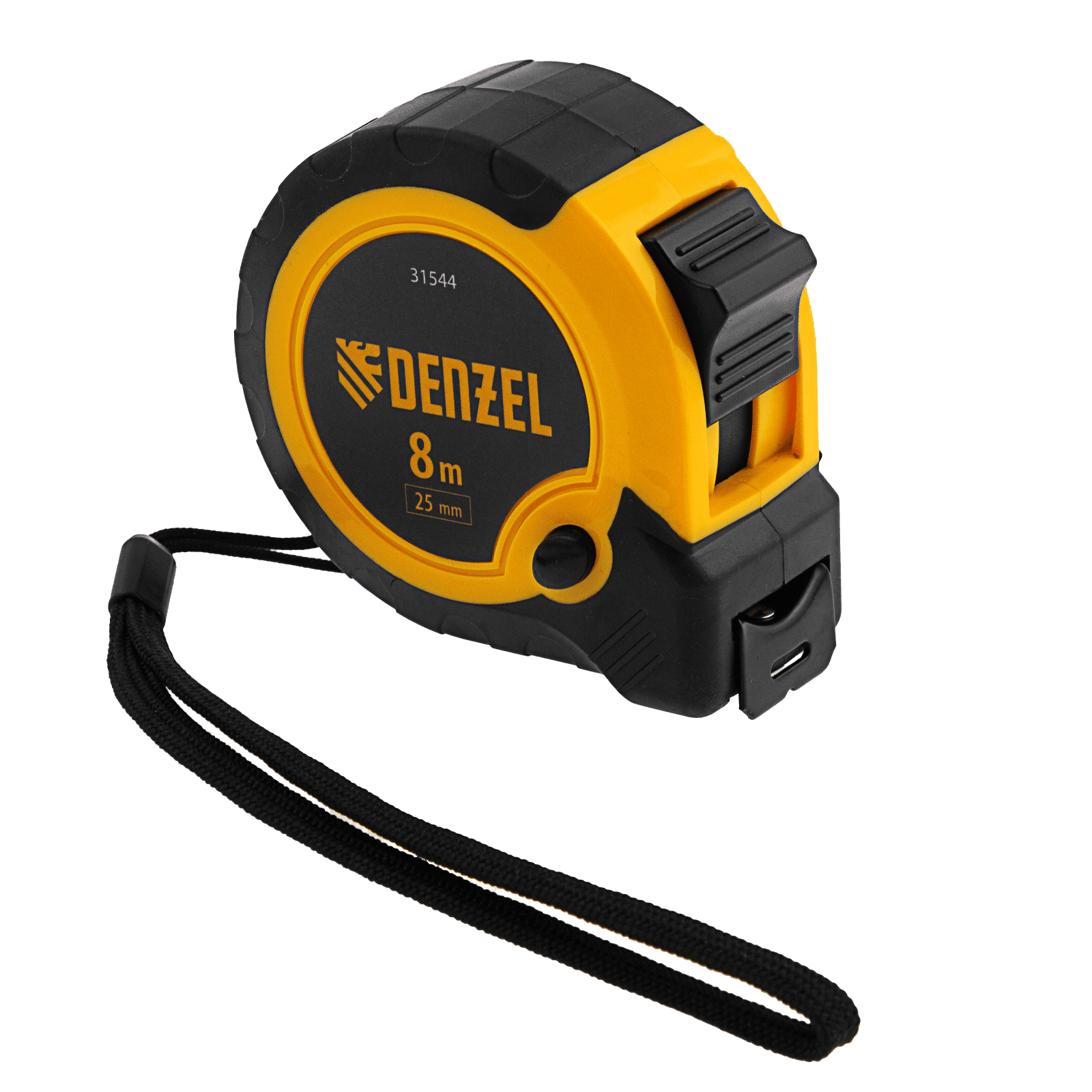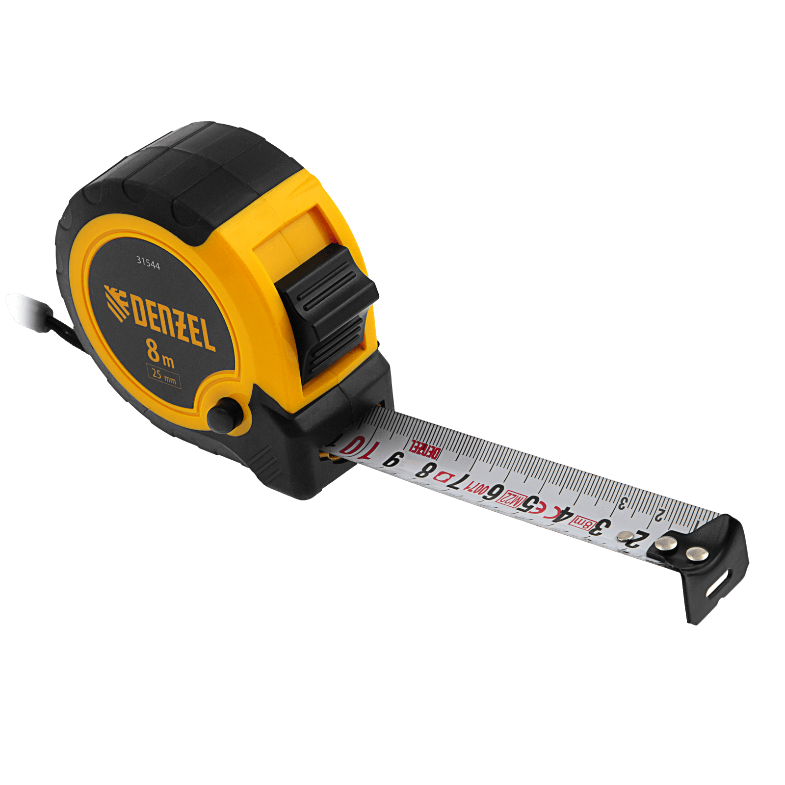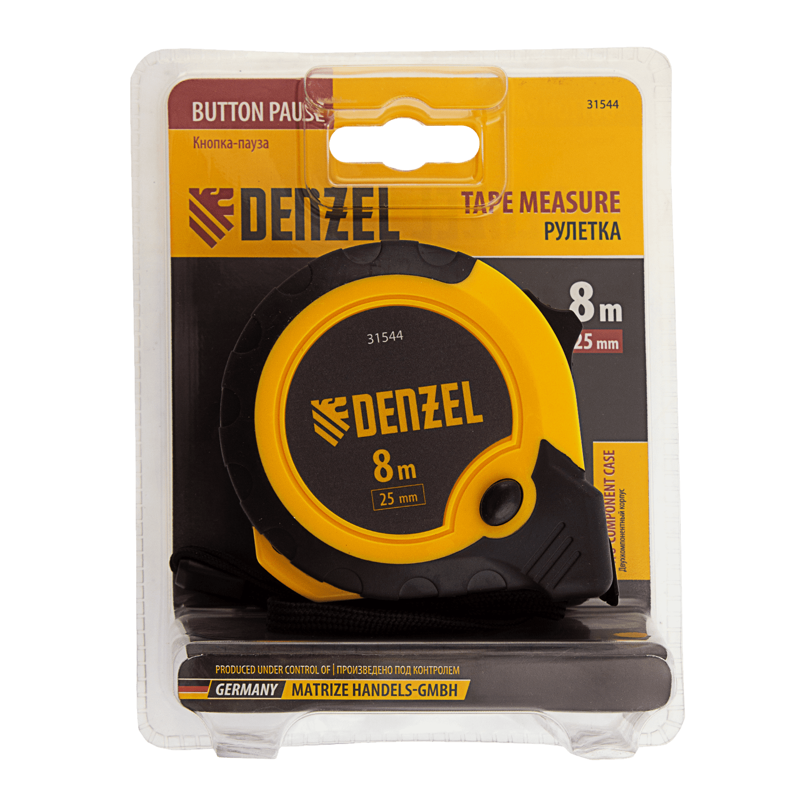 Рулетка Denzel 31544 в двухкомпонентном корпусе, с кнопкой-паузой, с полотном шириной 25 мм и длиной 8 м, используется для измерения расстояний и размеров предметов. Удобна для работы в труднодоступных местах. Стальная лента с эмалевым покрытием и защитной пластиной в месте крепления зацепа рассчитана на долгий срок службы. Рулетка будет полезна во время строительства и ремонта, а также пригодится в быту.