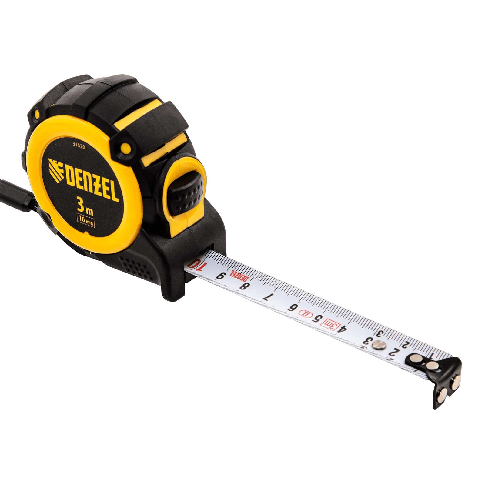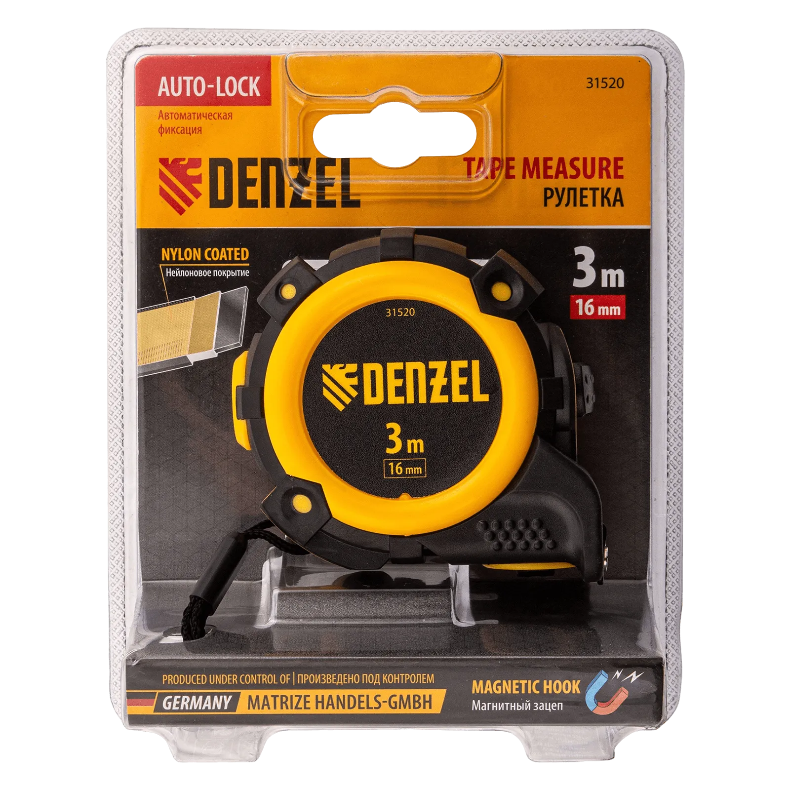 Рулетка Denzel 31520 с автоматической фиксацией полотна размером 3 м х 16 мм, с нейлоновым покрытием, магнитным зацепом и двухсторонней разметкой, предназначена для измерения расстояний и определения габаритов различных предметов. Лента автоматически фиксируется в вытянутом положении, что упрощает работу. Рулетка будет полезна во время строительных и ремонтных работ.