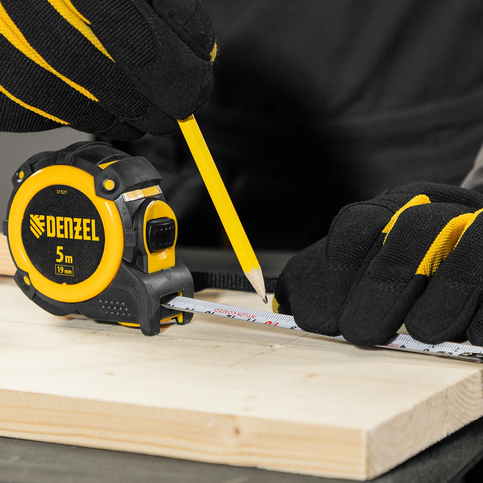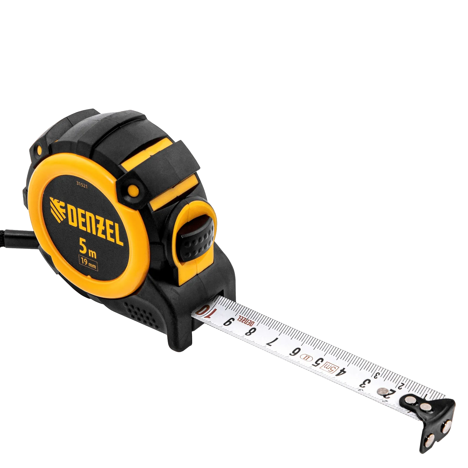 Рулетка Denzel 31521 с автоматической фиксацией полотна размером 5 м х 19 мм, с нейлоновым покрытием, магнитным зацепом и двухсторонней разметкой, предназначена для измерения расстояний и определения габаритов различных предметов. Лента автоматически фиксируется в вытянутом положении, что упрощает работу. Рулетка будет полезна во время строительных и ремонтных работ.