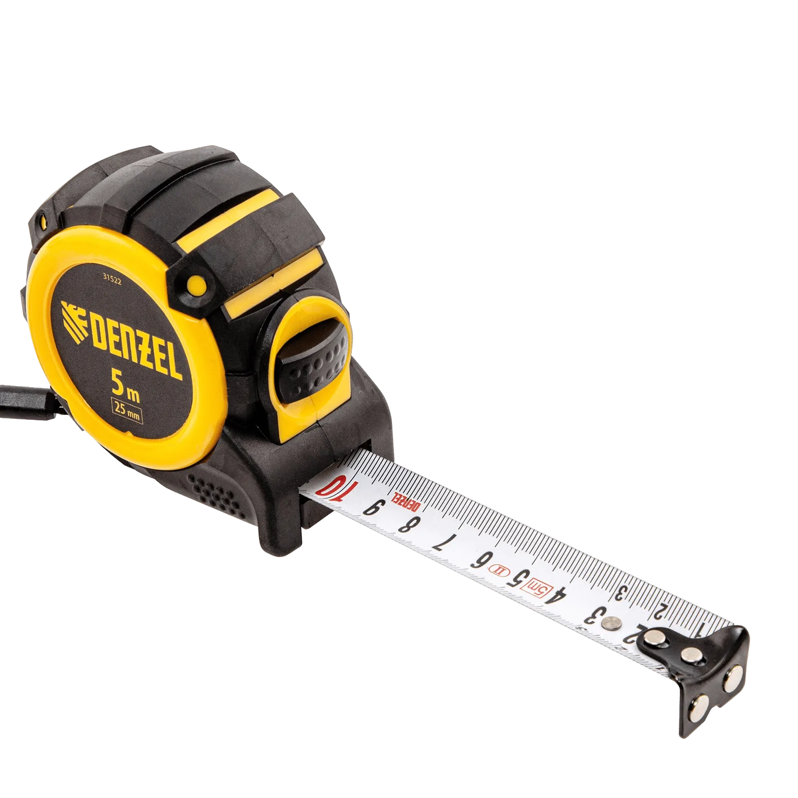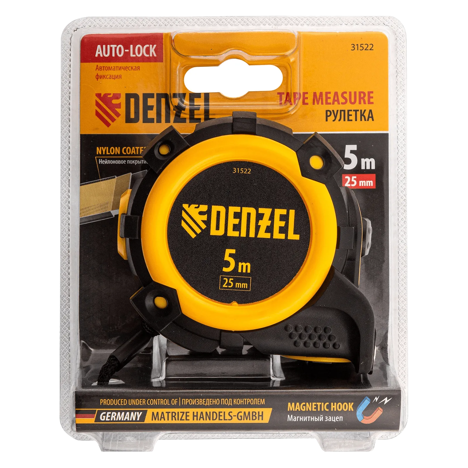 Рулетка Denzel 31522 с автоматической фиксацией полотна размером 5 м х 25 мм, с нейлоновым покрытием, магнитным зацепом и двухсторонней разметкой, предназначена для измерения расстояний и определения габаритов различных предметов. Лента автоматически фиксируется в вытянутом положении, что упрощает работу. Рулетка удобна для работы в труднодоступных местах, будет полезна во время строительных и ремонтных работ.