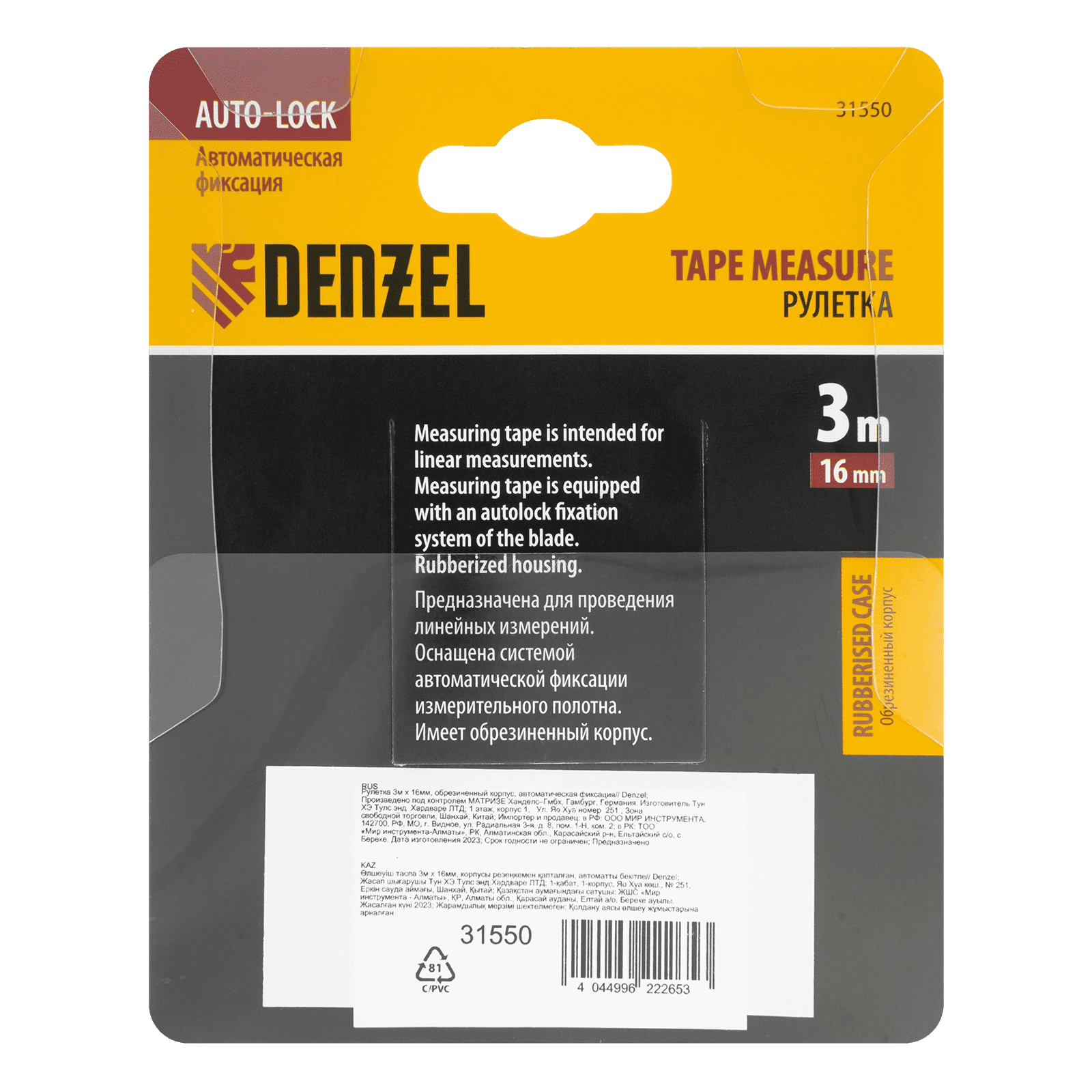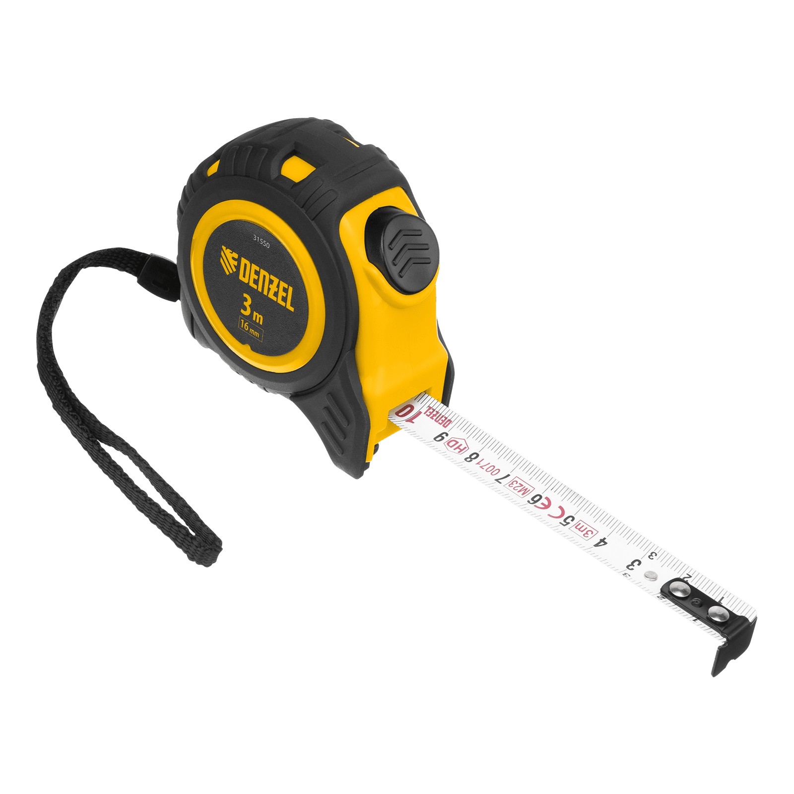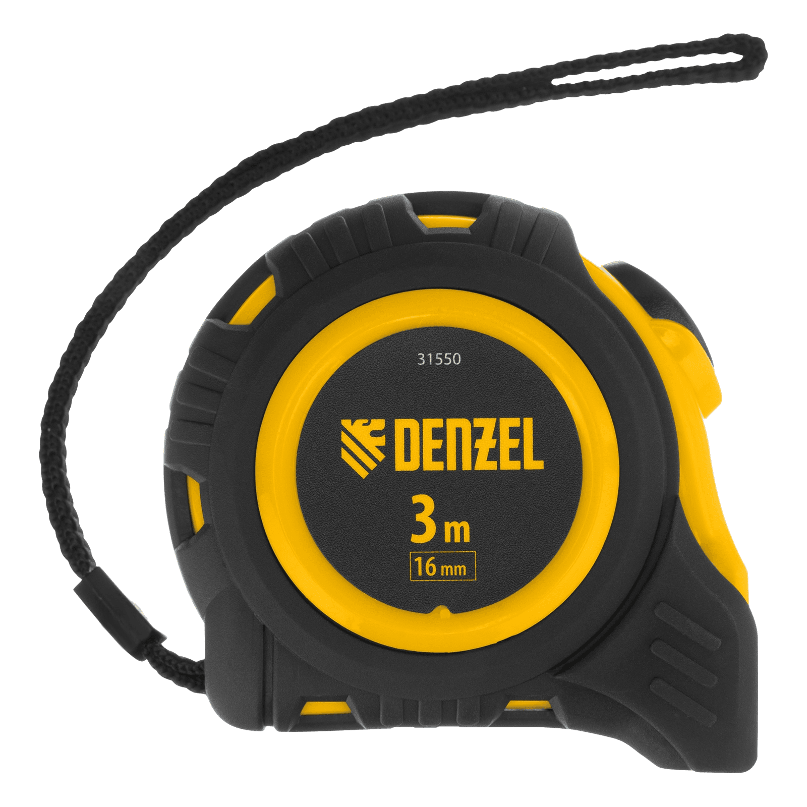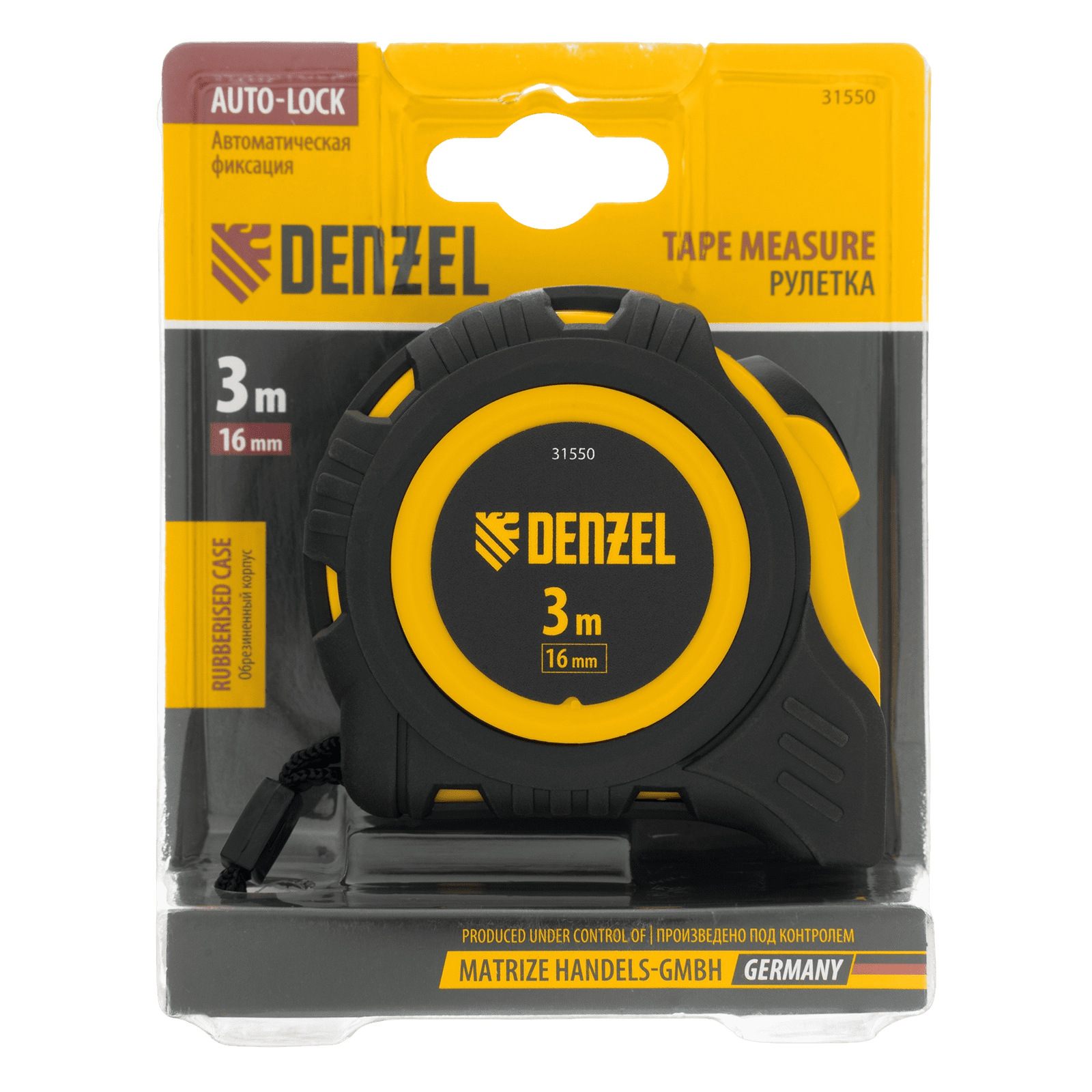 Рулетка Denzel 31550 в обрезиненном корпусе, с автоматической фиксацией, с полотном шириной 16 мм и длиной 3 м, используется для измерения расстояний и размеров предметов. Стальная лента с эмалевым покрытием и защитной пластиной в месте крепления зацепа рассчитана на долгий срок службы. Рулетка будет полезна во время строительства и ремонта, а также пригодится в быту.