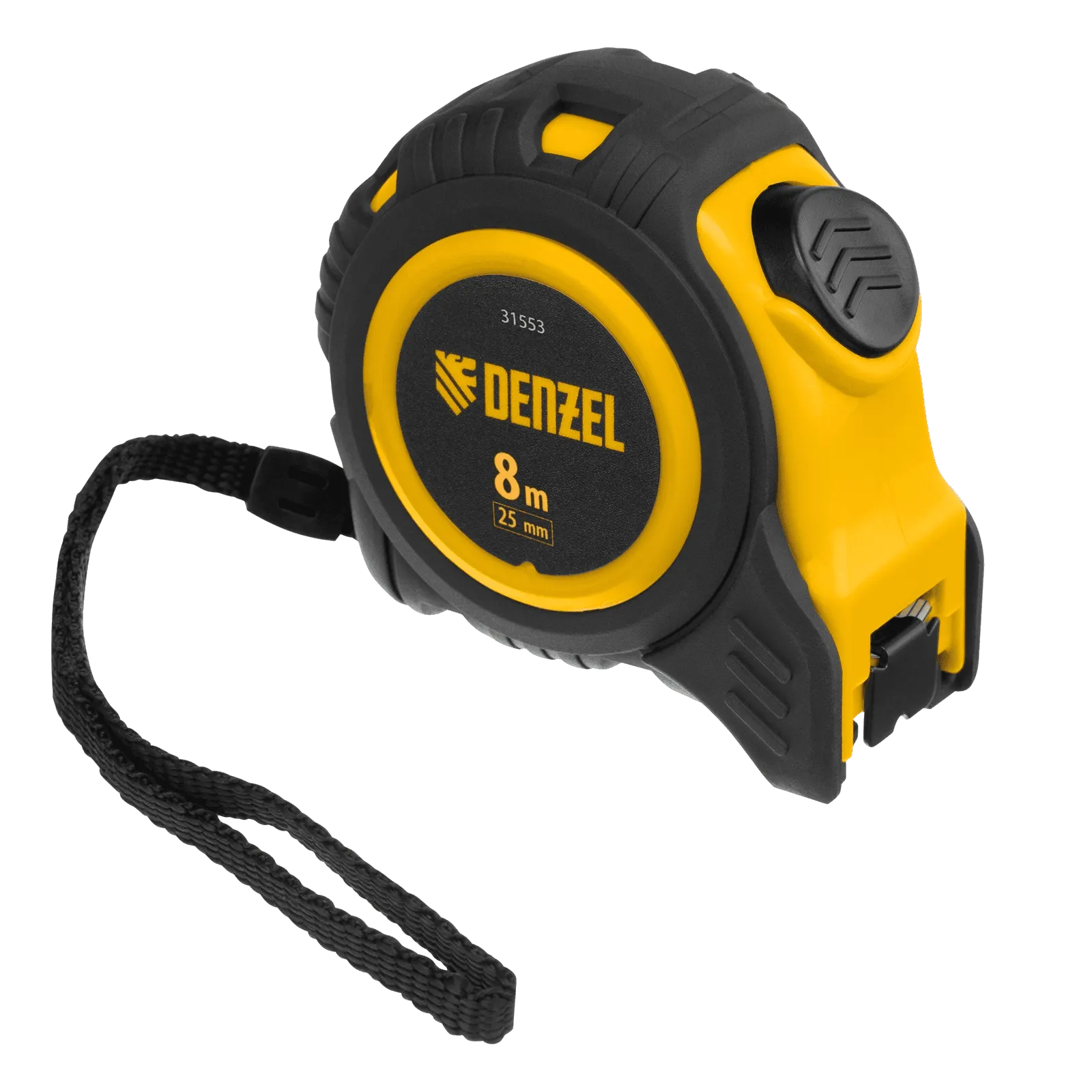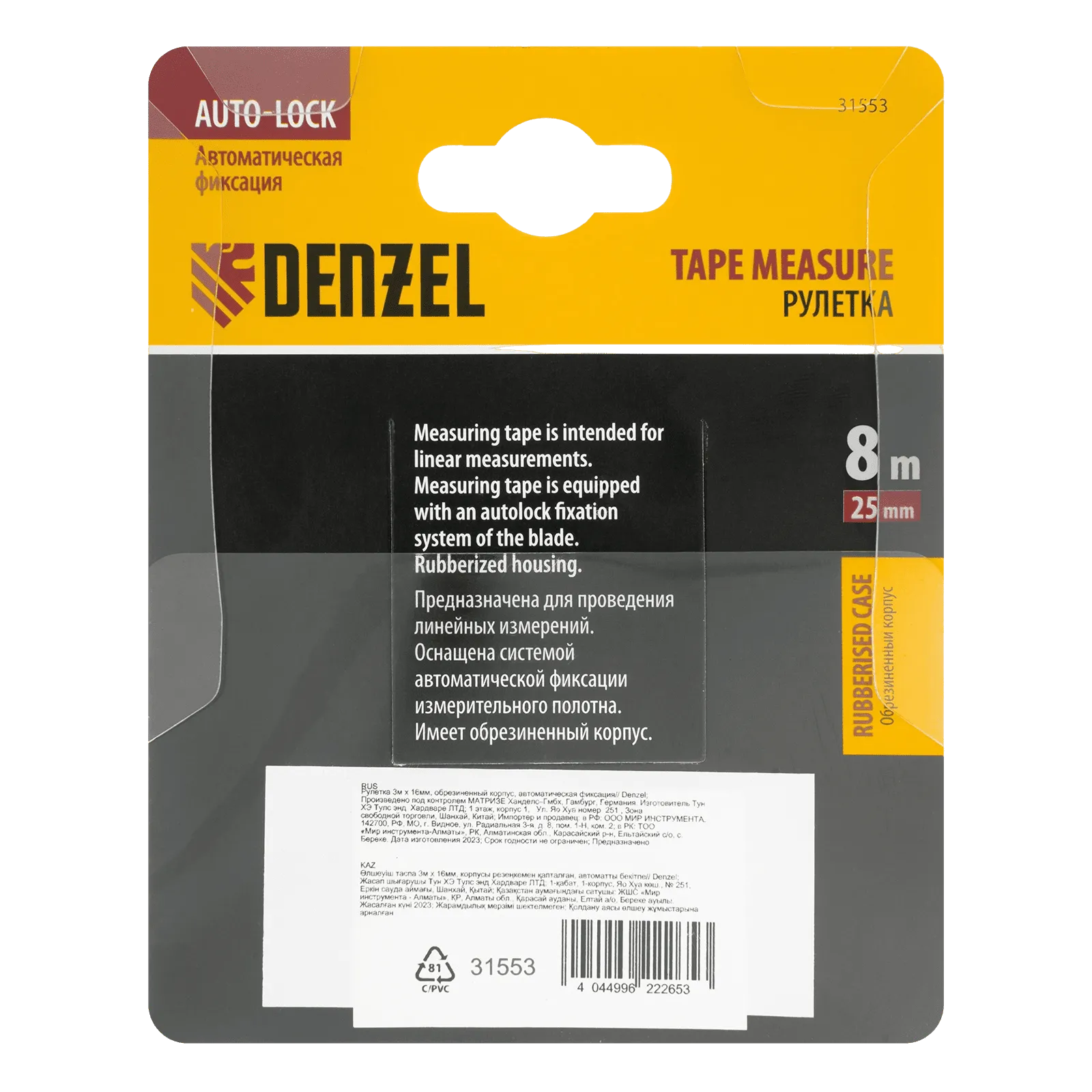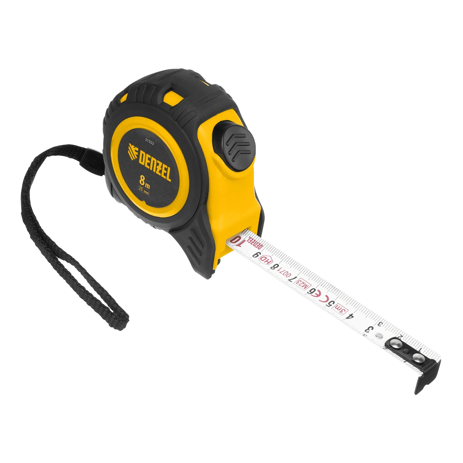 Рулетка Denzel 31553 в обрезиненном корпусе, с автоматической фиксацией, с полотном шириной 25 мм и длиной 8 м, используется для измерения расстояний и размеров предметов. Стальная лента с эмалевым покрытием и защитной пластиной в месте крепления зацепа рассчитана на долгий срок службы. Рулетка будет полезна во время строительства и ремонта, а также пригодится в быту.